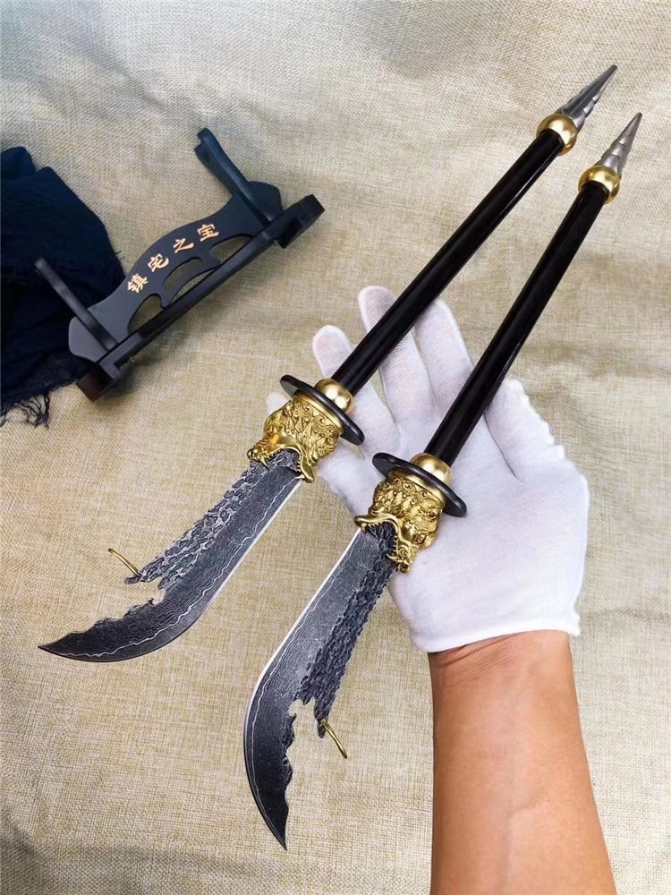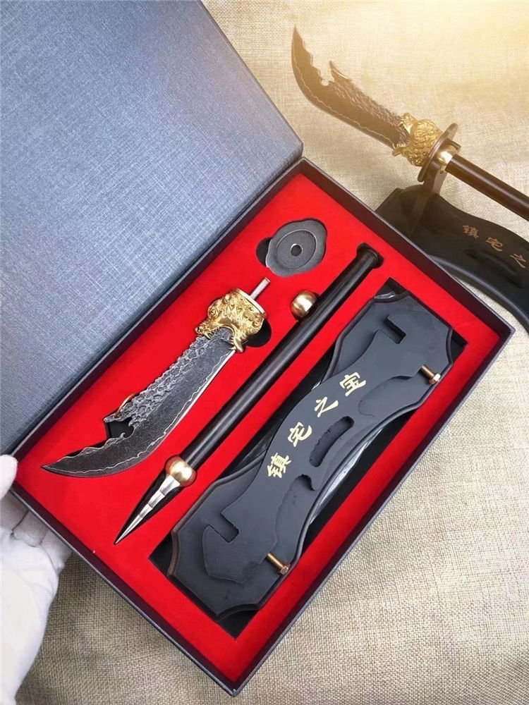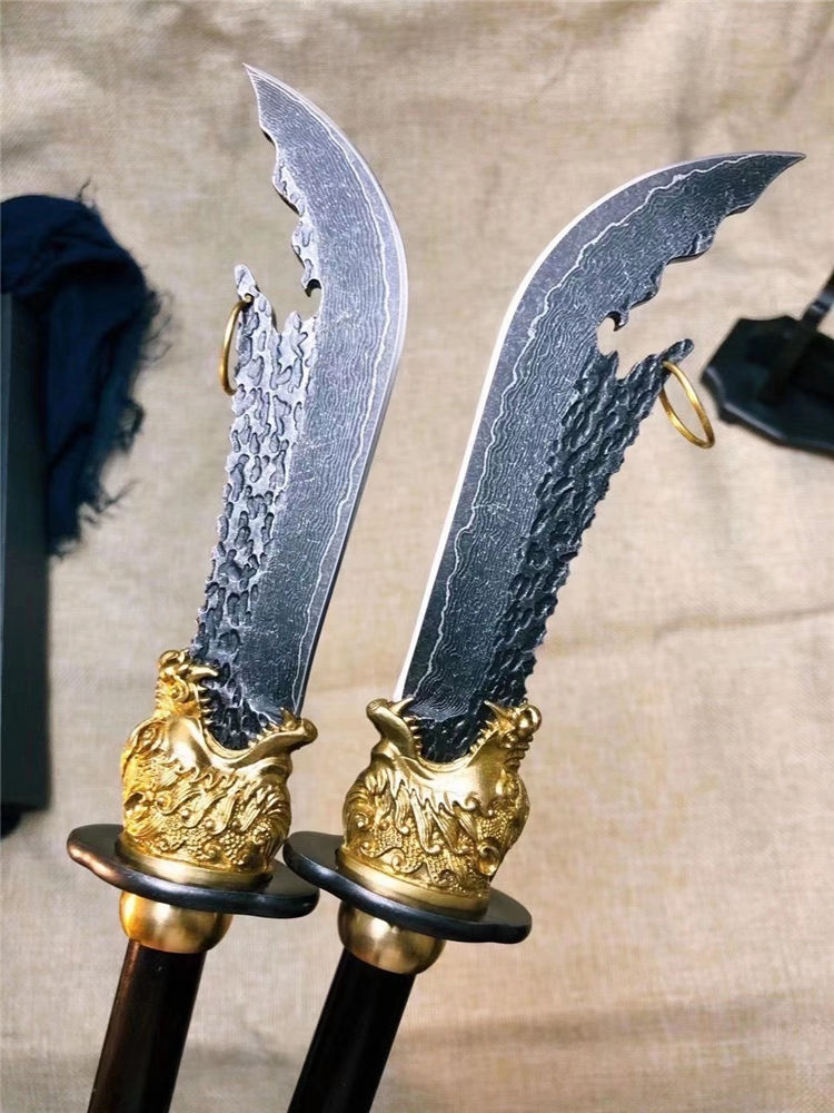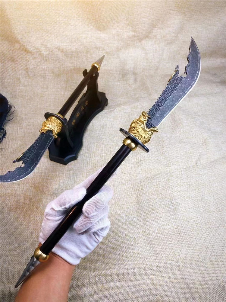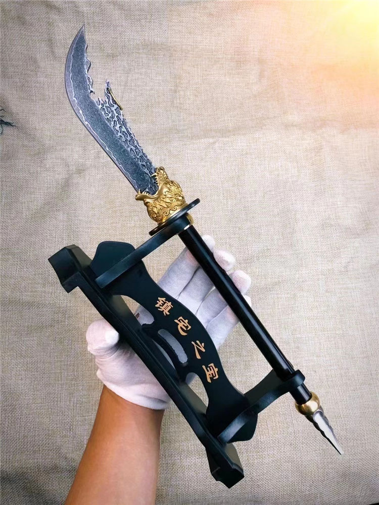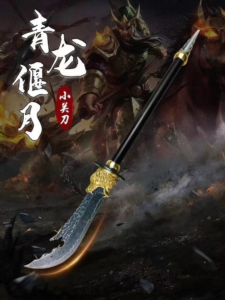 大马士革青龙偃月关刀 总长:42cm 刃长:13cm 手柄:29.5cm 刃宽:3.6cm 刃厚度:4.1MM 刃材:进口锻造大马士革钢90层 表面效果:沧桑复古工艺 硬度:60HRC 热处理方式:真空热处理 柄材:纯黄铜“御龍头”配件+黄铜圈+名贵黑檀木+白钢尾坠,内置结构可自由拆装 包装:高级礼品盒+镇宅之宝木座架子