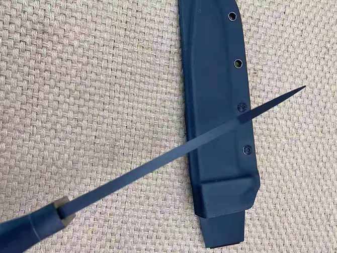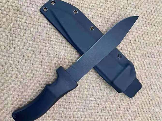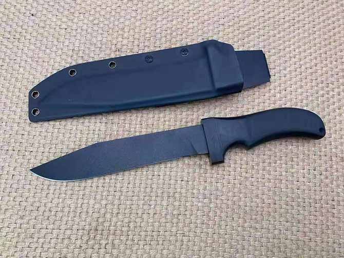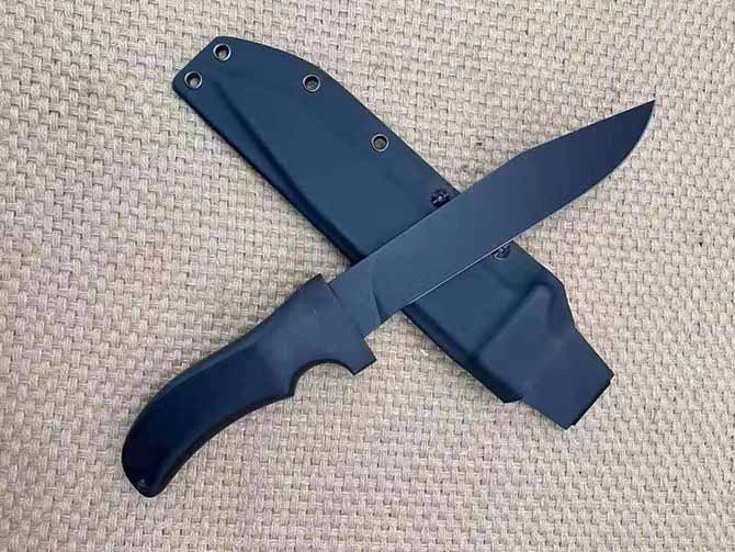 2021定制版大疯狗直刀 刃材:O1钢 厚度:6.5mm; 表面:特氟龙防刮涂层 结构:一体龙骨 全长:320mm 刃长:165mm 刃厚:6.5mm 热处理:三刃热处理 硬度:60-61HRC 手柄:黑色G10 配:2.0厚板进口K鞘带钢夹
