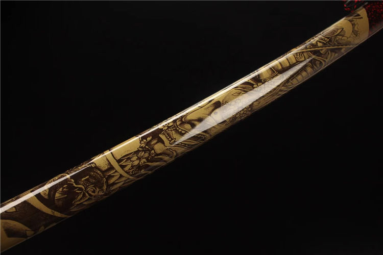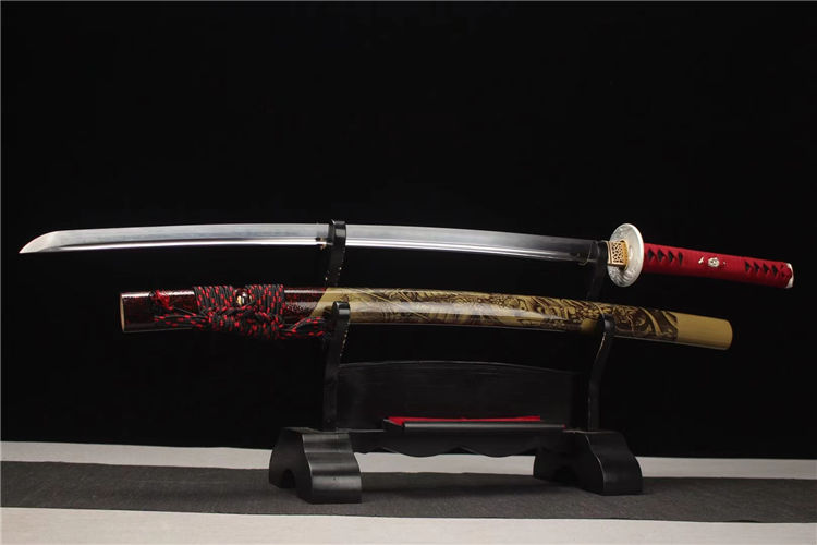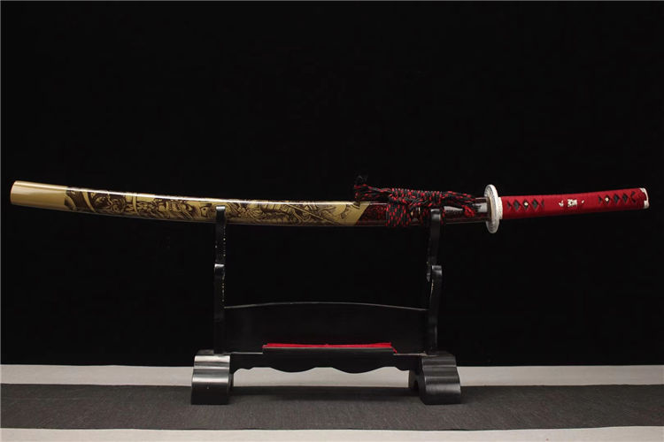 海兽武士刀 全长:103cm 柄长:27cm 刃长:72cm 宽:3.2cm 厚:0.75cm 重:1.3kg 除鞘:1kg左右 刃材:高锰钢 装具:合金装具 鞘材:油漆鞘 适合:收藏防身情侣配送乔迁送礼武术健身精美摆设 赠品:锦盒、刀油 工艺:刀身千锤百炼、经打胚、热锻、铲、锉、磨、热处理(淬火)回火、初修、精修、等龙泉古法数十道手工制作而成