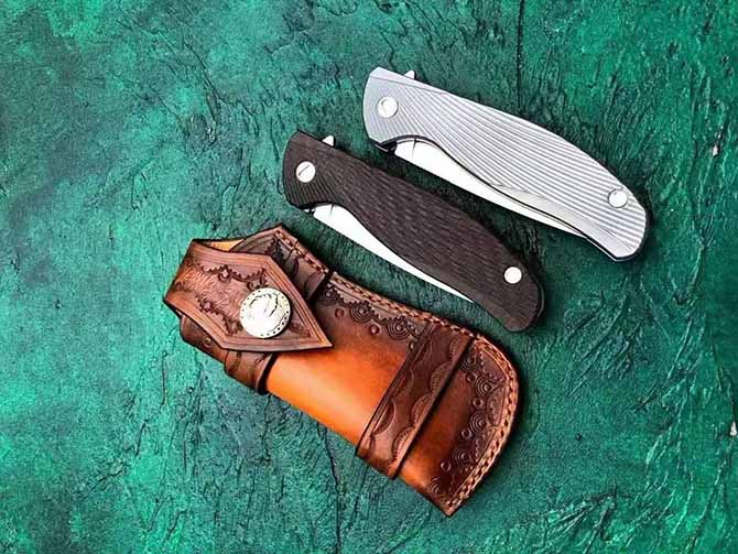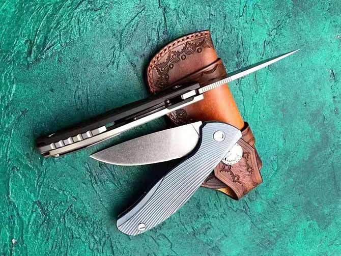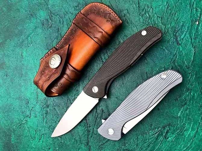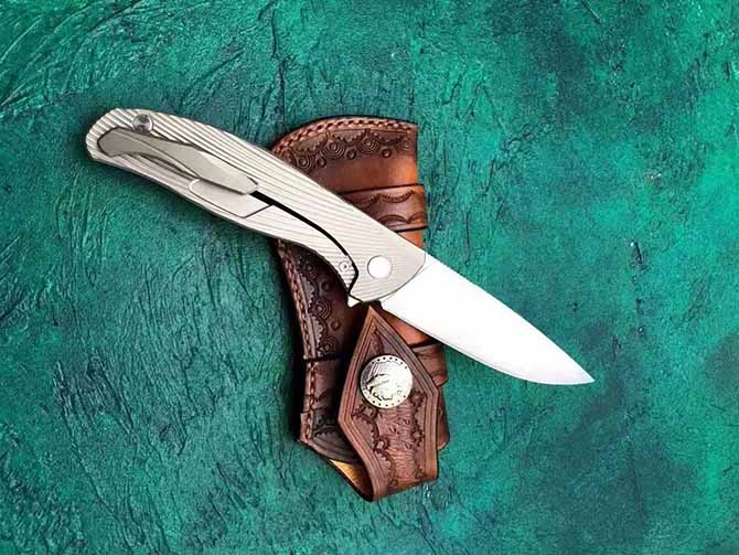 经典熊头TC4钛合金快开折刀 全长:22cm 刃长:9.4cm 刃厚:3.9mm 刃材:奥地利进口N690 手柄:TC4钛合金 硬度:59—60HRC 皮套:意大利进口植鞣牛皮手工缝线