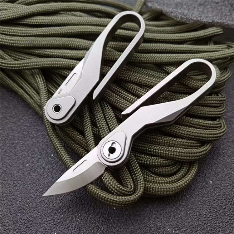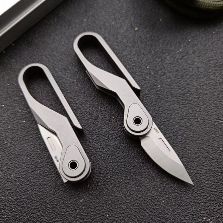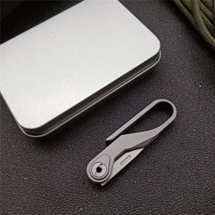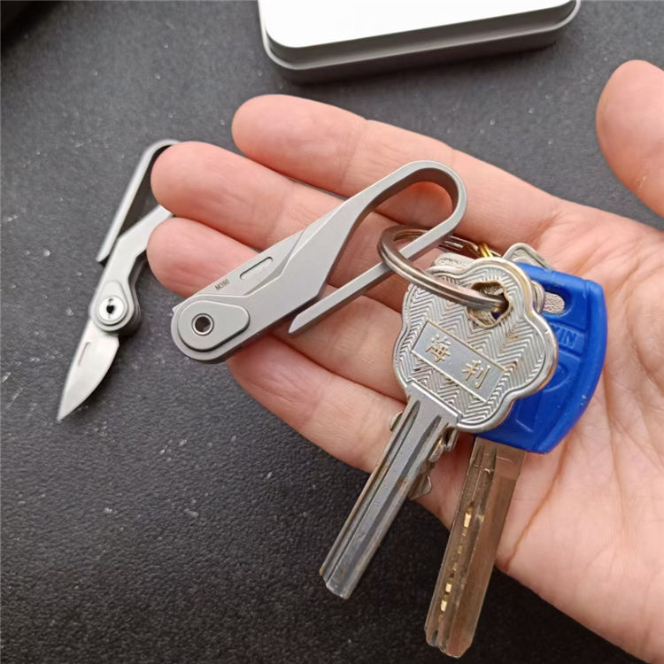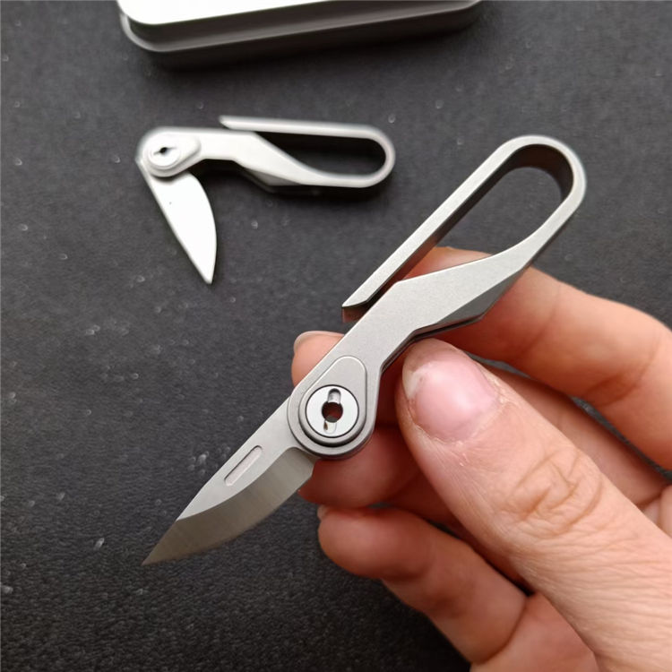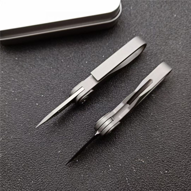 M390钢TC4钛钥匙扣折刀 刃材:M390粉末钢 全长:8.3cm 闭合:5.8cm 刃长:2.5cm 刃厚:1.9mm 柄厚:7.0MM 净重:15.5克 硬度:60HRC 表面:是砂光+石洗 柄材:是美国TC4钛合金,采用定位珠,无锁定机制 备注:配送精美铁盒