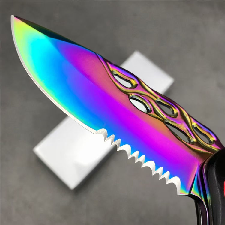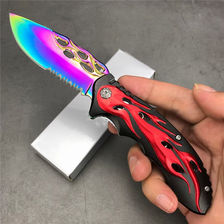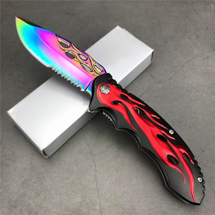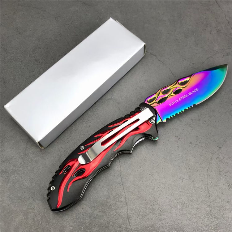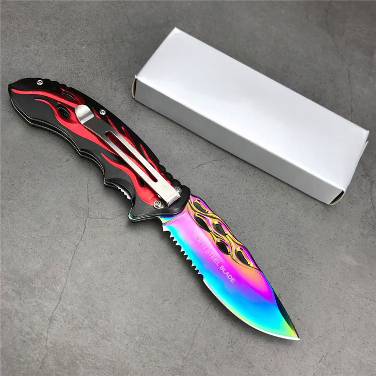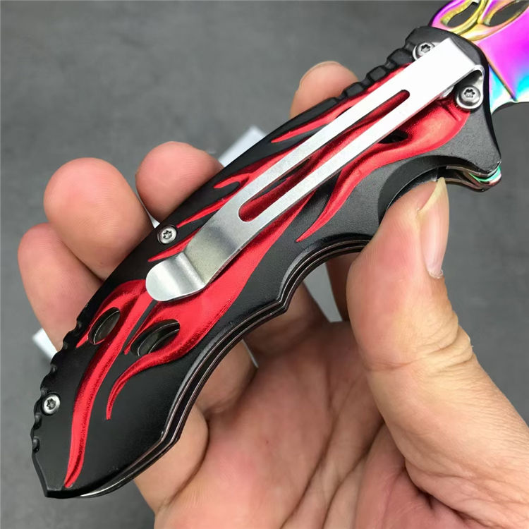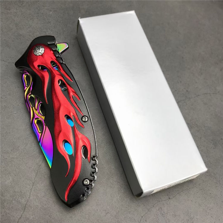红黑火焰纹折刀 全长:20cm 刃长:9cm 柄长:11cm 刃宽:3cm 刃厚:3mm 刃材:5Cr13Mov 重量:150g(含包装) 硬度:58HRC 表面:彩虹镀钛 柄材:铝 锁型:内衬锁