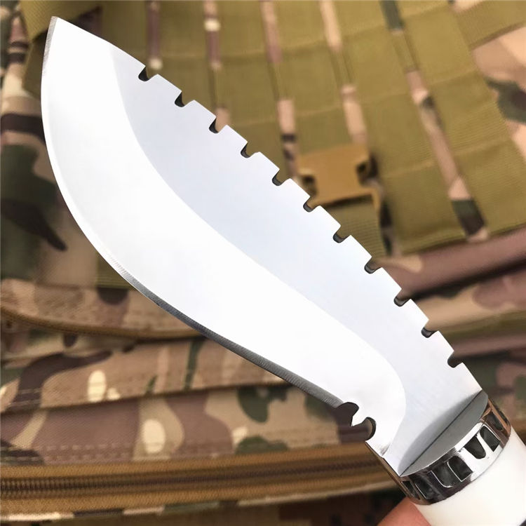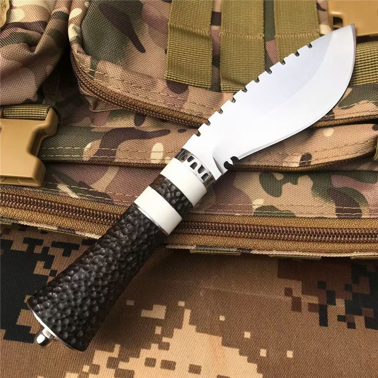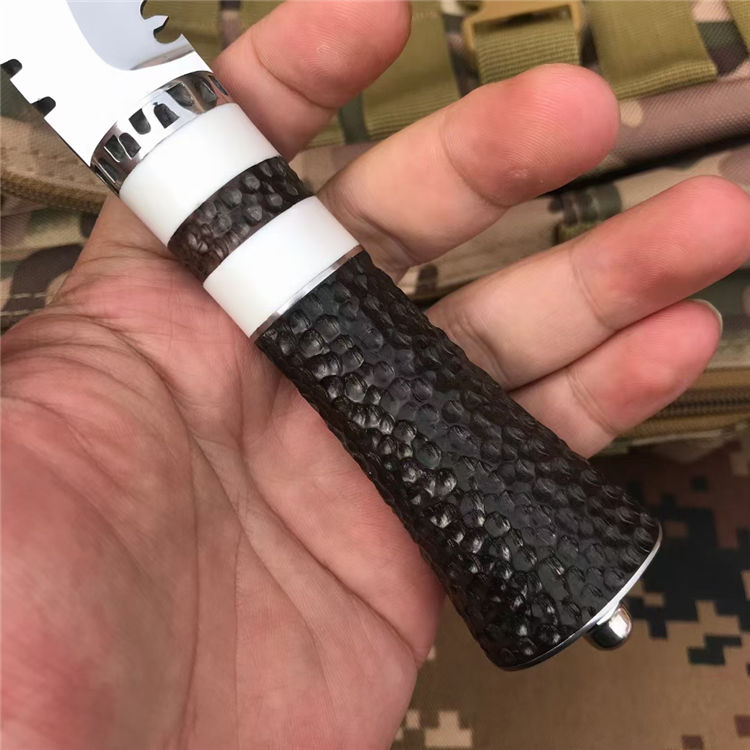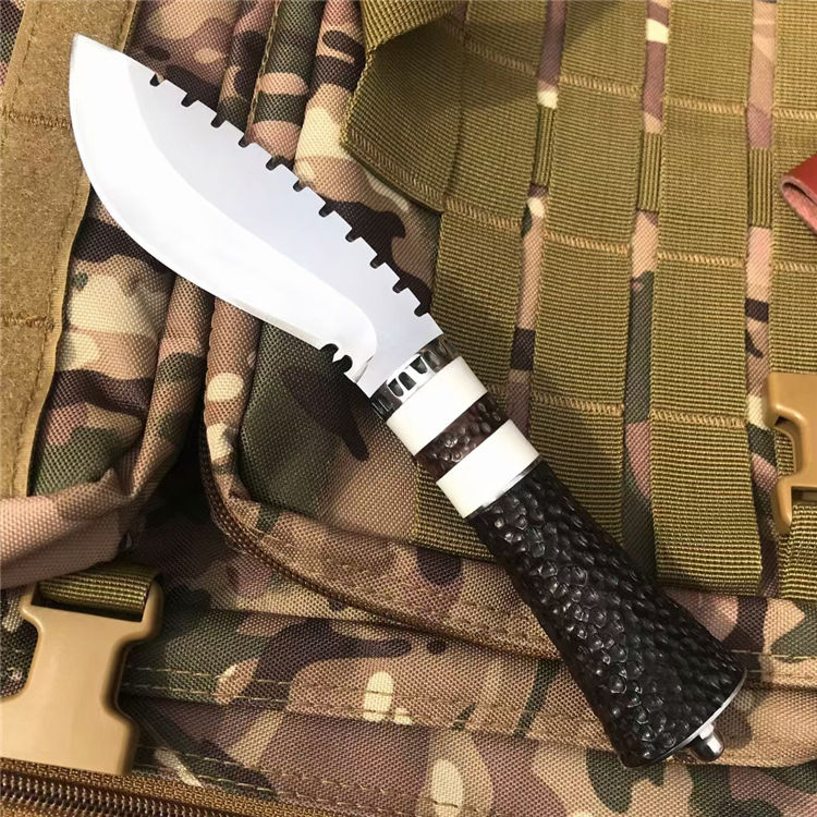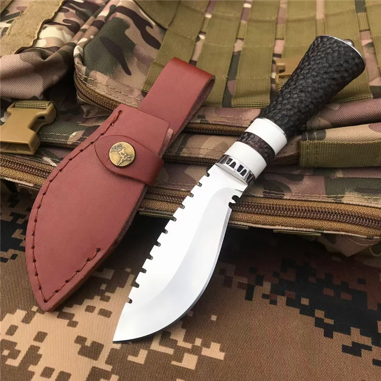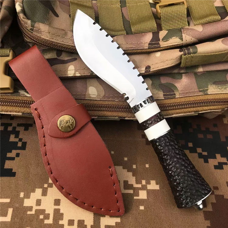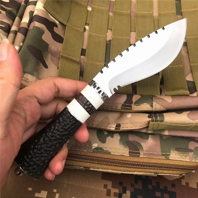 荒野女囚二代直刀 全长:22.6CM 刃长:9.6CM 刃宽:3.6CM 刃材:8CR13MOV 刃厚:0.4CM 柄长:11.2CM 柄材:黑檀+树脂+钢头 重量:256克