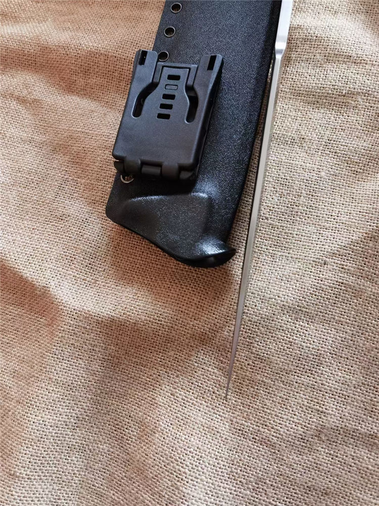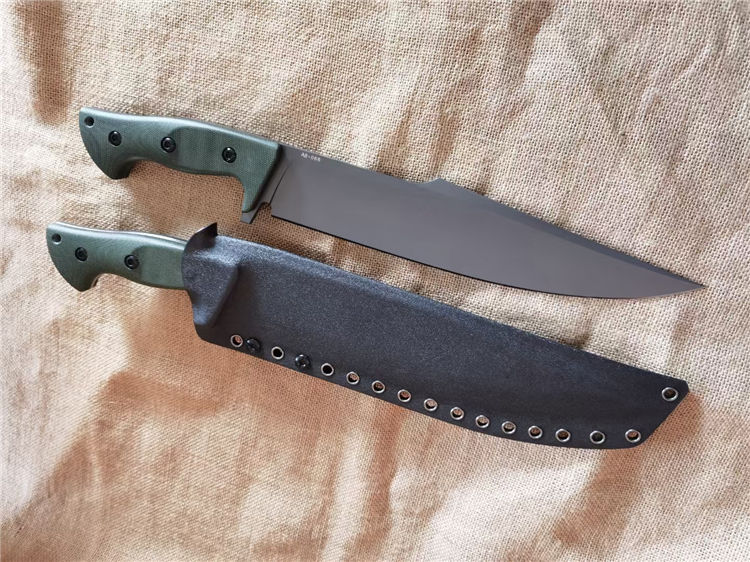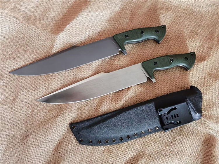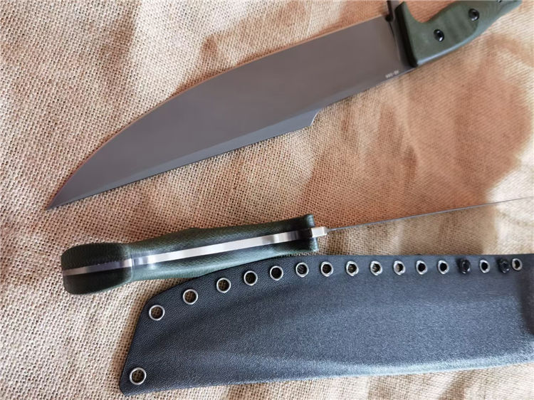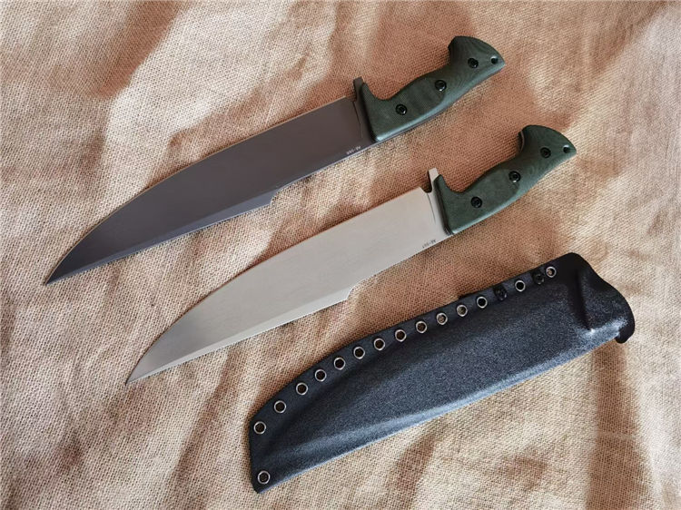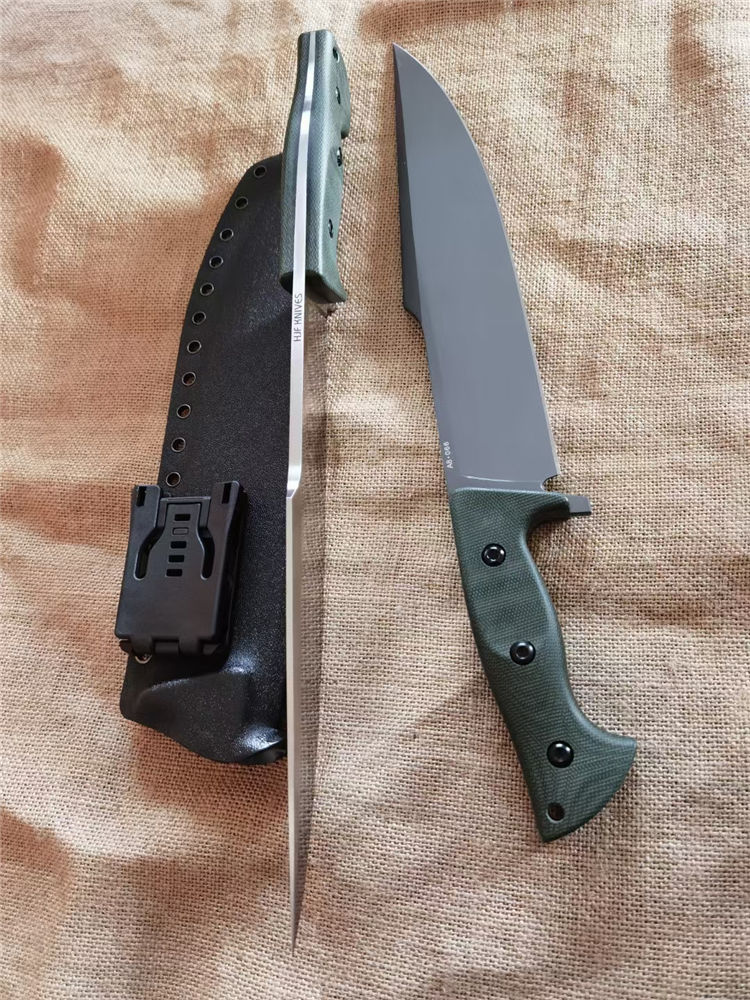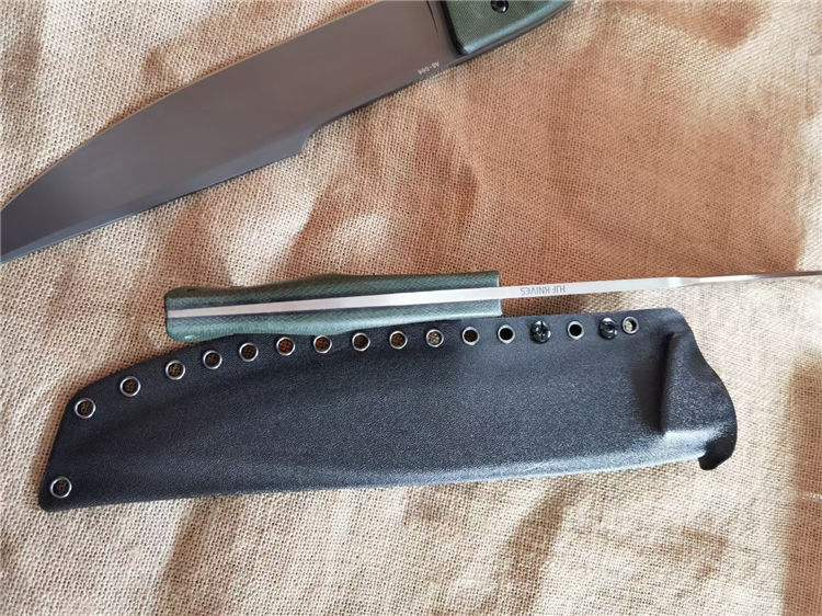 剑鲨博伊直刀 全长:420mm 刃长:277mm 柄长:143 厚度:5.5mm 刃宽:57mm 材质:A8 硬度:59,真空热处理 柄材:橄榄绿亚麻材质 刀鞘:2mm美国k料 刀刃表面:精细镀灰钛和砂光两种,镀钛工艺是一种表面防锈作用的效果,采用真空加工。把色块的颜色附着在刀具上,A8属于高韧性模具钢,韧性和强度优秀,通常用作大型裁纸刀具,划木刀具和锯子