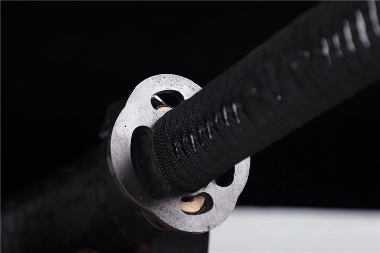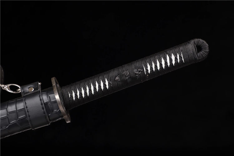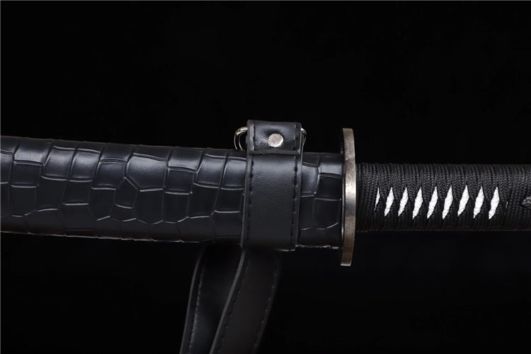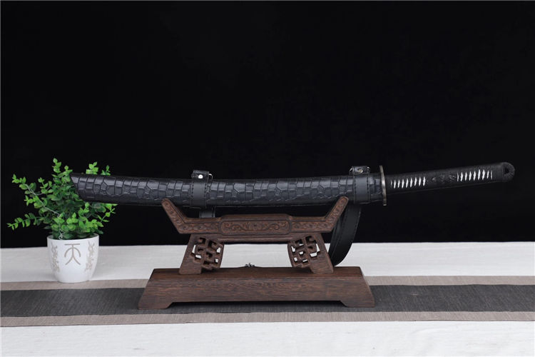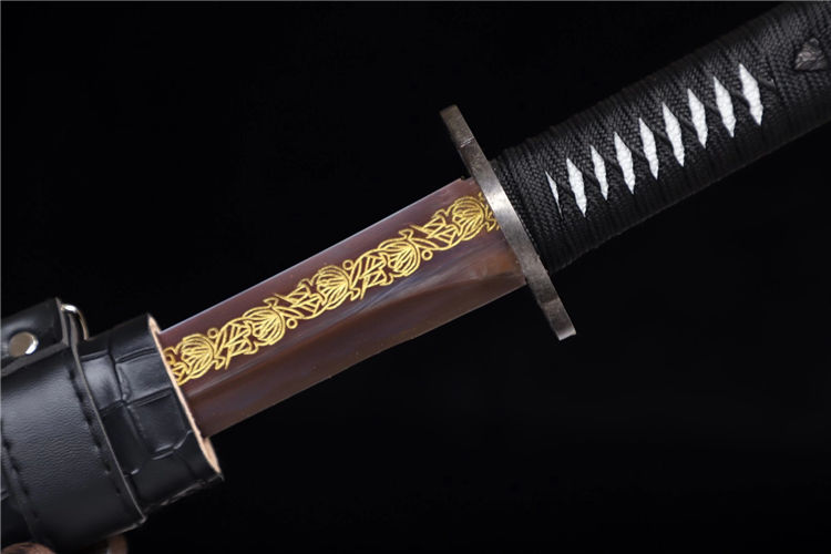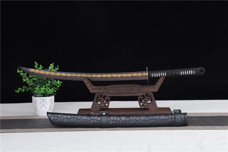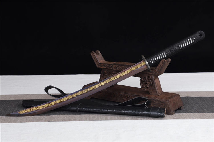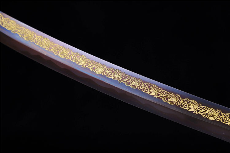 云花武士刀 全长:76cm 刃长:51cm 刃宽:3.2cm 刃厚:0.6cm 全重:1.30kg 净重:1.05kg 鞘材:实木外包鳞皮 装具,铁仿古 材质:高锰钢高性能紫、十三道研磨