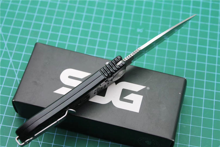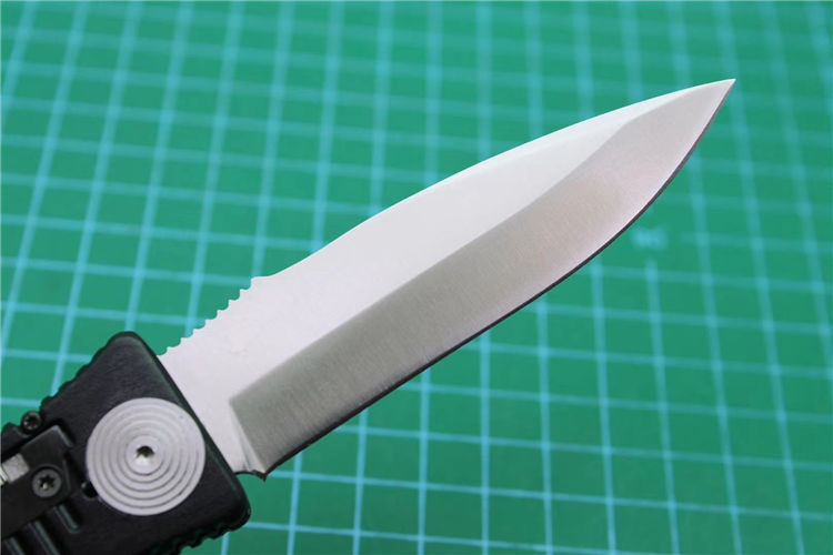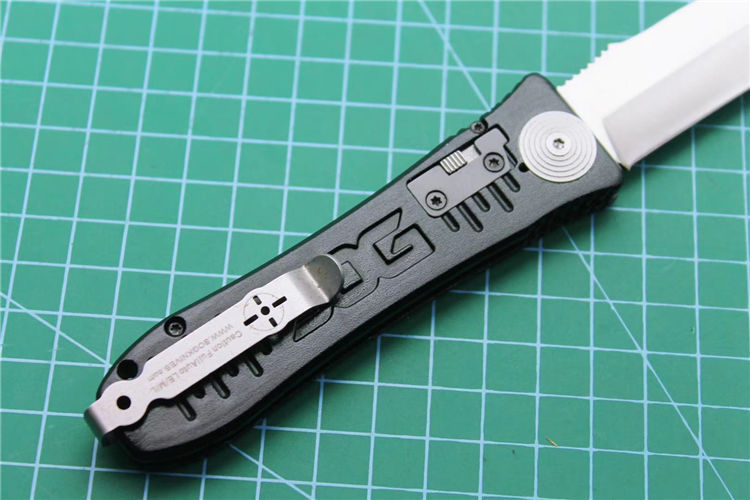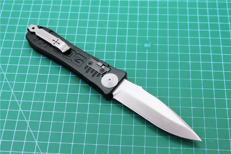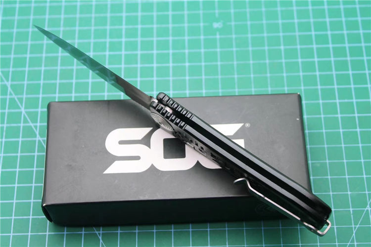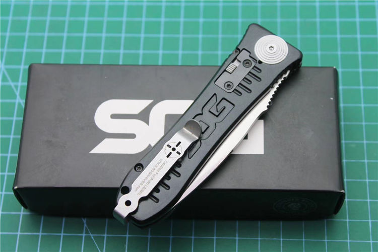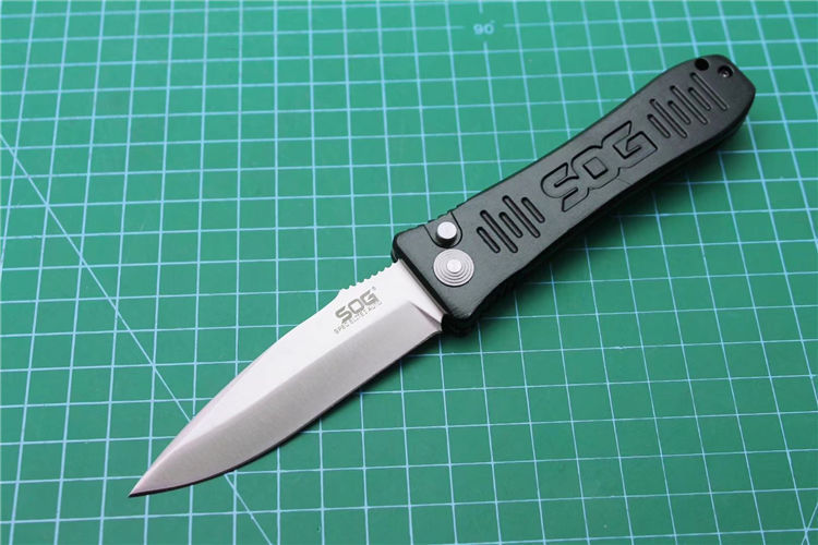SOG特战精英侧开跳刀 全长:195mm 刃长:80mm 柄长:105mm 刃宽:23mm 刃厚:3.0mm 刃材:D2 净重:83克 重量:113g(含包装) 硬度:58-60HRC 表面:砂光 柄材:铝合金柄 工艺:数控电脑逻(CNC)+数控水磨 锁型:自动按钮(有保险装置) 其他:配彩色纸盒