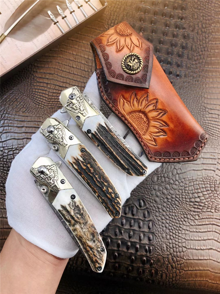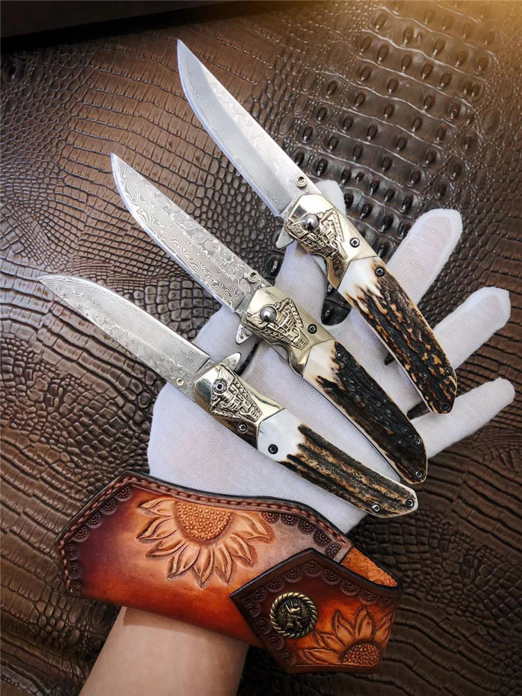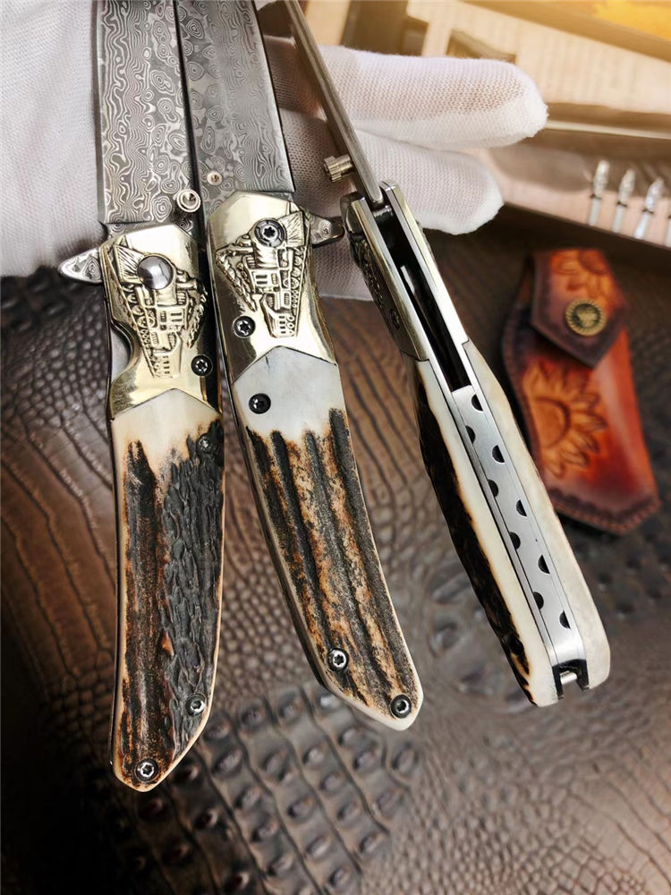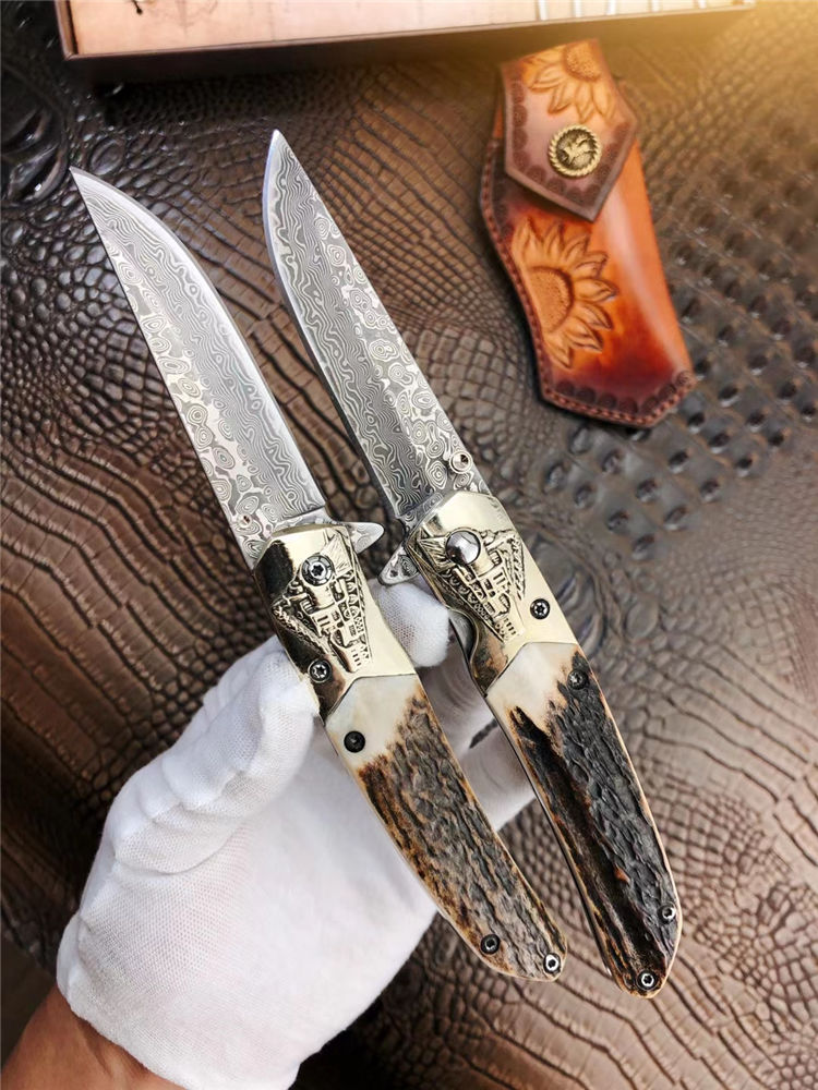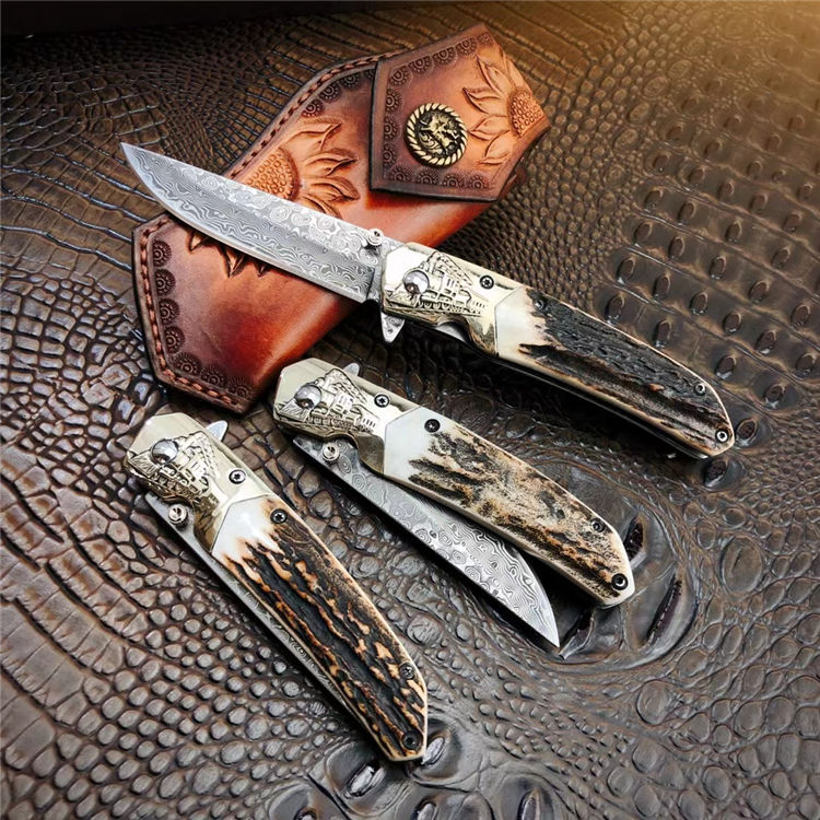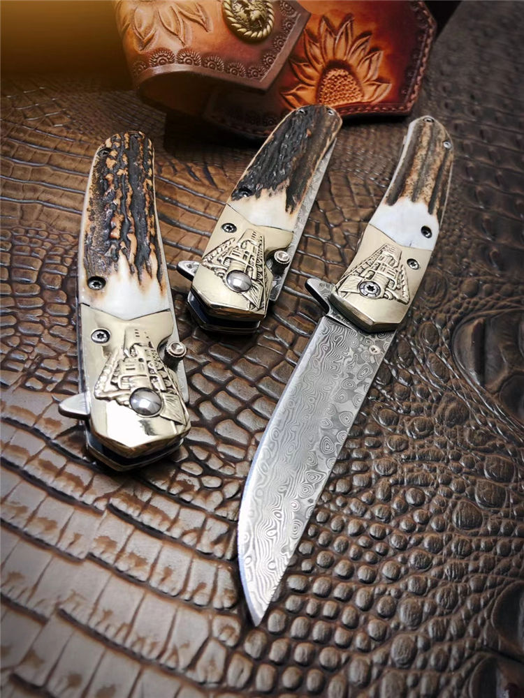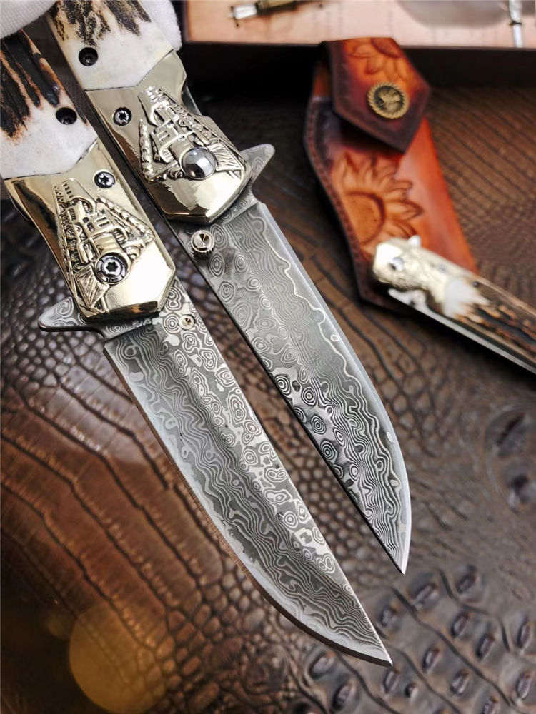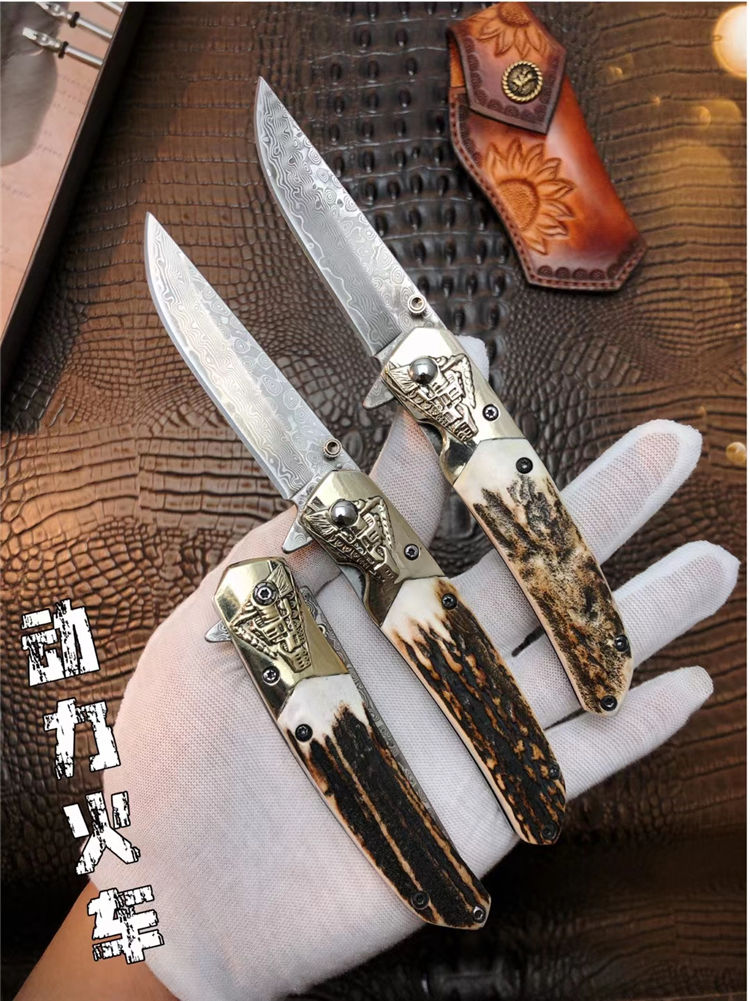 大马士革动力火车折刀 总长:19cm 刀刃:8cm 折合长度:11cm 刃材:大马士革钢 硬度:59-60HRC 刃厚:2.7MM 柄材:白铜+鹿角 包装:银色小盒+黑色小礼袋