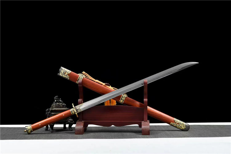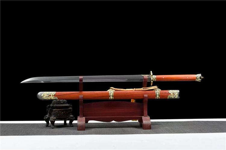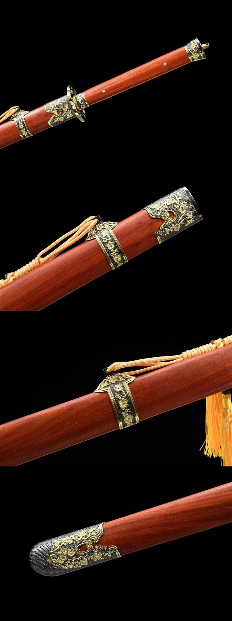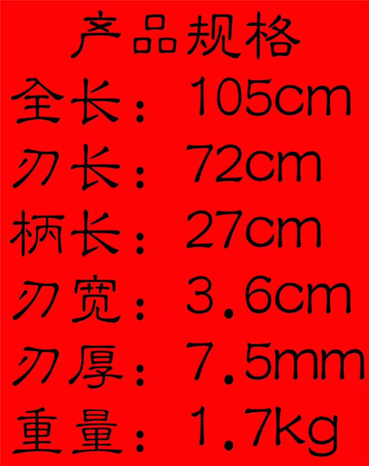 双色雁翎刀 专业测试、请勿模仿 工艺:龙泉古法传统手工艺 装具:合金 刃材:高性能花纹钢 柄材:红木 鞘材:红木 赠品:精美锦盒、养护油、布
