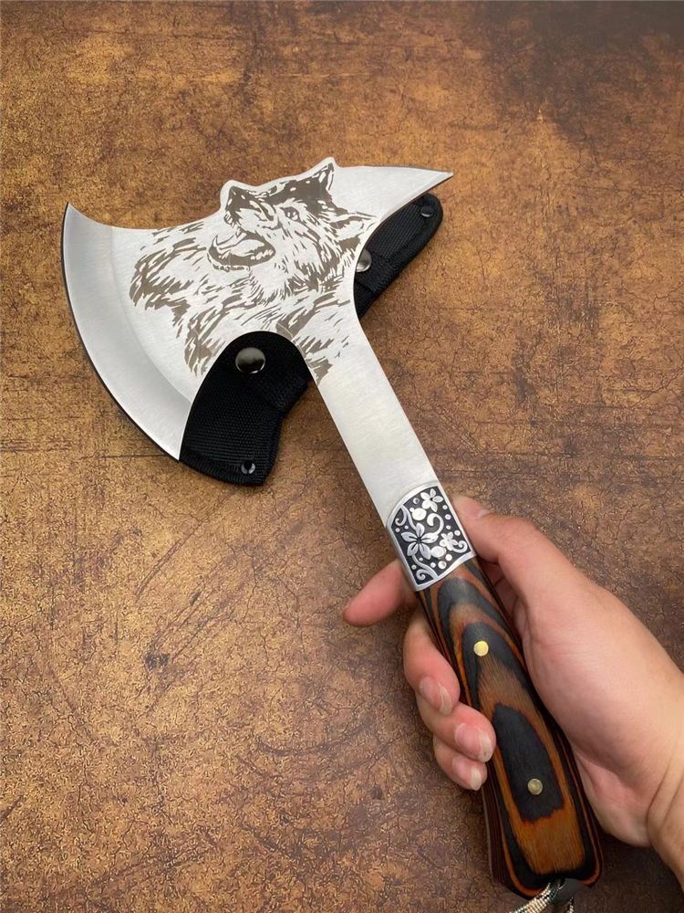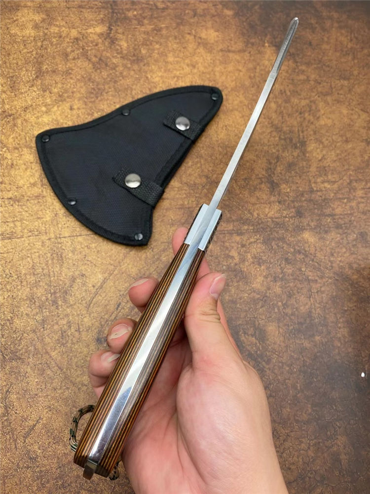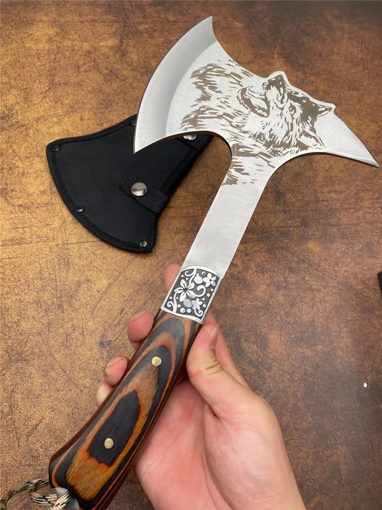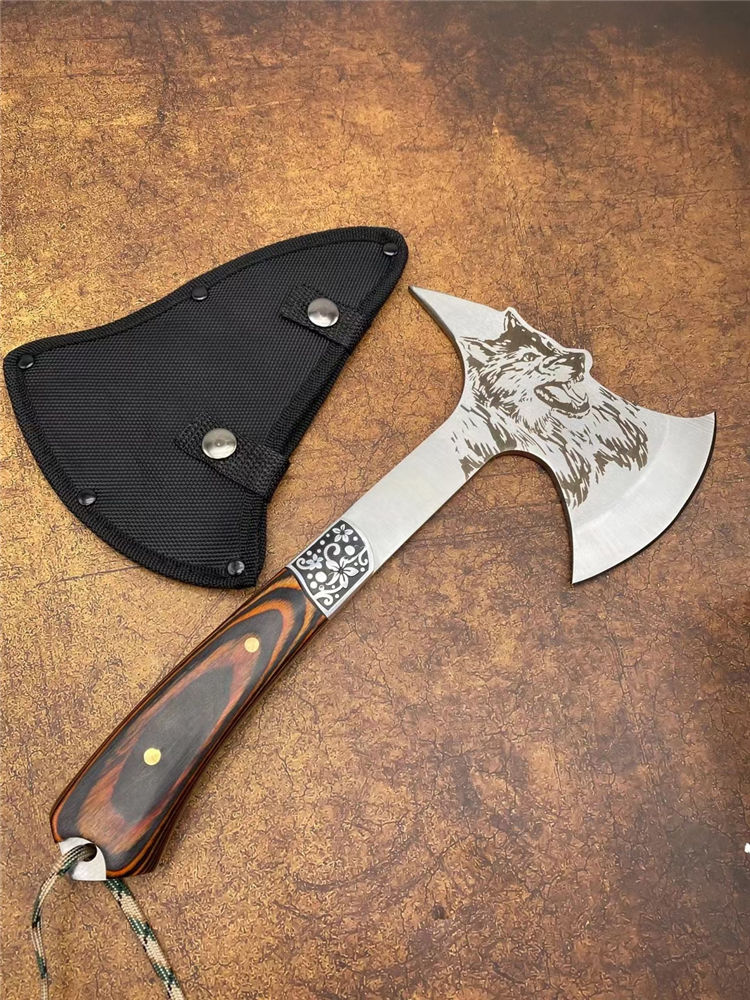 华南斧 全长:32cm 刃长:12cm 刃厚:0.6CM 重:680g 刃材:8CR13 硬度:59 柄材:彩木