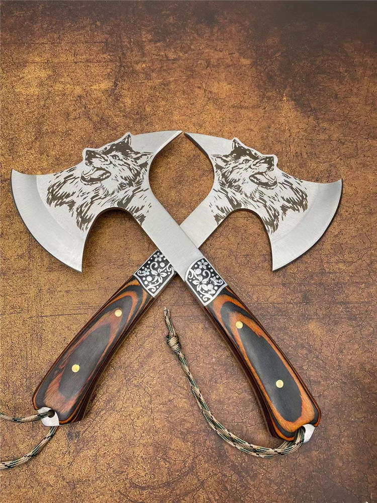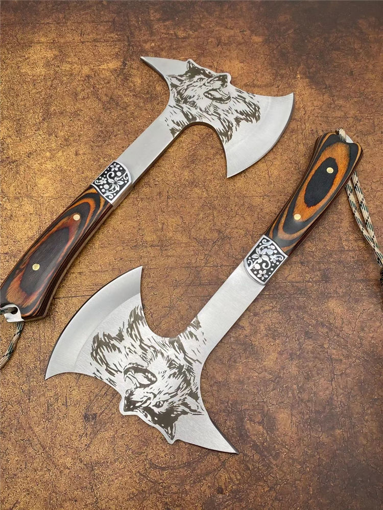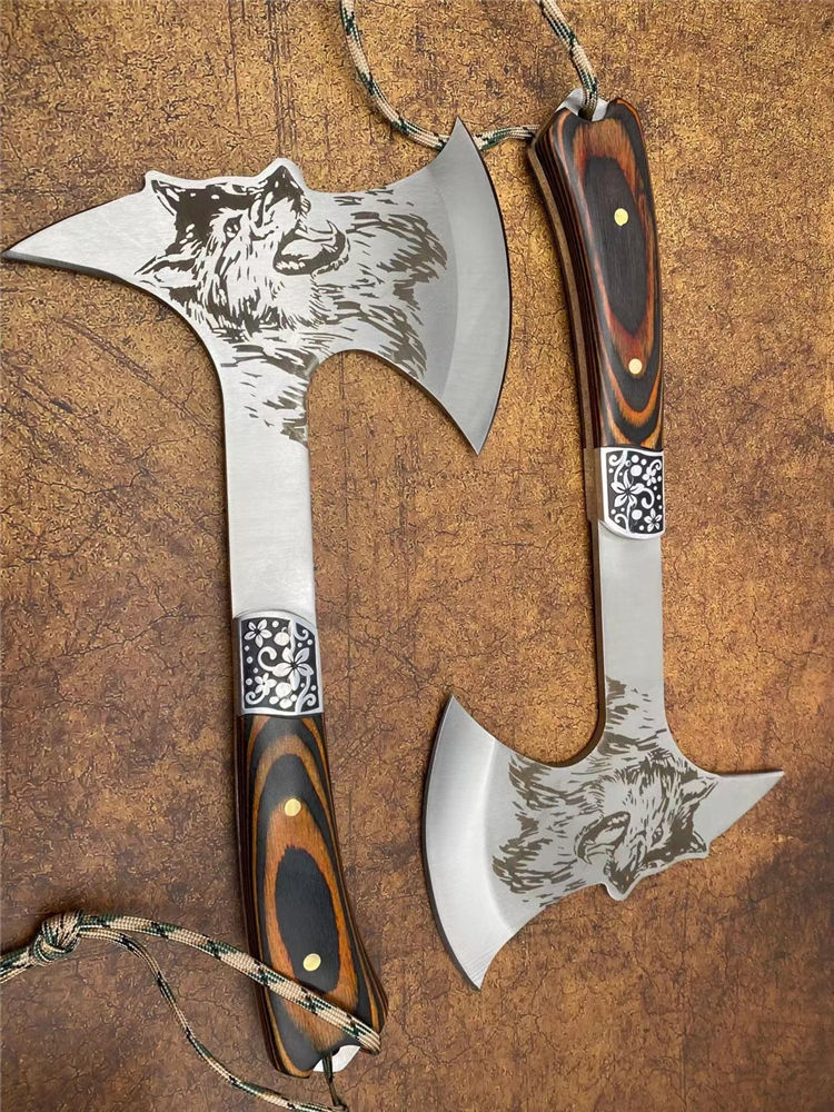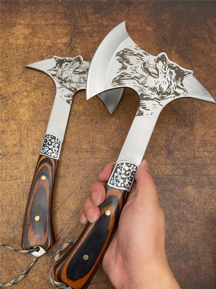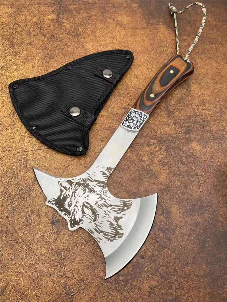 华南斧 全长:32cm 刃长:12cm 刃厚:0.6CM 重:680g 刃材:8CR13 硬度:59 柄材:彩木