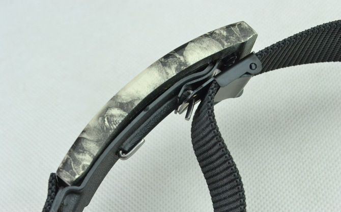 迷彩披覆骷髅头皮带刀(3色可选) 皮带全长:134cm 刀刃长:6cm 刃宽:2cm 刃厚:0.35cm 刃材:420 硬度:54HRC 表面:发黑 柄材:木+迷彩披覆 柄长:9.6cm 重量:258克(含包装物) 其他: 半齿开锋 包装:原装包装 每套包含:尼龙带一条,小刀一把,活动夹子一个 使用方法:先根据自身的腰围用活动夹子固定好,再将皮带头的扣子扣住夹子上的圆孔 **注:灰白、青(仅此款刀刃带有开瓶器功能)、红三种颜色可选,请在下单时,与我们客服沟通好,谢谢!**