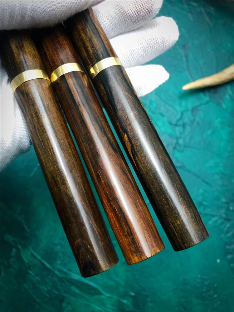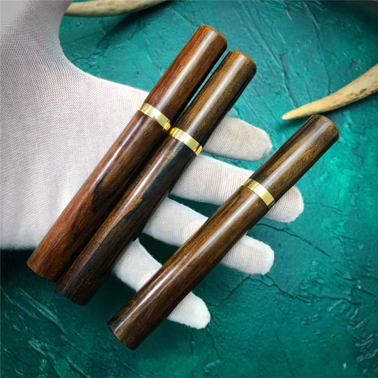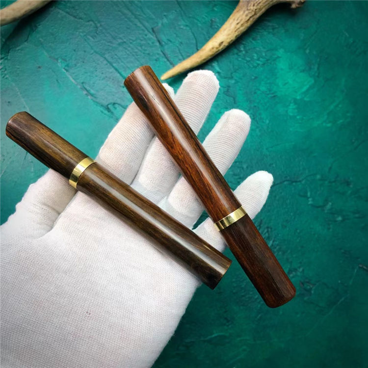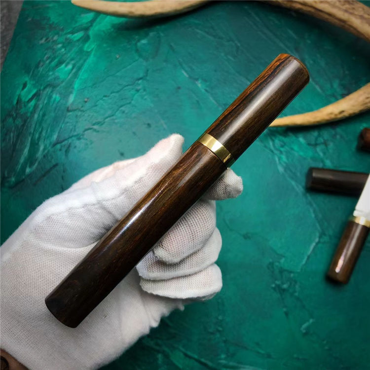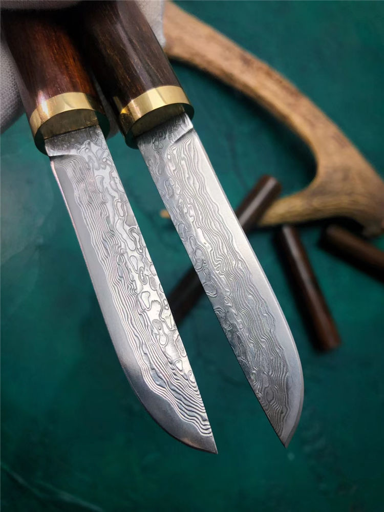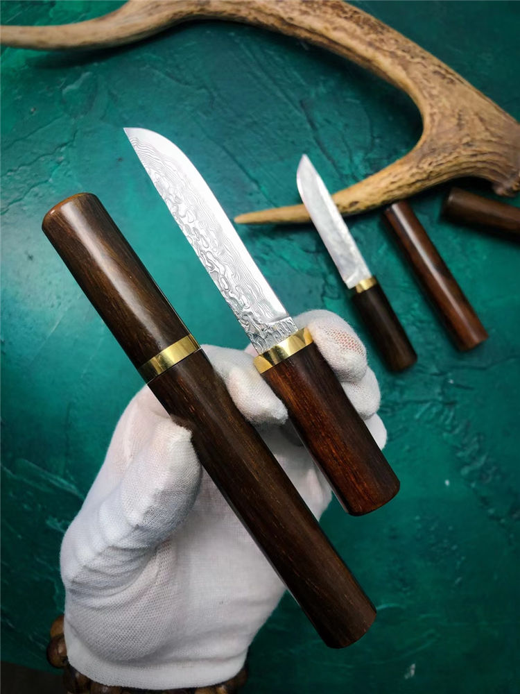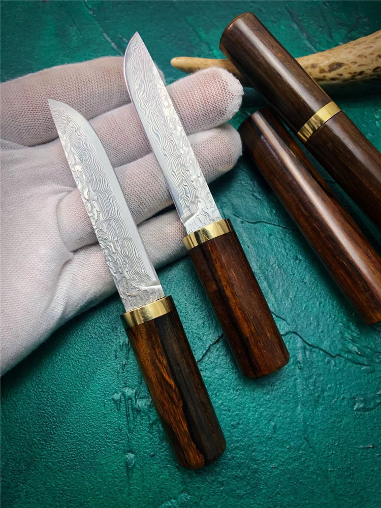 大马士革雪茄刀 总长:13.6cm 刀刃:7.5cm 手柄:5cm 刃宽:1.9cm 厚度:3MM 钢材:进口大马士革钢 硬度:59HRC 柄材:老料黄檀木 包装:黑色盒