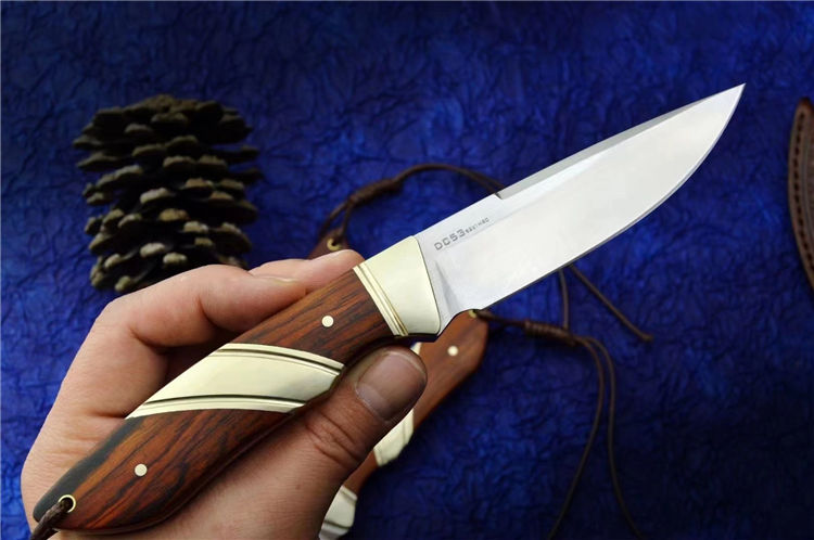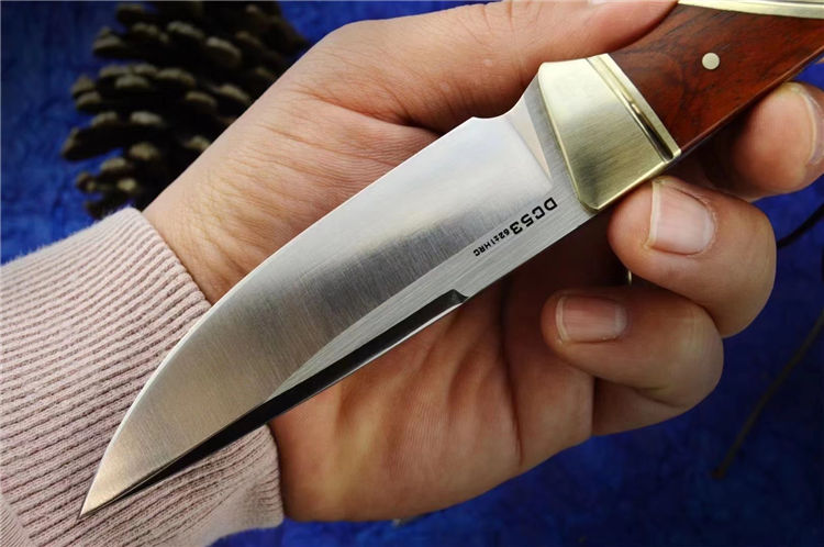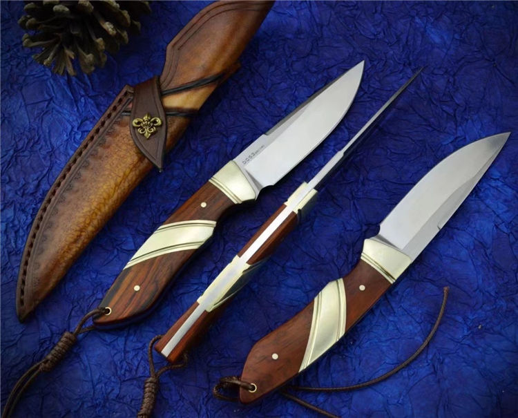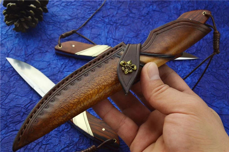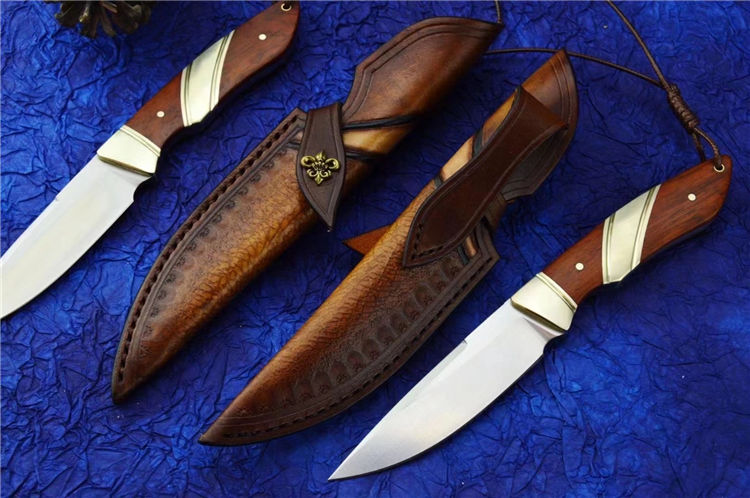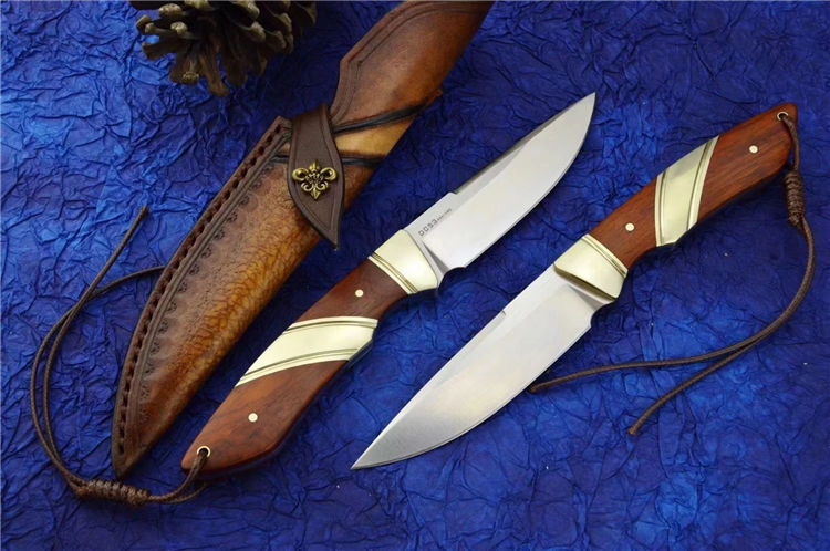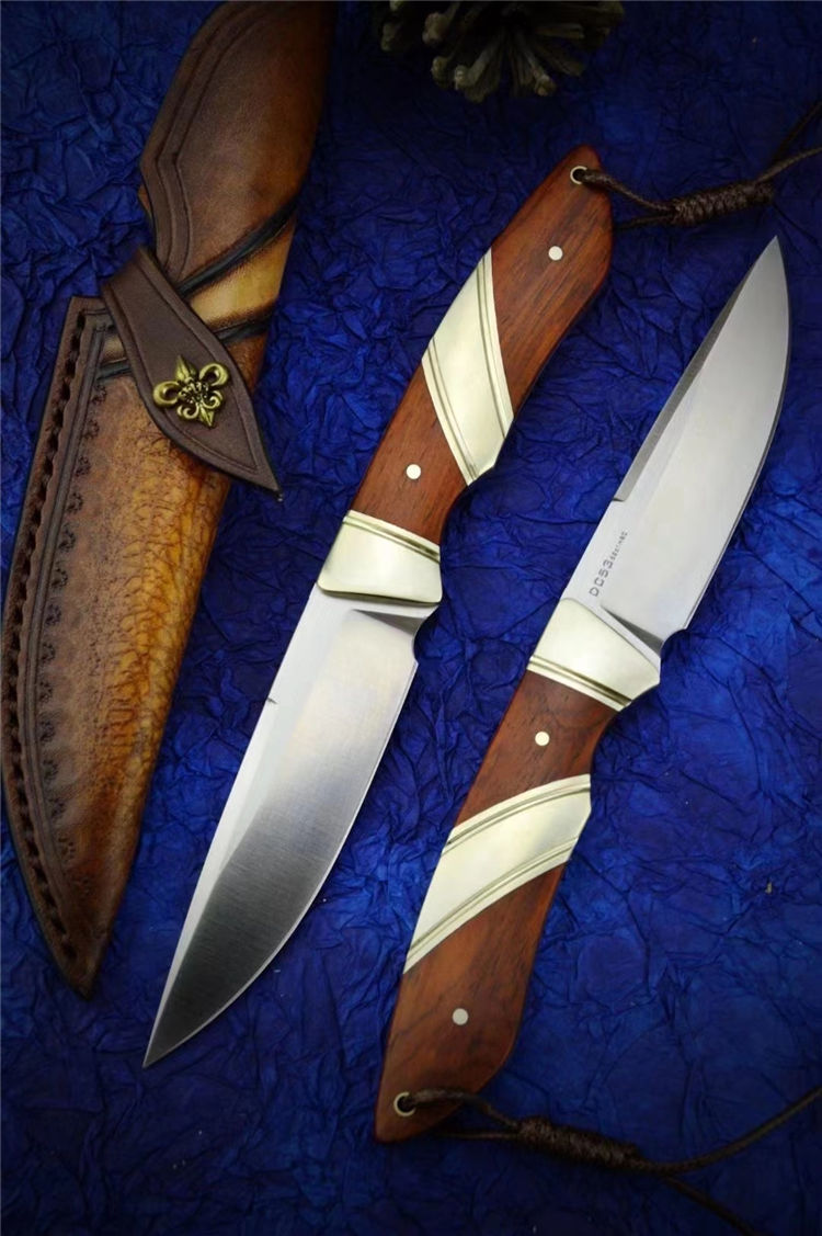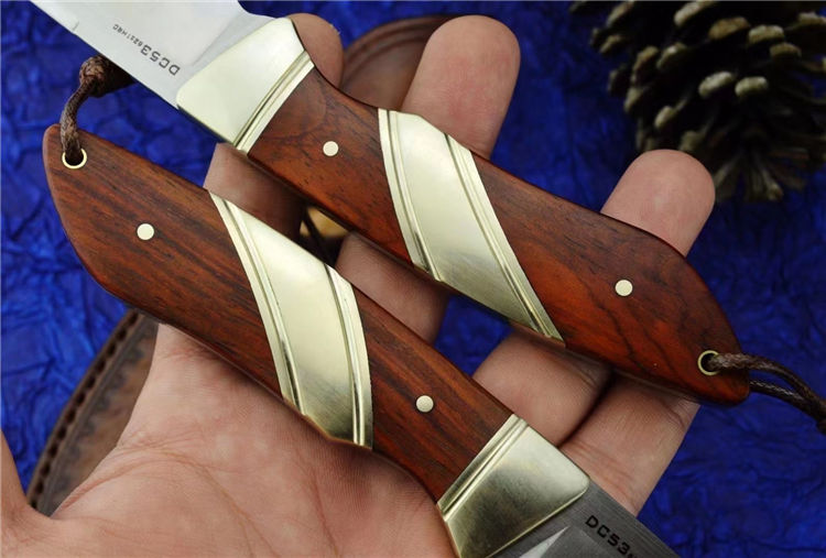 DC53猎鱼直刀 总长:20.6cm 刃长:9.2cm 刃厚:3.5MM 刃宽:2.4cm 钢材:进口DC53合金模具钢 硬度:61-62HRC 热处理:真空热处理 表面效果:精细砂光+拉丝 柄材:黄铜+黄檀木 皮套;意大利进口植鞣皮,手工复棕色雕花皮套
