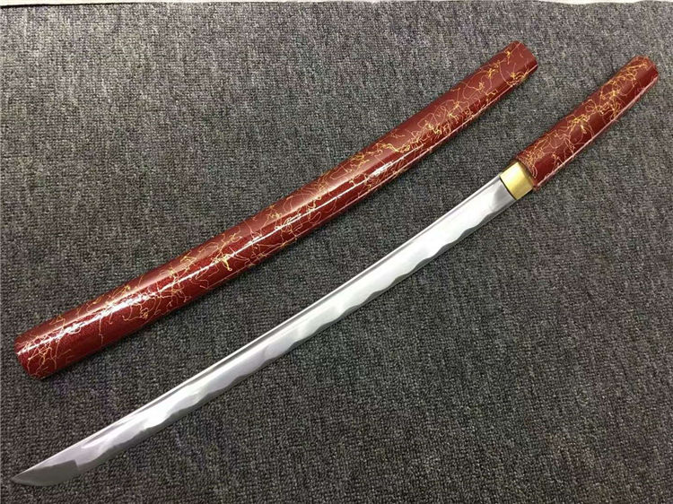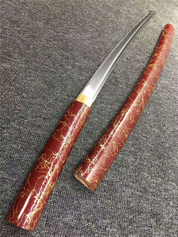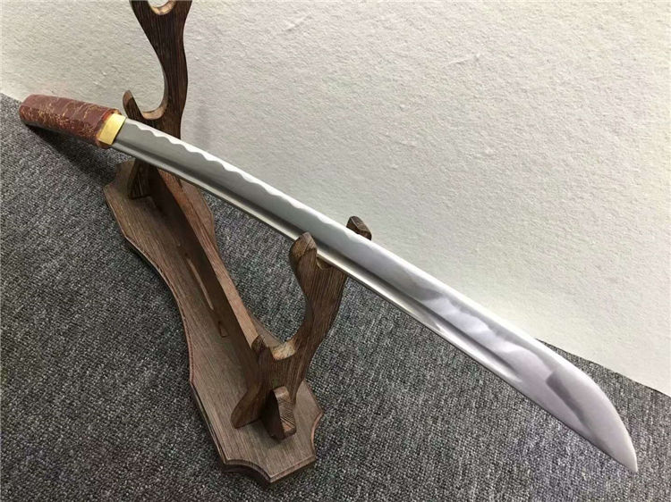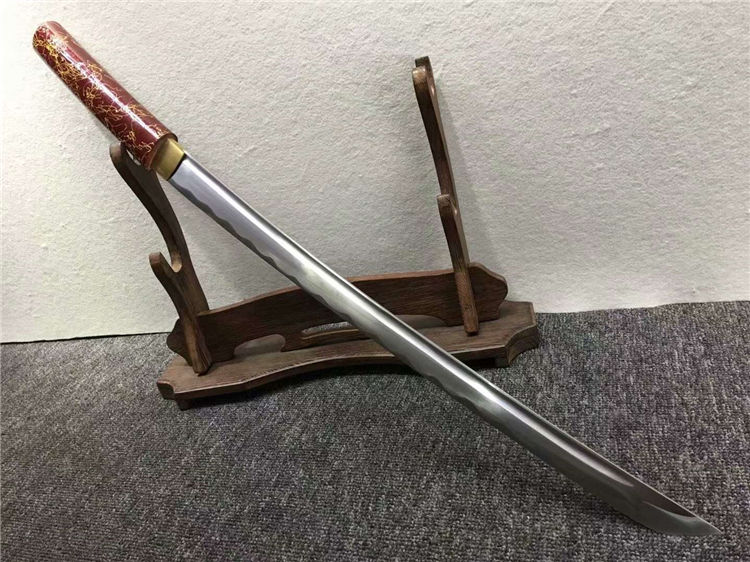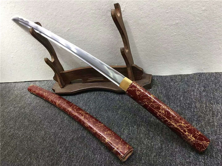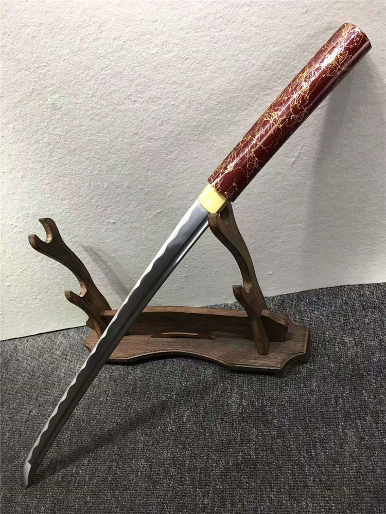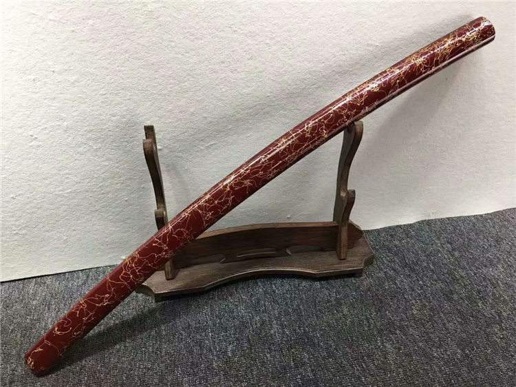 暗红金丝中款唐刀 全长:77cm 刃长:50cm 刃宽:3.2cm 刃厚:0.7cm 净重:0.70kg 刃材:花纹钢 刀鞘:红木