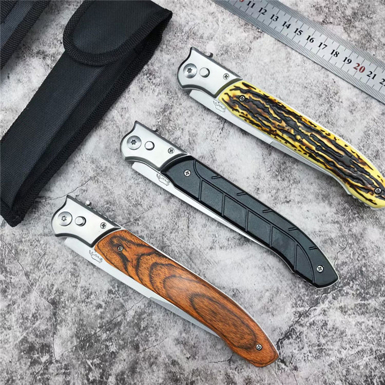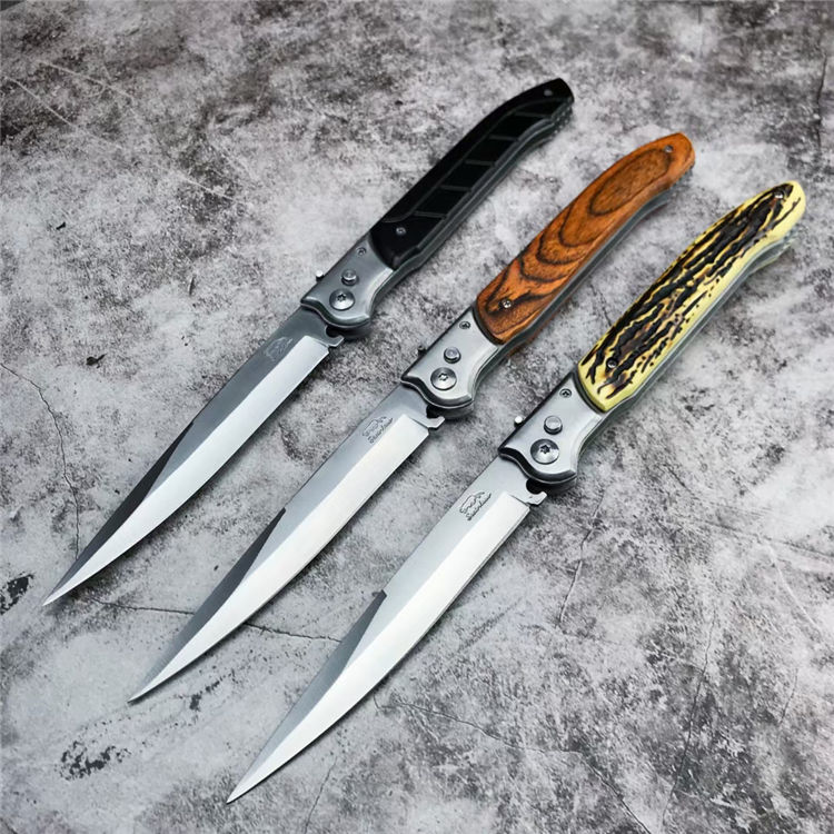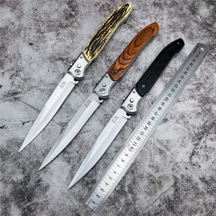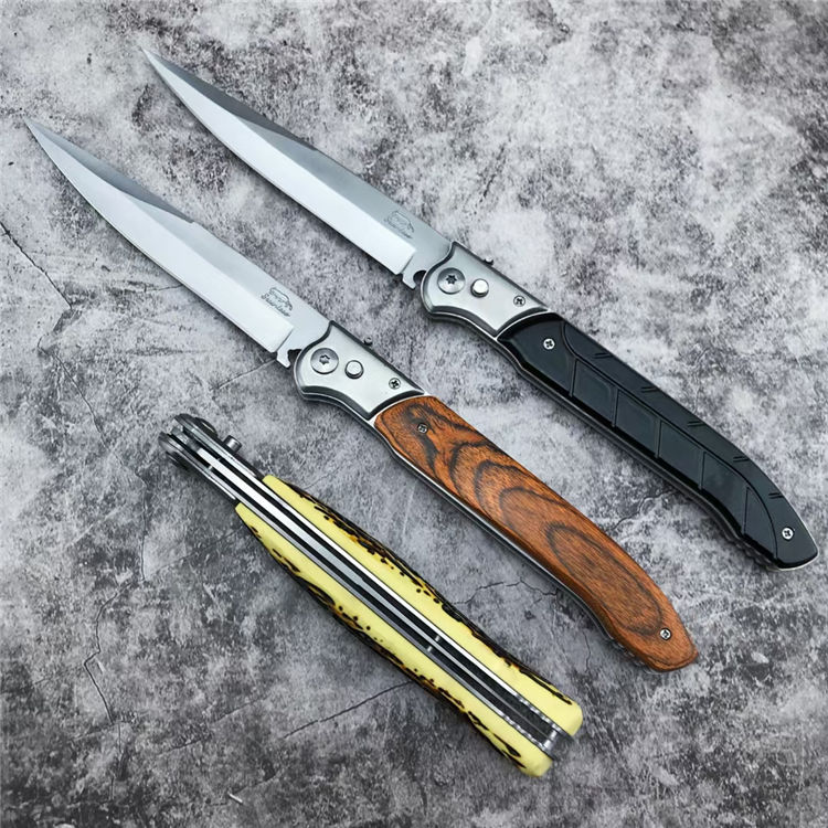 俄罗斯民族E122强力侧跳刀 全长:30.5CM 刃长:13CM 刃厚:0.22CM 刃宽:2CM 重量:200克 刃材:420不锈钢 柄材:彩木柄-树脂柄-塑料柄-三种颜色可选