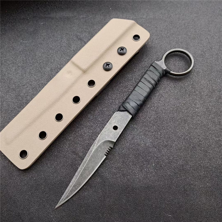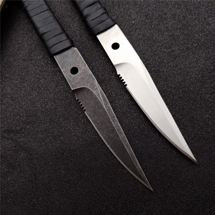 巴斯蒂内利刺客直刀 全长:17.5CM 刃长:6.5CM 柄长:11CM 钢材:440C 柄材:皮绳 硬度:58HRC 刃厚:0.38CM 刃宽:1.4CM 净重:72G 毛重:195G 刀套:K鞘沙漠色 表面处理:砂光或黑色石洗 包装:黑色礼品盒
