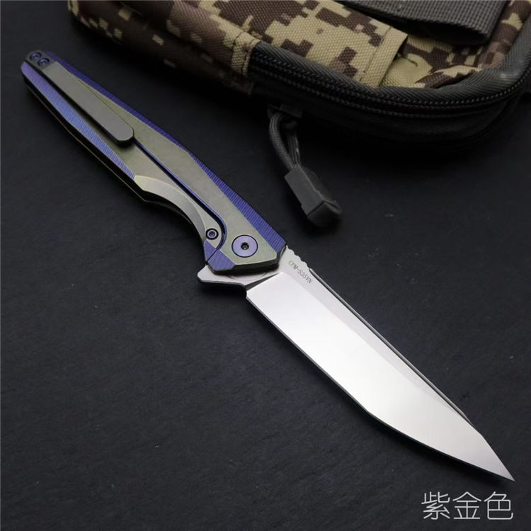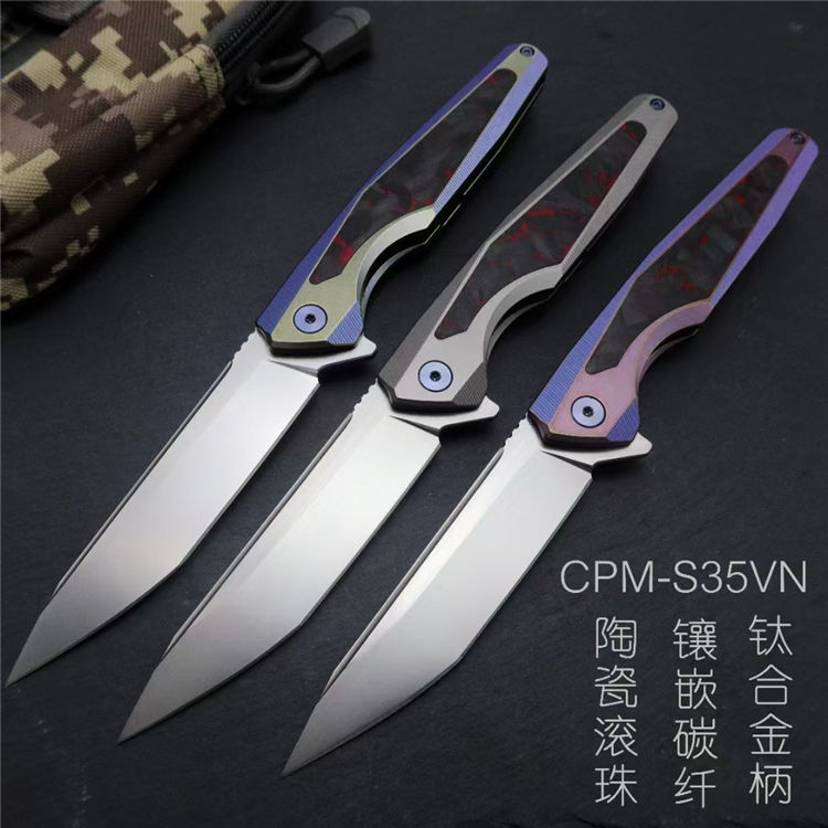拓途S35VN战术折刀 总长:21.8cm 刃长:9.5cm 折合:12.2cm 刃宽:2.3cm 厚度:3.0mm 刃材:美国进口CPM—S35VN刀具钢 硬度:61-62HRC(真空深冷热处理) 开刃方式:水冷多次开刃 柄材:航空级别的TC4钛合金,陶瓷滚珠轴承开合,结构强度强悍 背夹:钛合金 包装:黑色礼盒