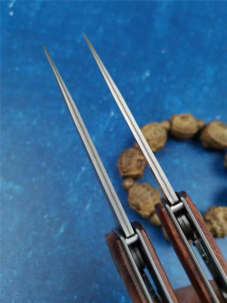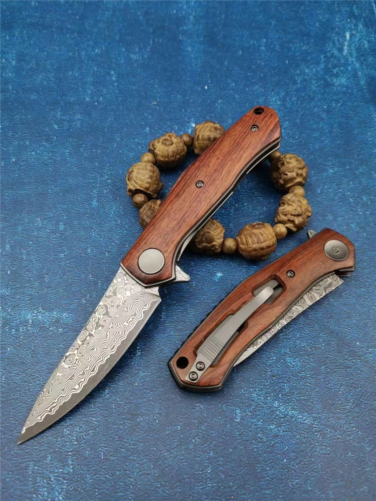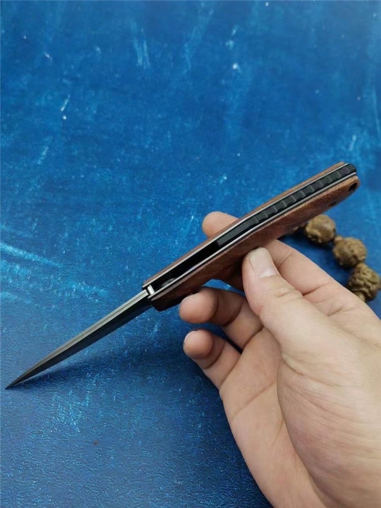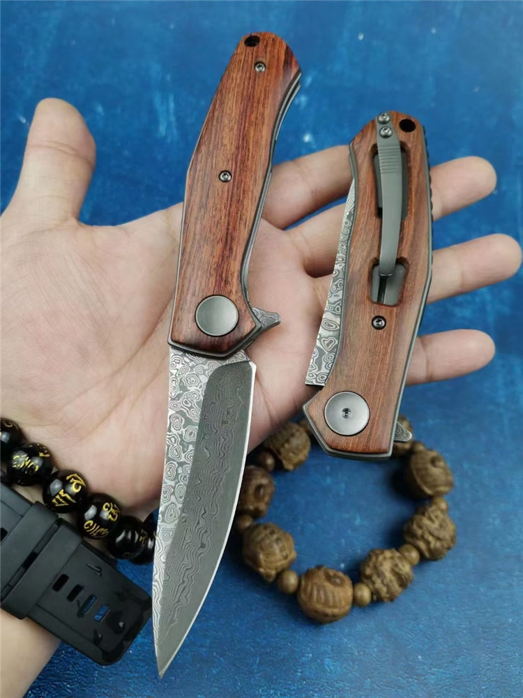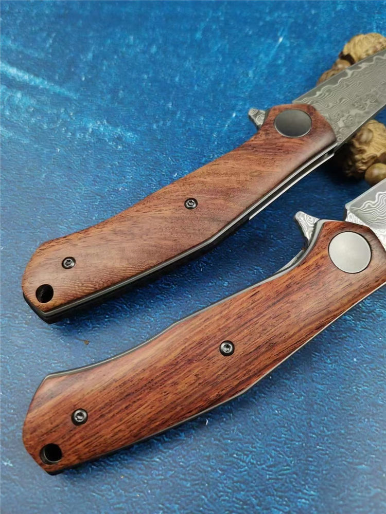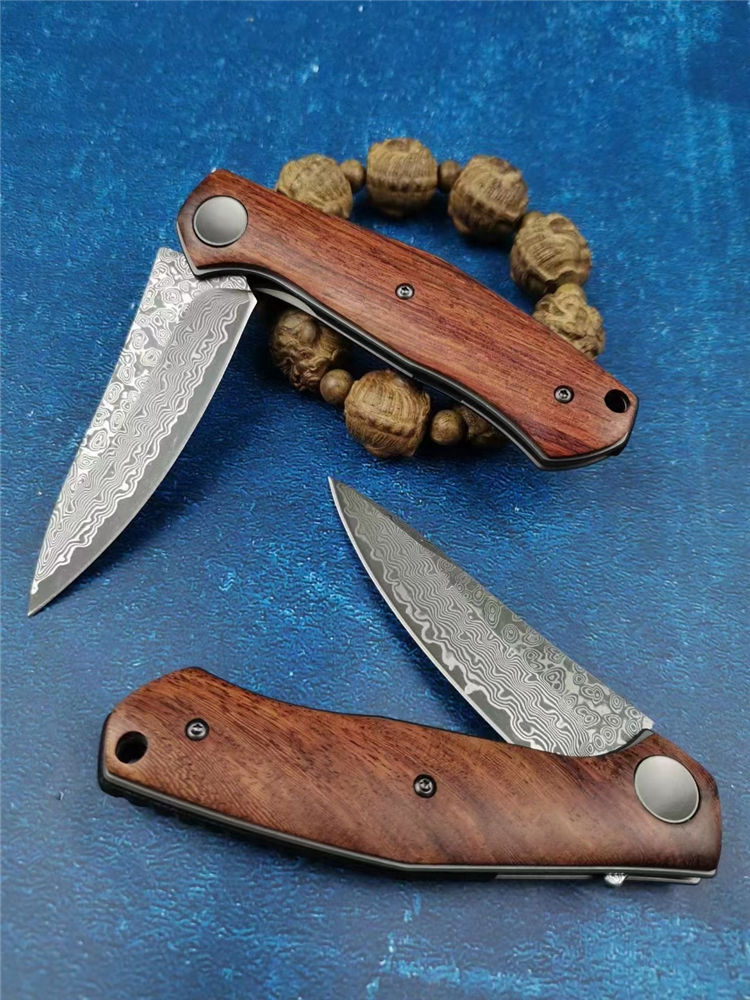 大马士革战斧折刀 全长:18.8cm 刃长:8.2cm 柄长:10.8cm 刃宽:2.8cm 刃厚:2.5mm 刃材:VG10大马士革钢 柄材:精挑天热酸枝木 硬度:59-60HRC
