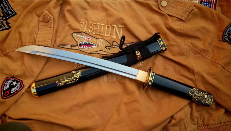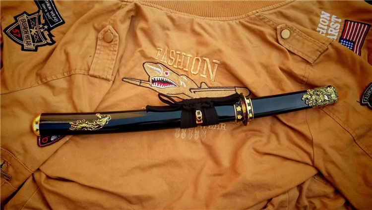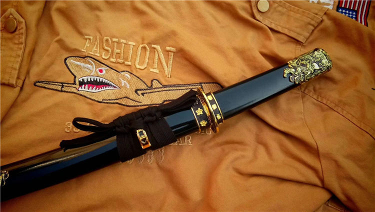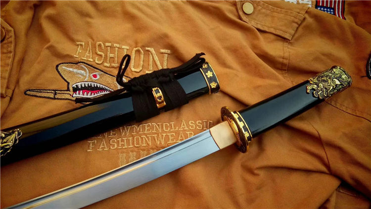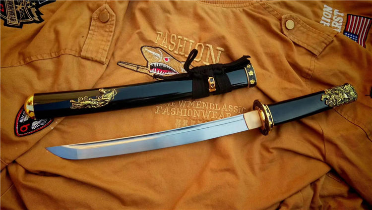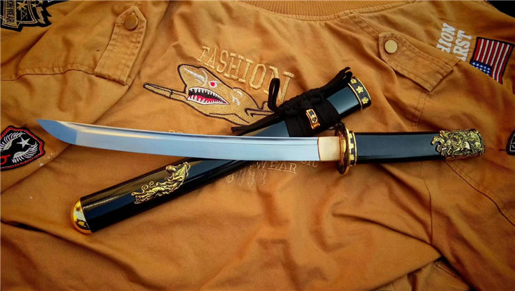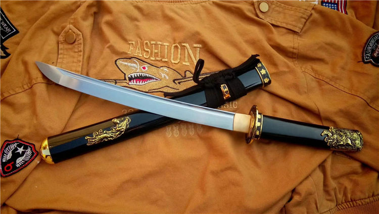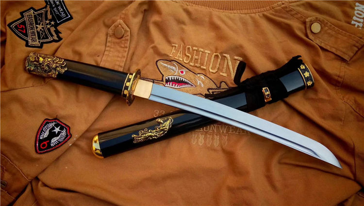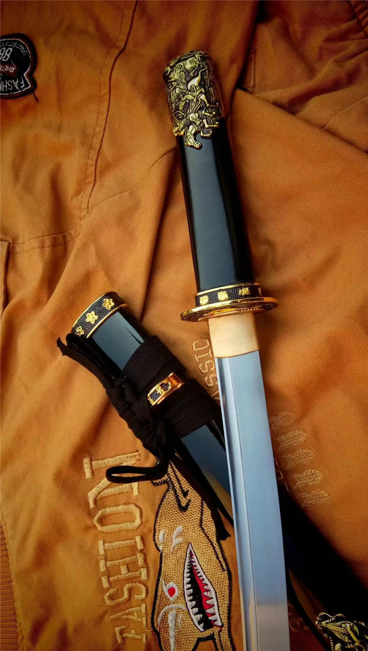 飞天肋差武士刀 全长:52.5cm 刃长:29.2cm 材质:高锰钢锻造 手工开槽研磨开刃配纯铜刀镞,高性能,刀鞘为高强度聚合树脂采用上漆工艺,配饰为手工雕刻日式传统樱花纹饰装具,一款非常适合收藏把玩的短刀