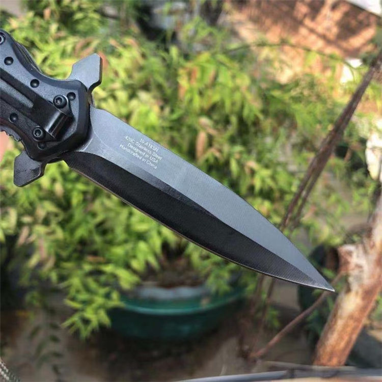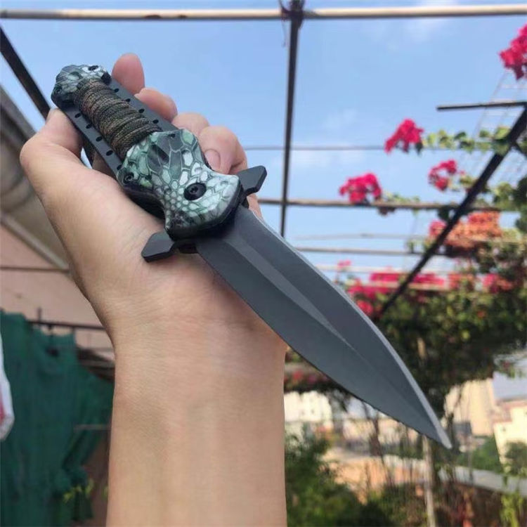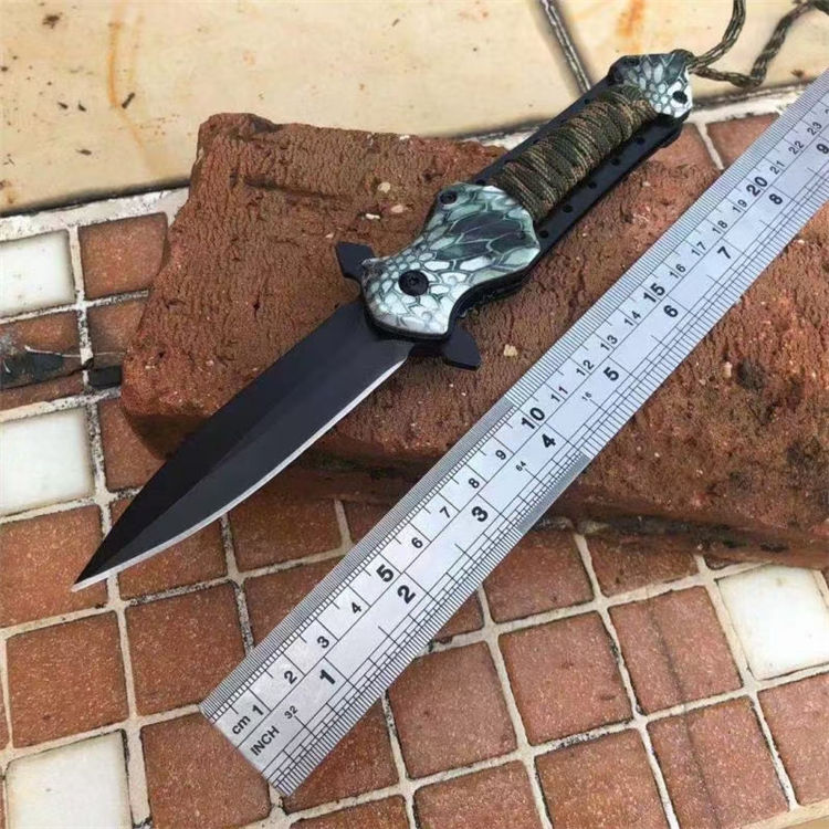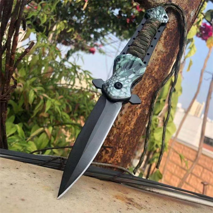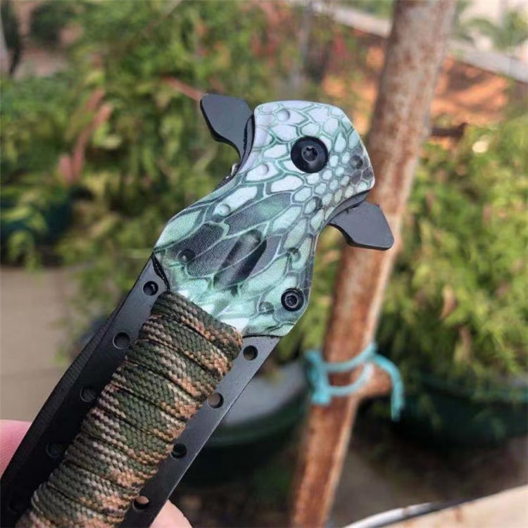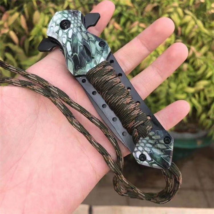 扎带十字架折刀 全长:23cm 刃长:9cm 柄长:14cm 刃材: 3CR13 柄材:铝柄+扎带
