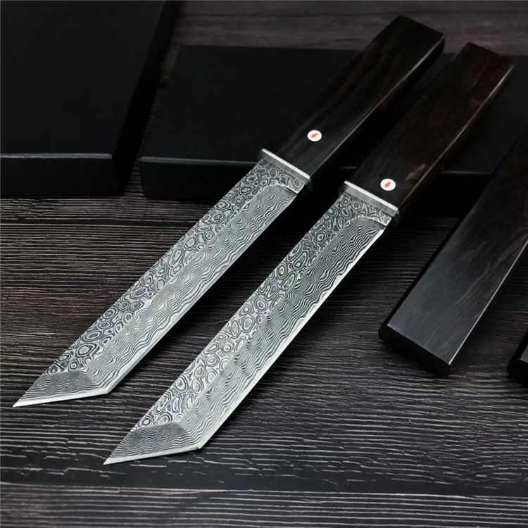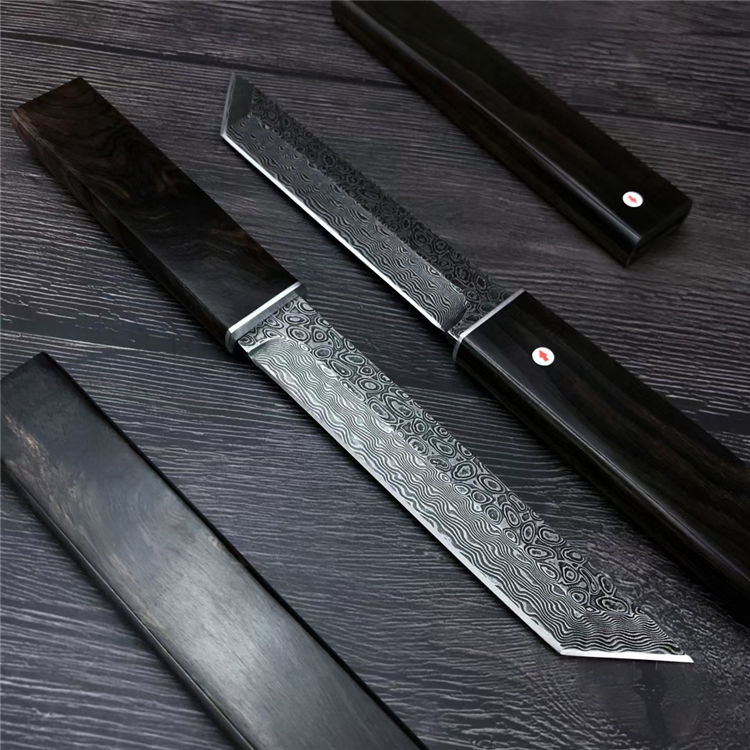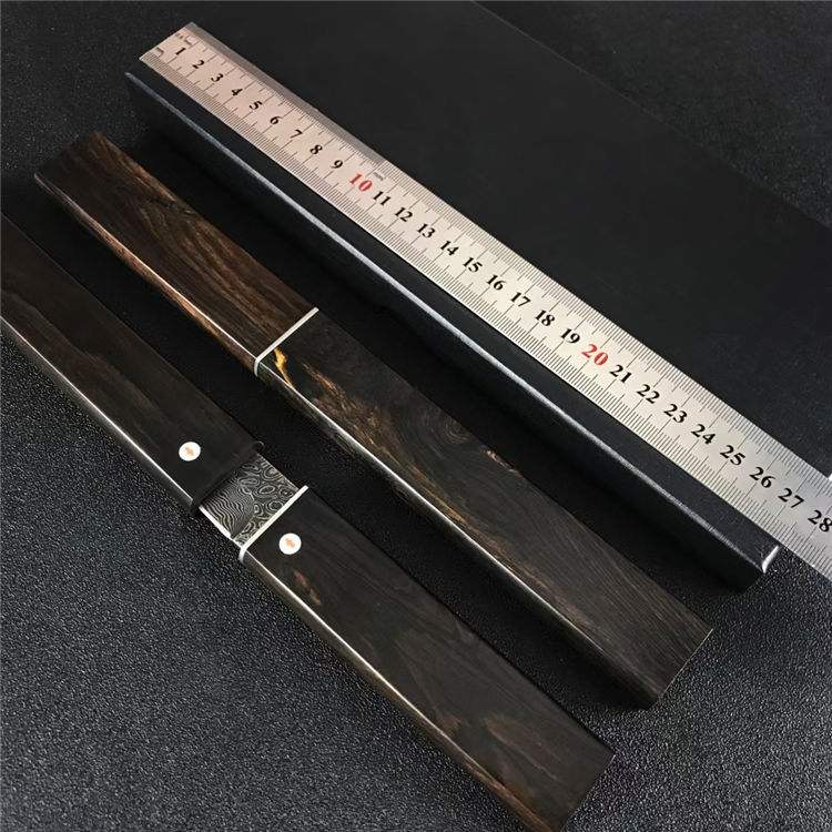 大马士革黑刃黑旋风直刀 全长:261mm 刃长:140mm 柄长:114mm 钢材:VG10大马士革 柄材:黑檀木 刀厚:3.8mm 刃宽:24.5mm 硬度:60-61HRC 表面处理:黑色原色 净重:162g 毛重:约345G(包含盒子和刀套) 包装:黑色礼品盒