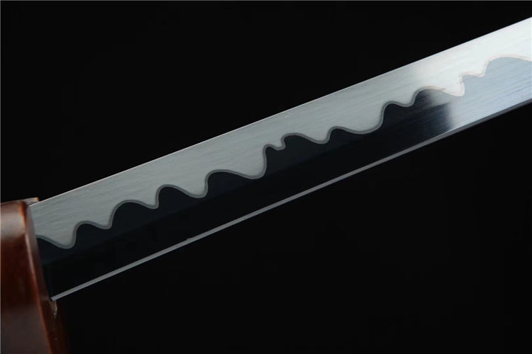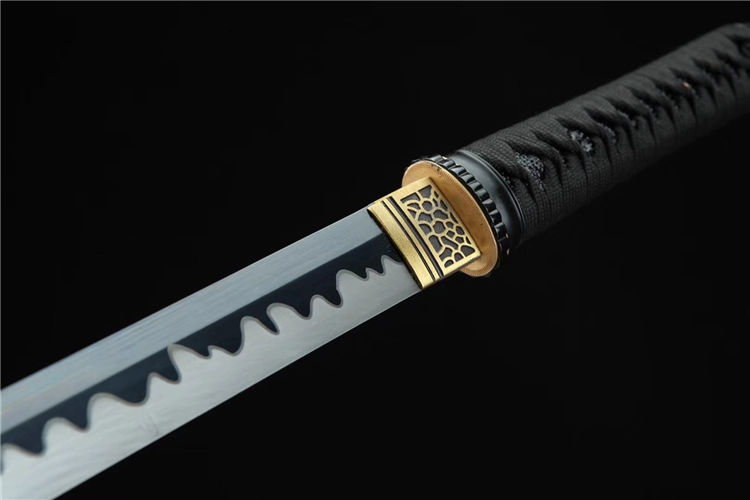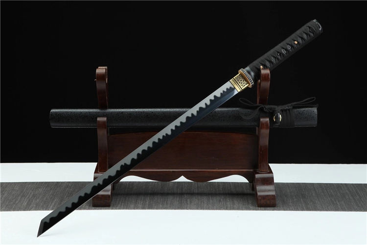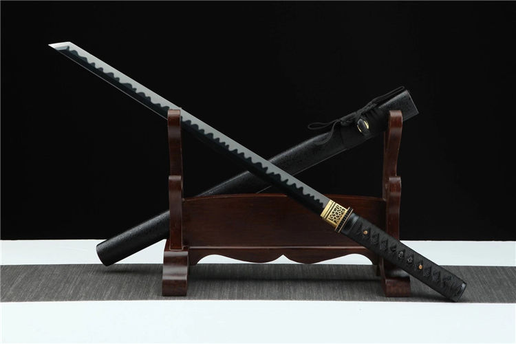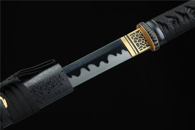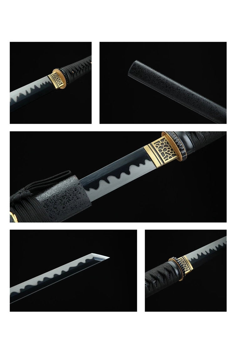 黑魔中款武士刀 总长:78cm 刃长:51cm 柄长:21cm 刃宽:3.2cm 刃材:高锰钢 工艺:高温发黑,油淬手工推磨 鞘材:磨砂点漆鞘 装具:合金 柄:仿鱼皮 配置:锦盒,刀油