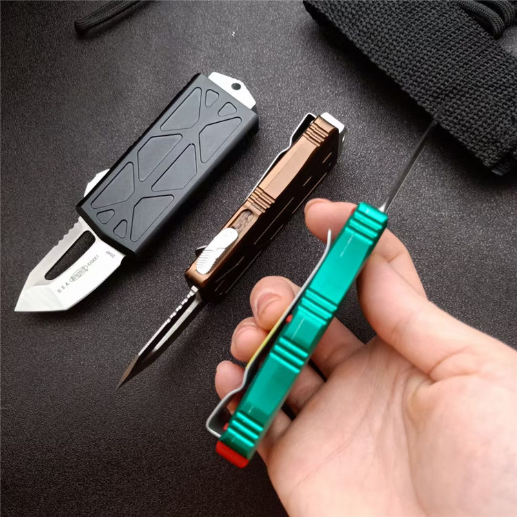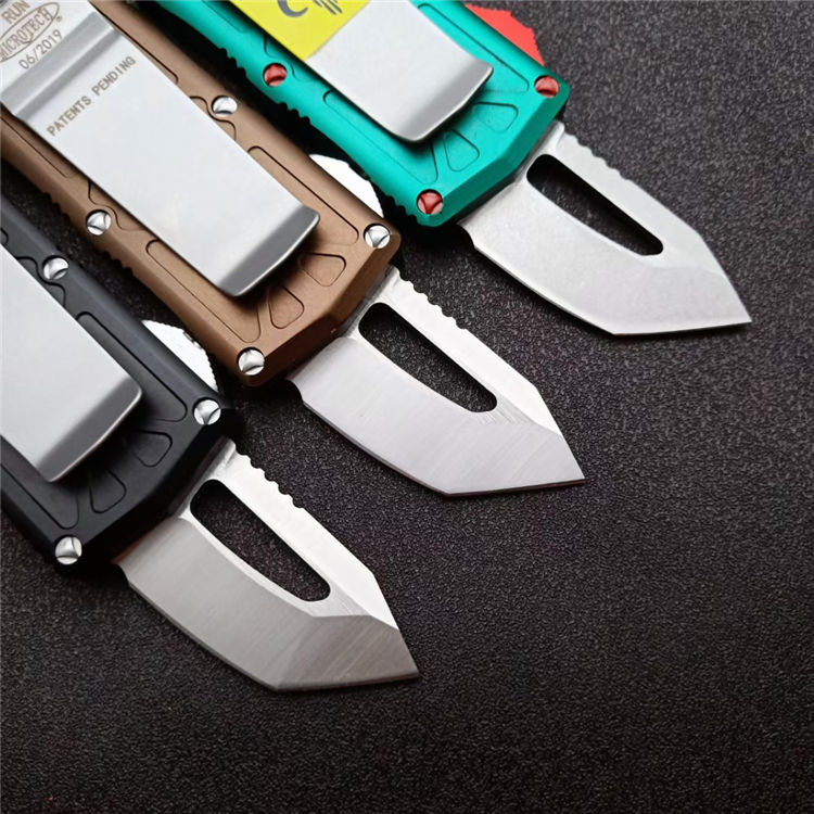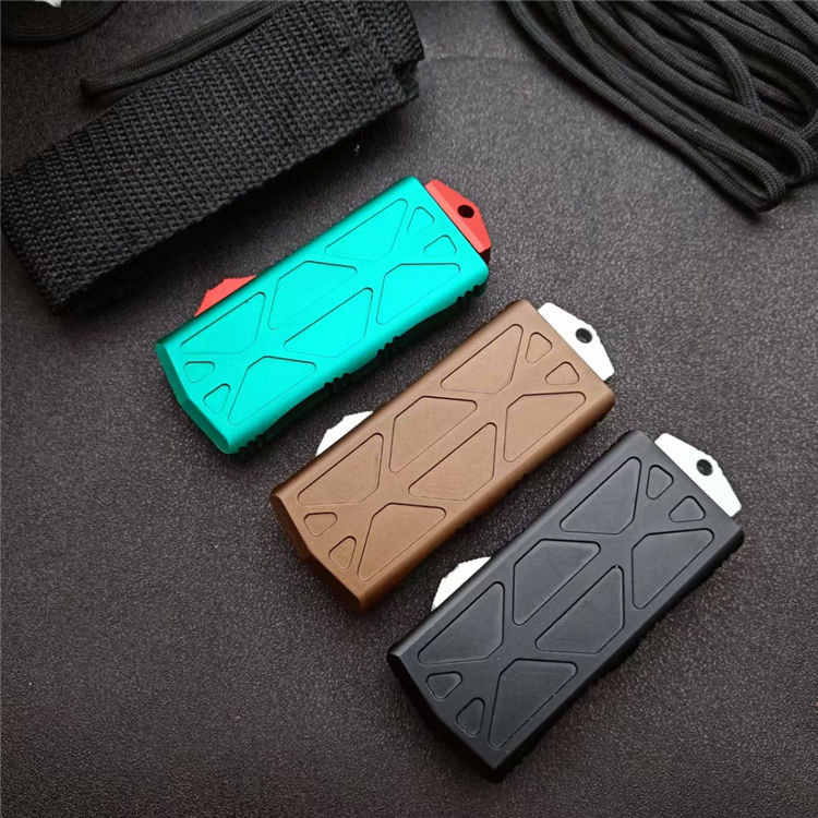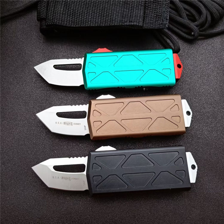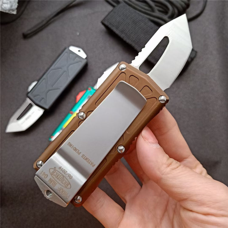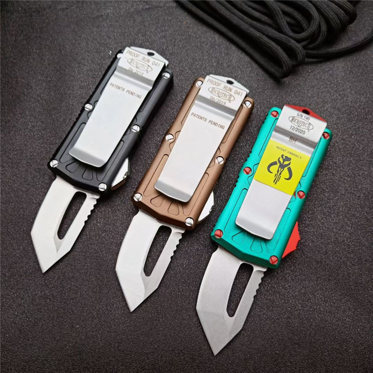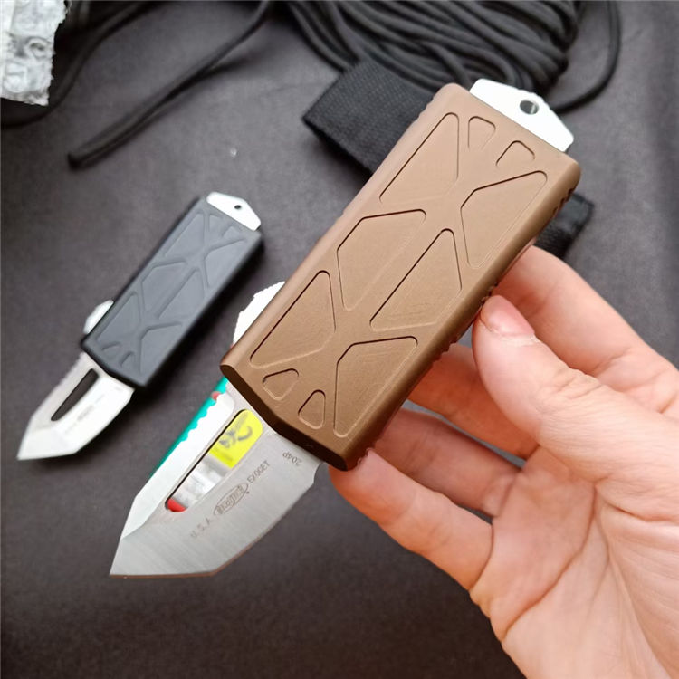 微技术T版飞鱼直出跳刀 全长:14.4cm 刃长:5cm 柄长:9.4cm 刀厚:2mm 刃宽:27.5mm 刀刃:D2 手柄:T6-6061航空铝合金 硬度:58-59 HRC 净重:94克 包装:盒子