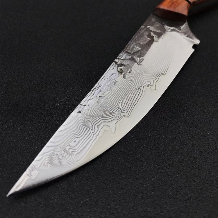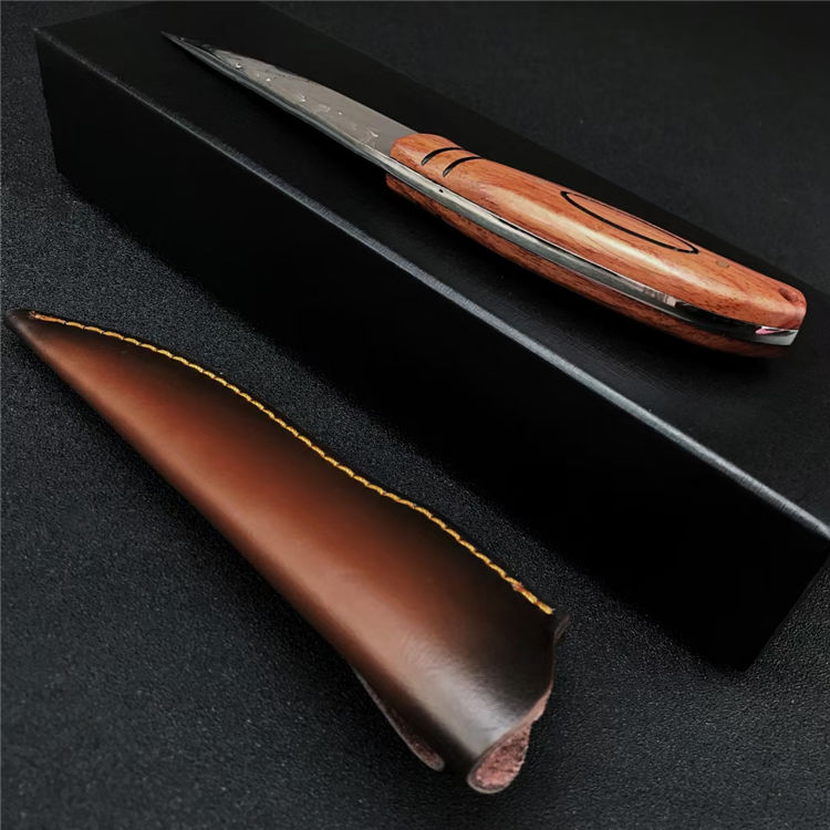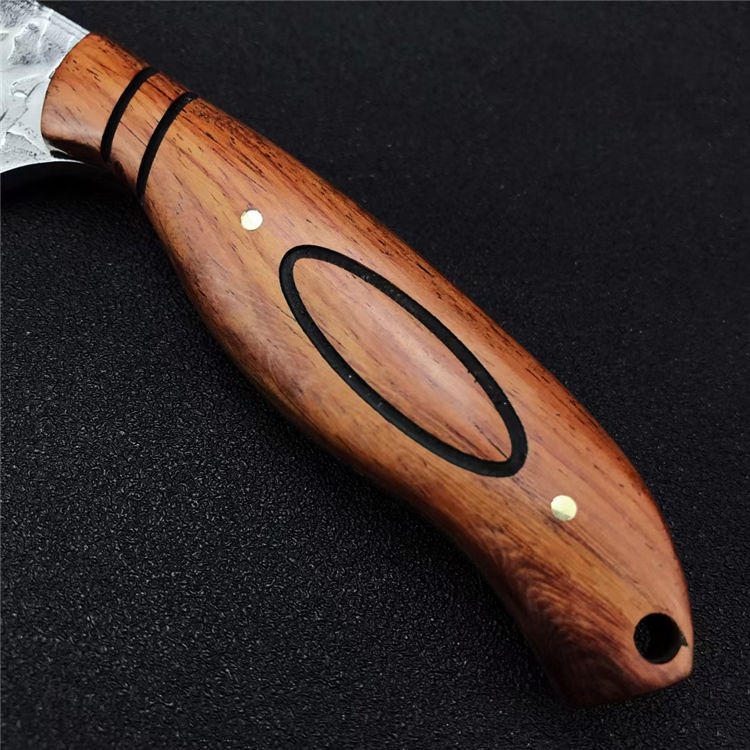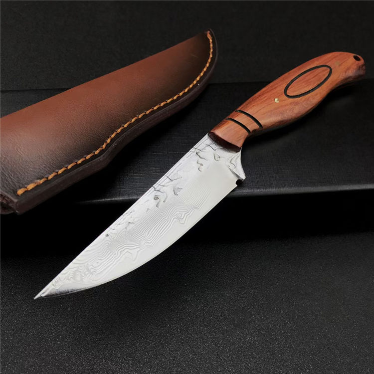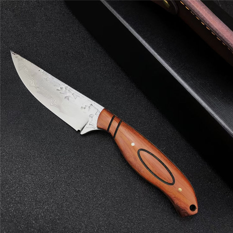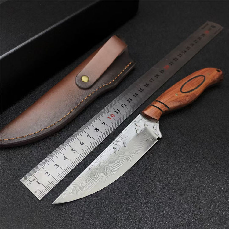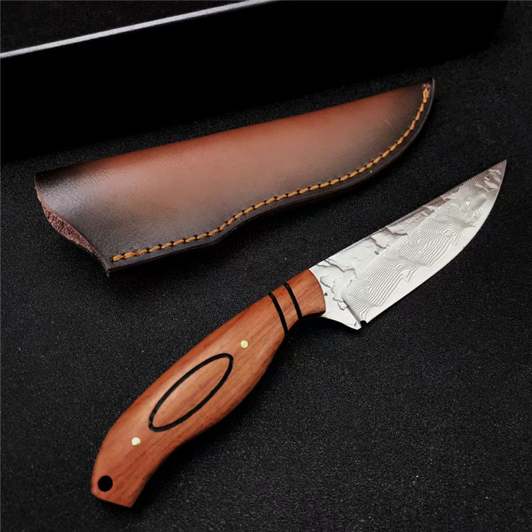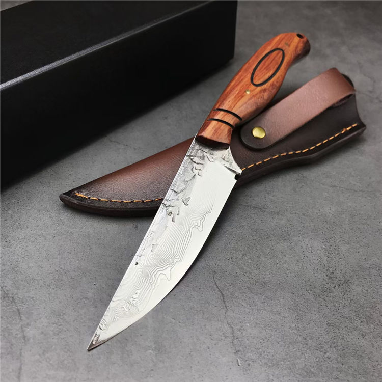 大马士革丹顶鹤猎刀 全长:21.8CM 刃长:11.2CM 刃宽:2.8CM 刃材:折叠锻打大马士革钢 刃厚:4MM 柄长:10.7CM 柄材:天然酸枝木 重量:313G 刀鞘:牛皮鞘