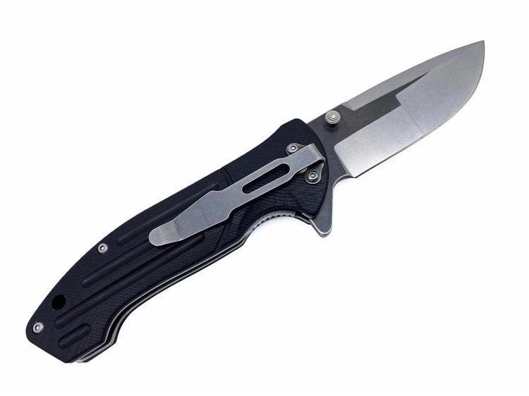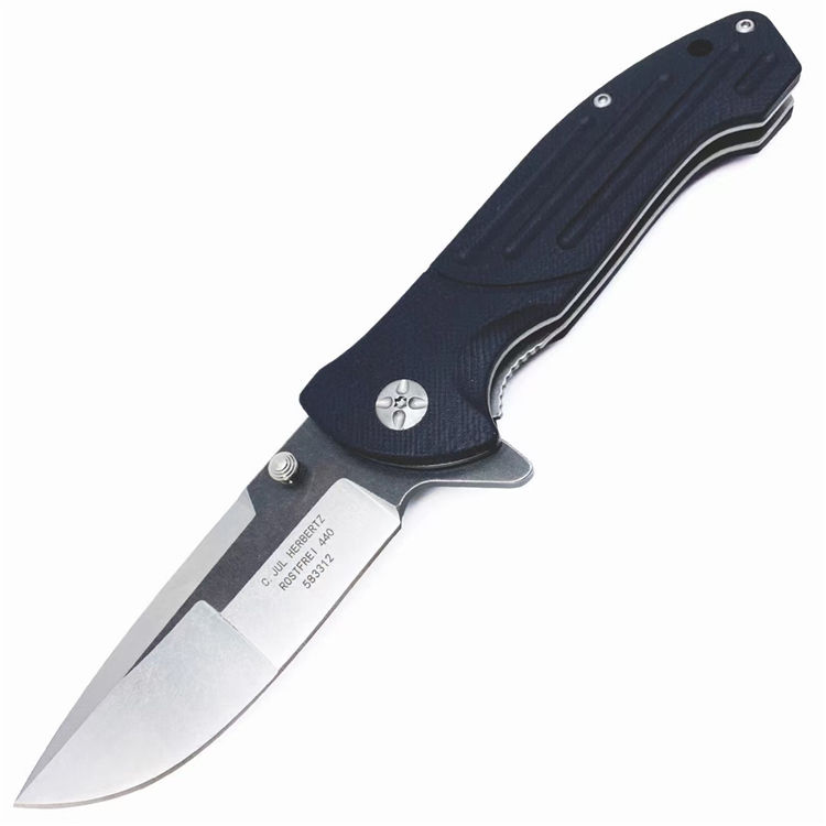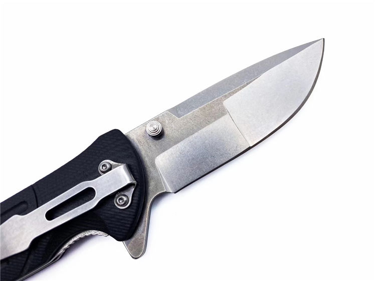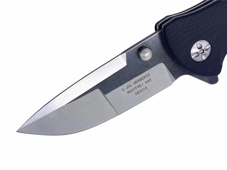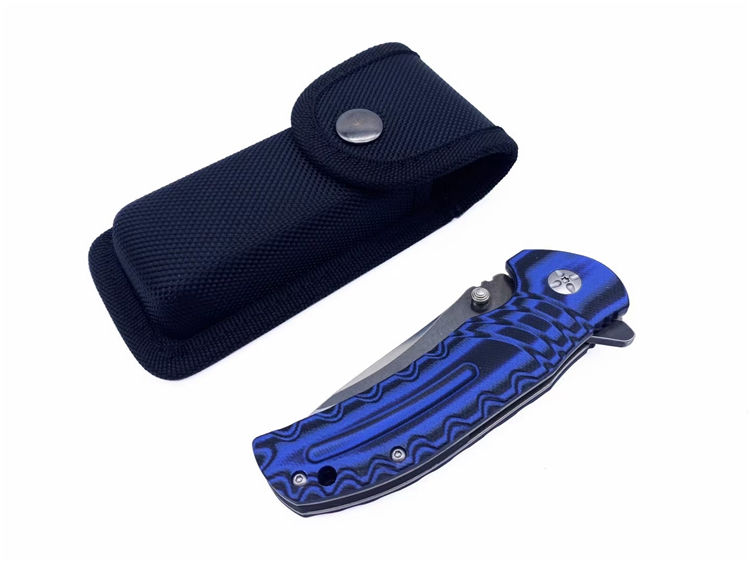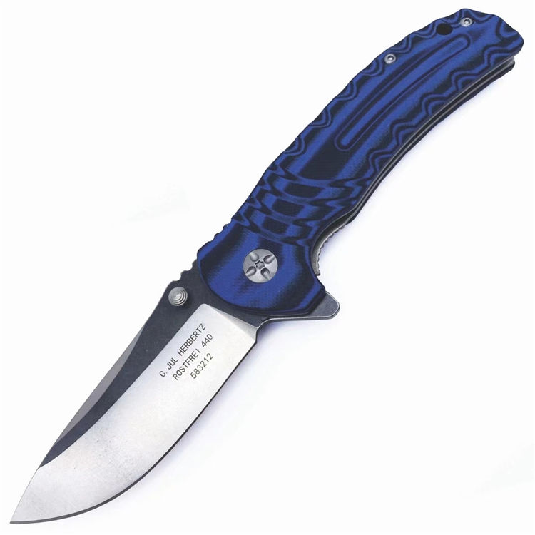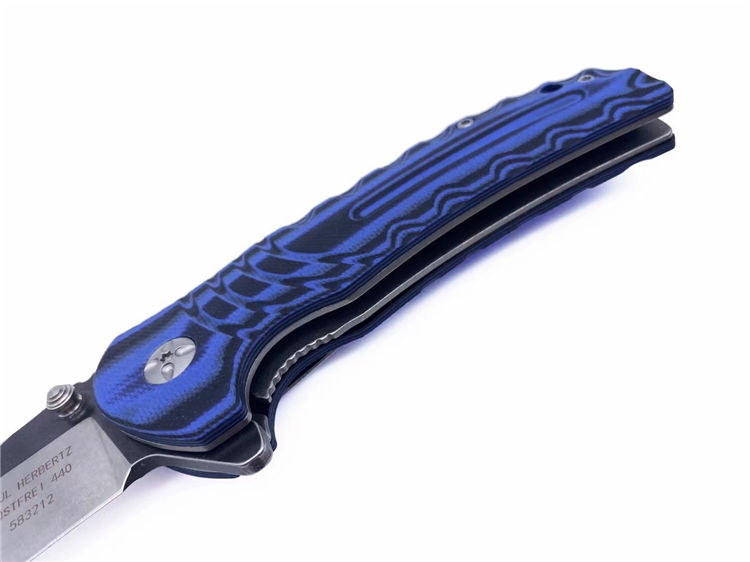 外贸赫伯茨折刀 总长:19.8cm 刃长:8.2cm 柄长:11.5cm 厚度:0.31mm 刃宽:2.9cm 表面处理:石洗 硬度:58HRC 净重:155g 材质:9CR14 内置轴承滚珠系统 柄材:双色G10 其他:配成型尼 龙套:彩盒色装