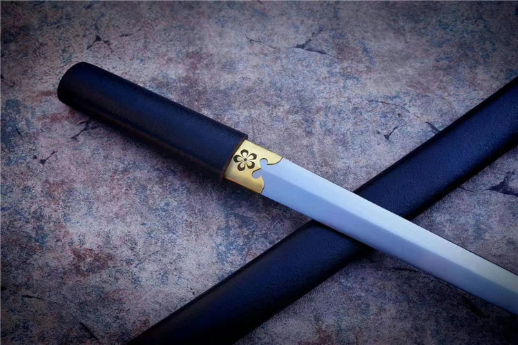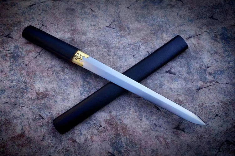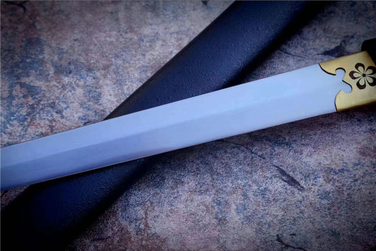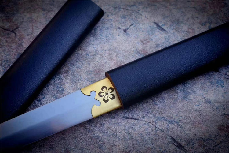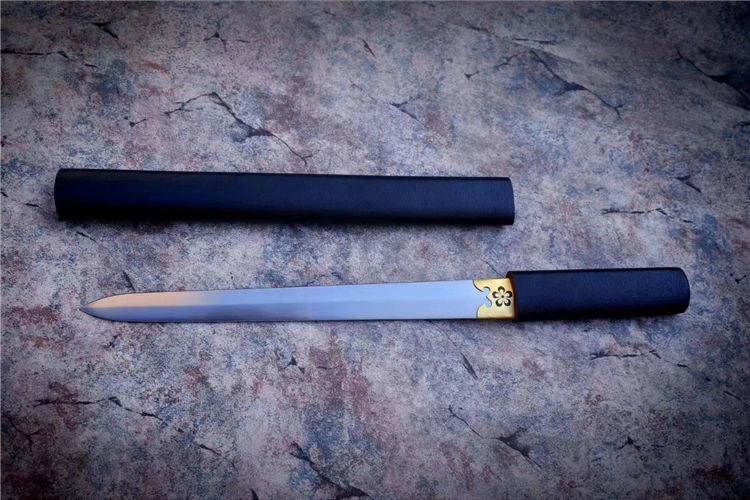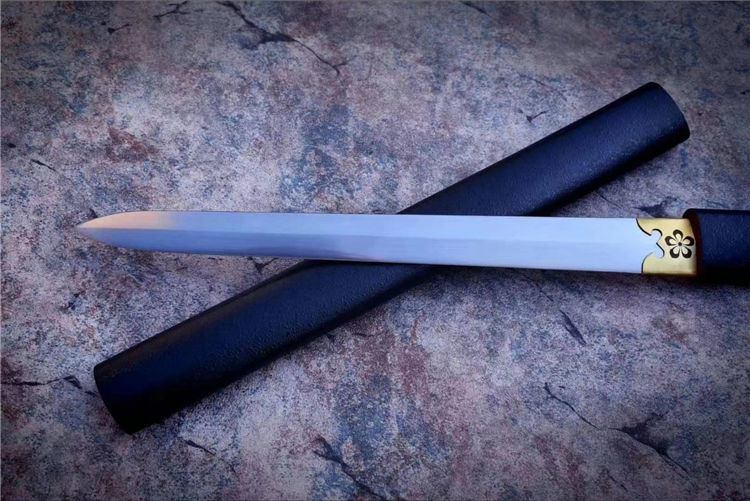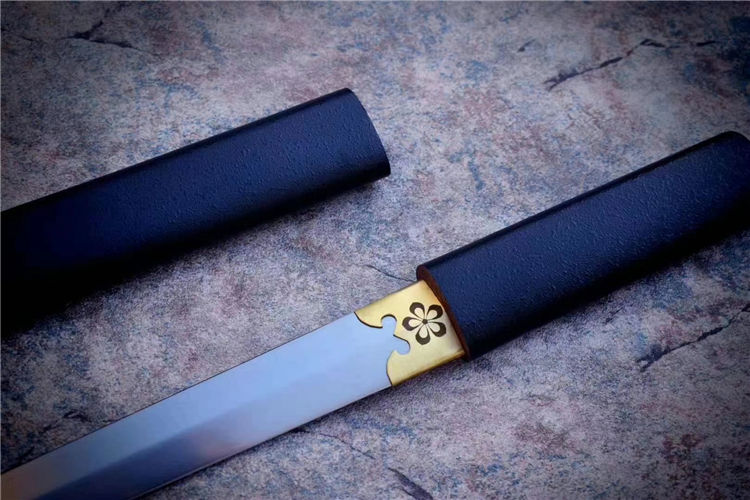 樱花短剑 全长:53cm 刃长:29.5cm 材质:高锰钢锻造 手工研磨,手工包铜剑镞,雕刻传世家徽,鞘为实木上漆,一款非常适合收藏把的一体短剑