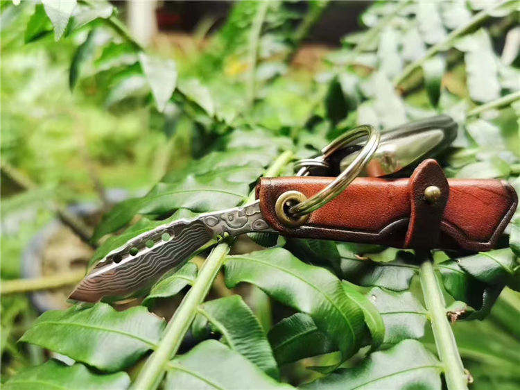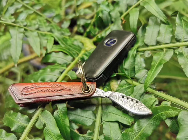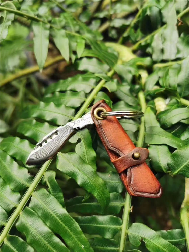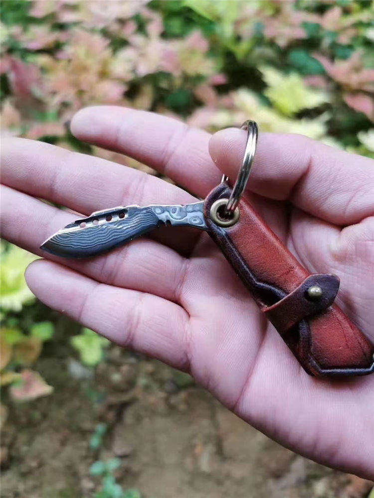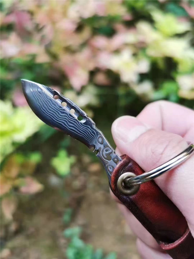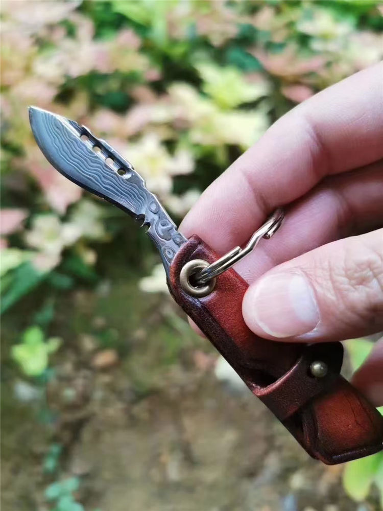 大马士革匙扣小狗腿 全长:6.5cm 刃长:3.7cm 刃宽:1.9cm 厚度:2.5mm 刃材:进口锻造大马士革VG10钢,凹弧形刀刃表面 硬度:60HRC 专业高温真空热处理 开刃方式:手工研磨三道工序开刃,锋利为主 皮套:意大利进口植鞣皮纯手工皮刀套与刀柄连接可折叠,复古,怀旧风格