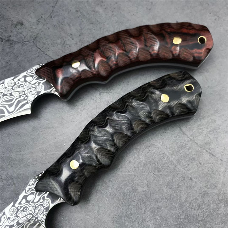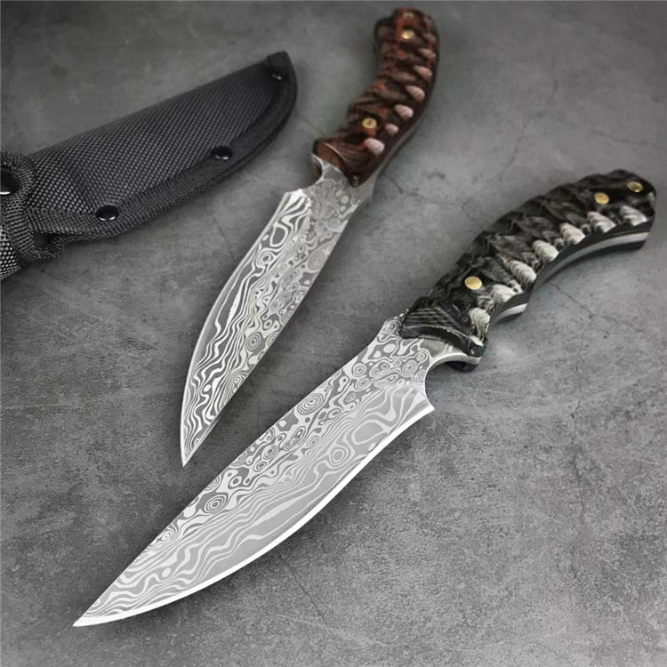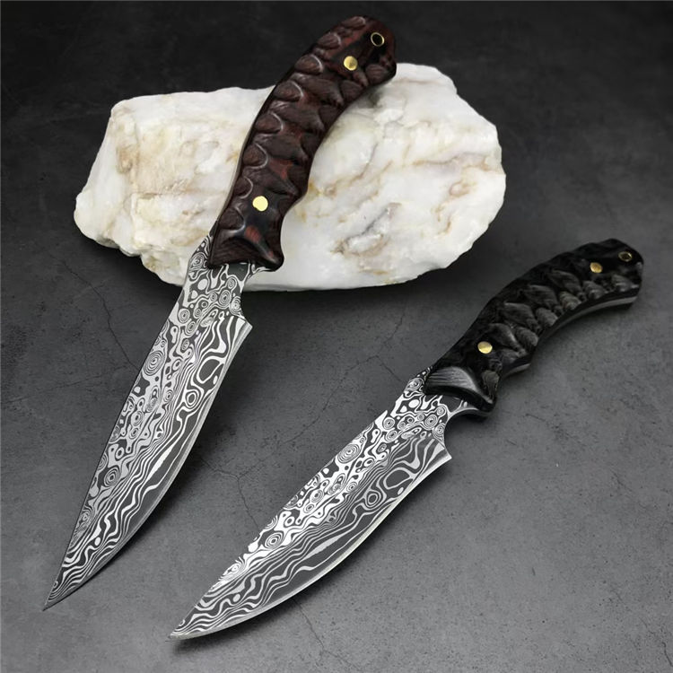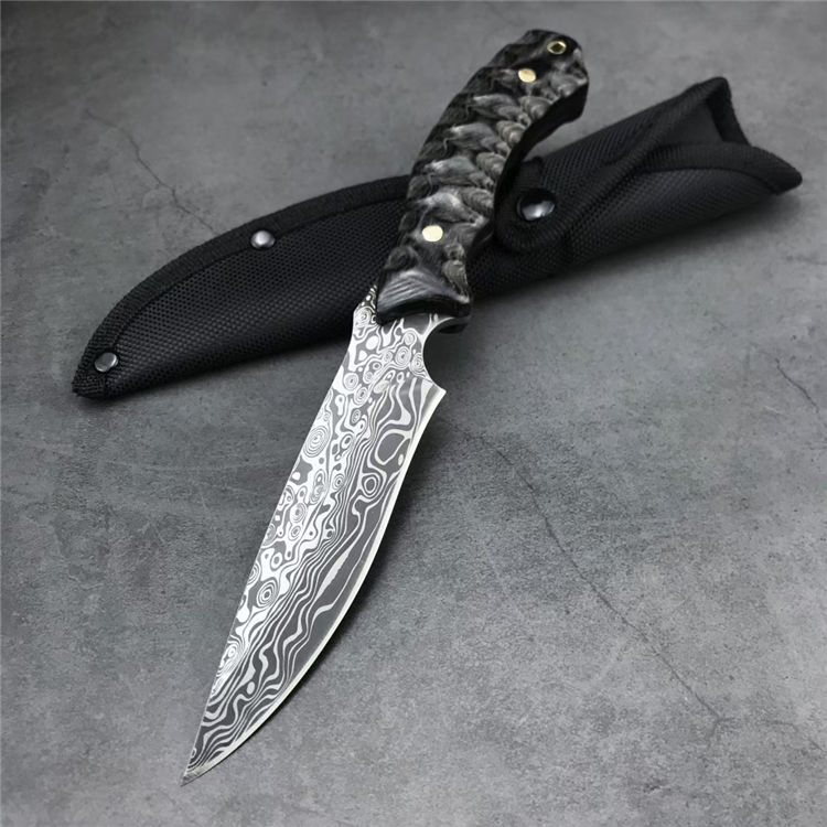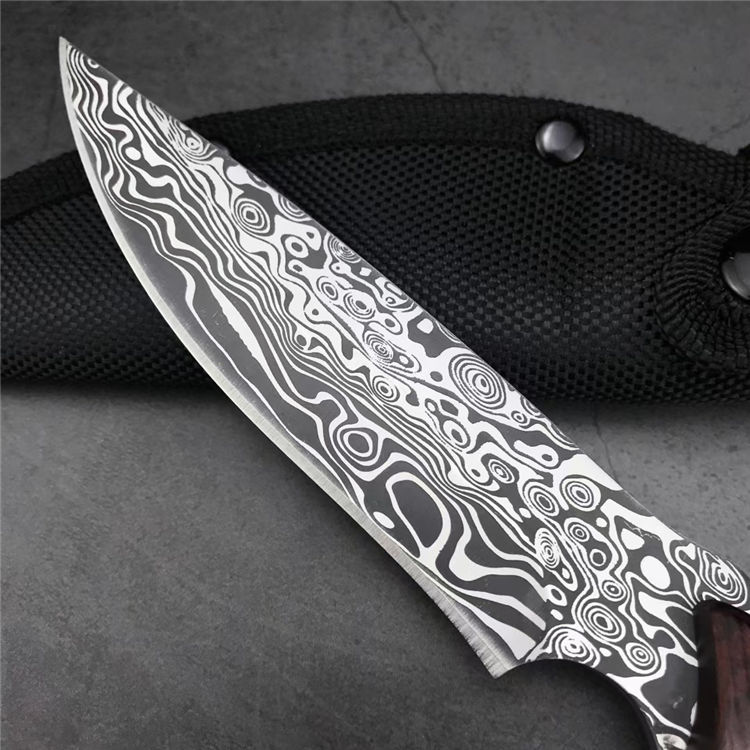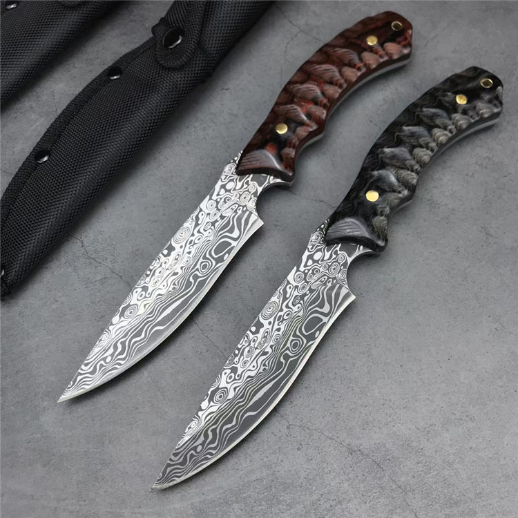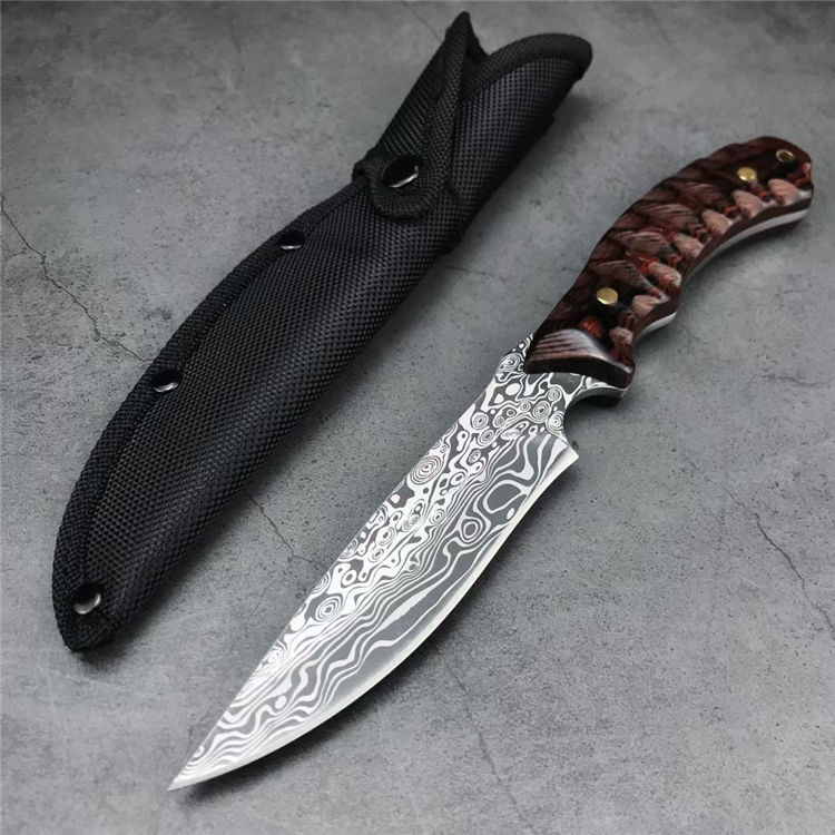 石龙小猎直刀 全长:24.2CM 刃长:12.6CM 刃宽:2.9CM 刃材:440C激光纹 刃厚:3MM 柄长:11.6CM 柄材:彩木 重量:236G 刀鞘:尼龙鞘