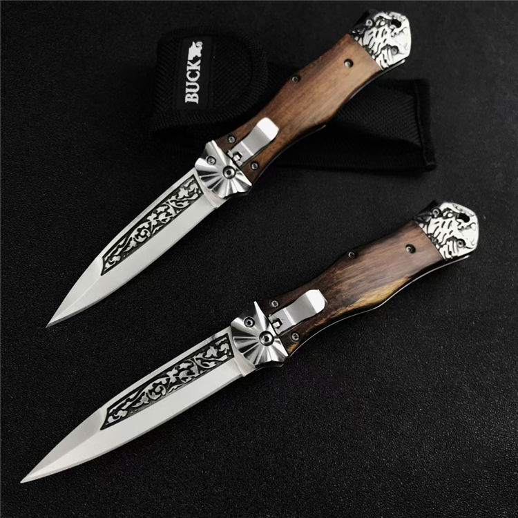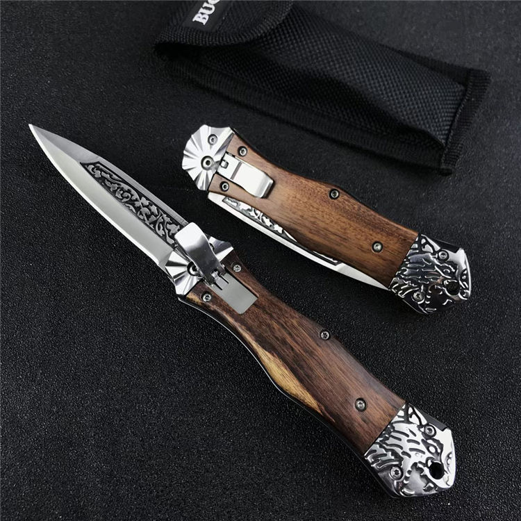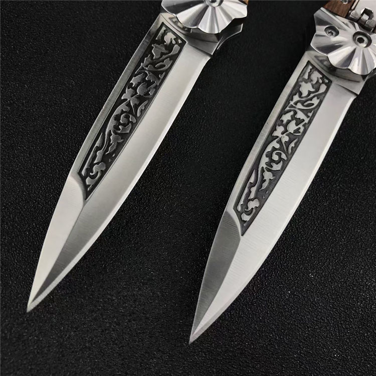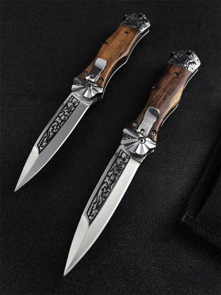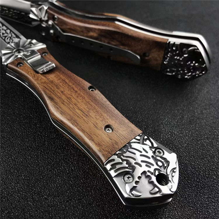 弹弹虎侧开跳刀 全长:20.8CM 刃长:8.8CM 刃材:7CR13MOV 刃宽:2CM 刃厚:3MM 柄长:12CM 柄材:鸡翅木+不锈钢精雕 重量:196G