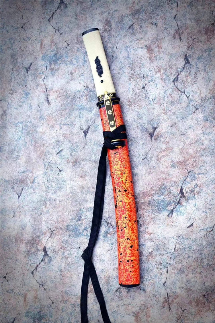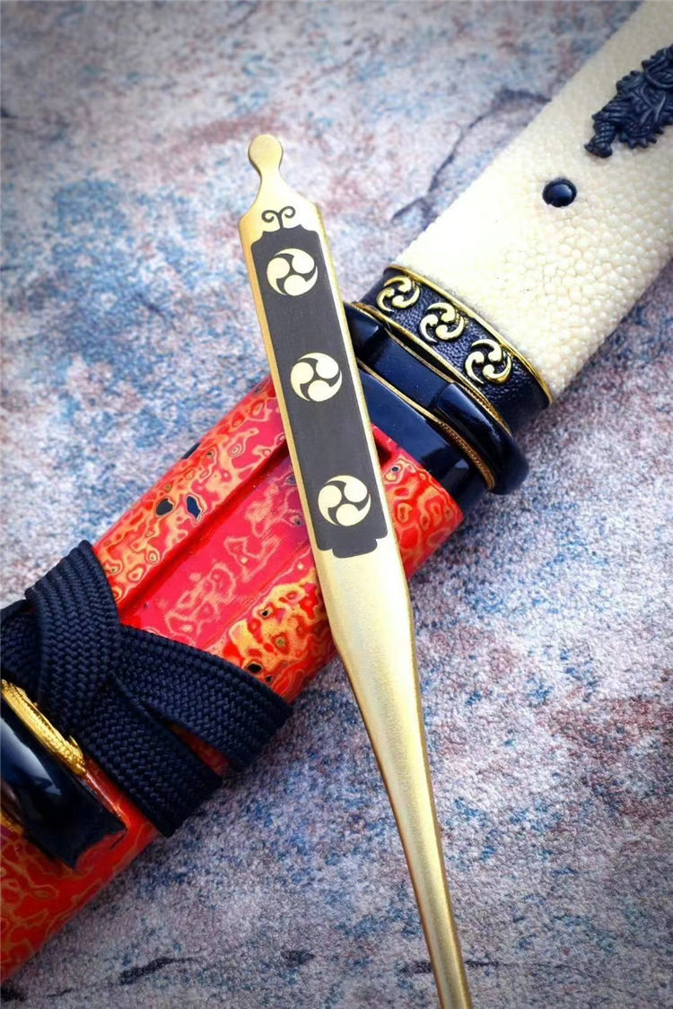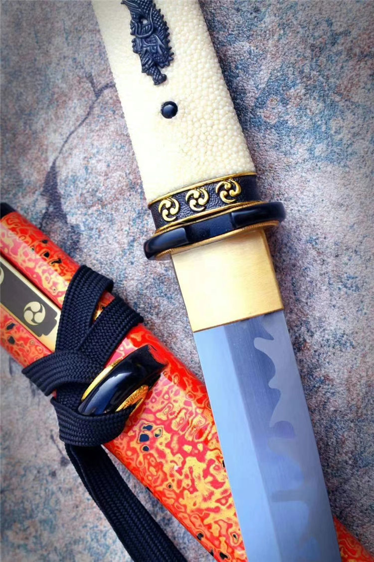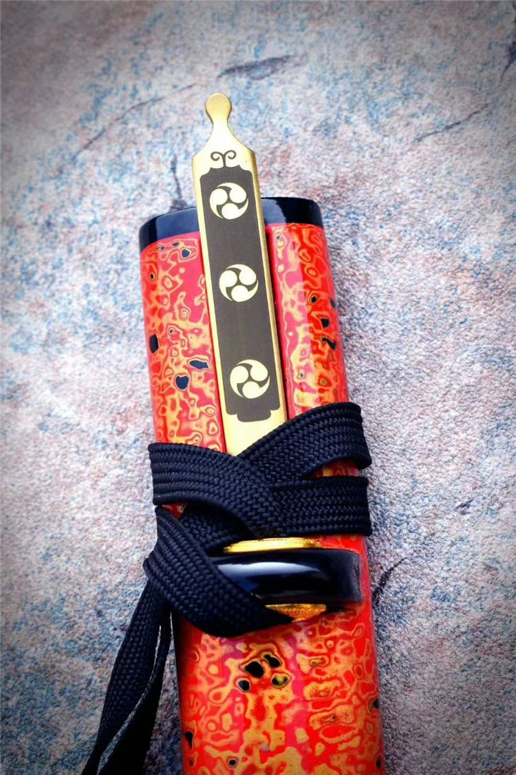 炎龙武士刀 全长:51.7cm 刃长:29.7cm 刃材:高碳钢锻造 手工化妆研磨,高性能,纯铜刀镞,纯铁镡,鎏金配饰,柄为实木包裹泰国进口一级珍珠鱼皮,镶嵌水牛角,手工制作水牛角铆钉固定刀身,鞘为实木手工打磨上大漆,配笄,制作工艺相当费时,是居家把玩收藏佳品