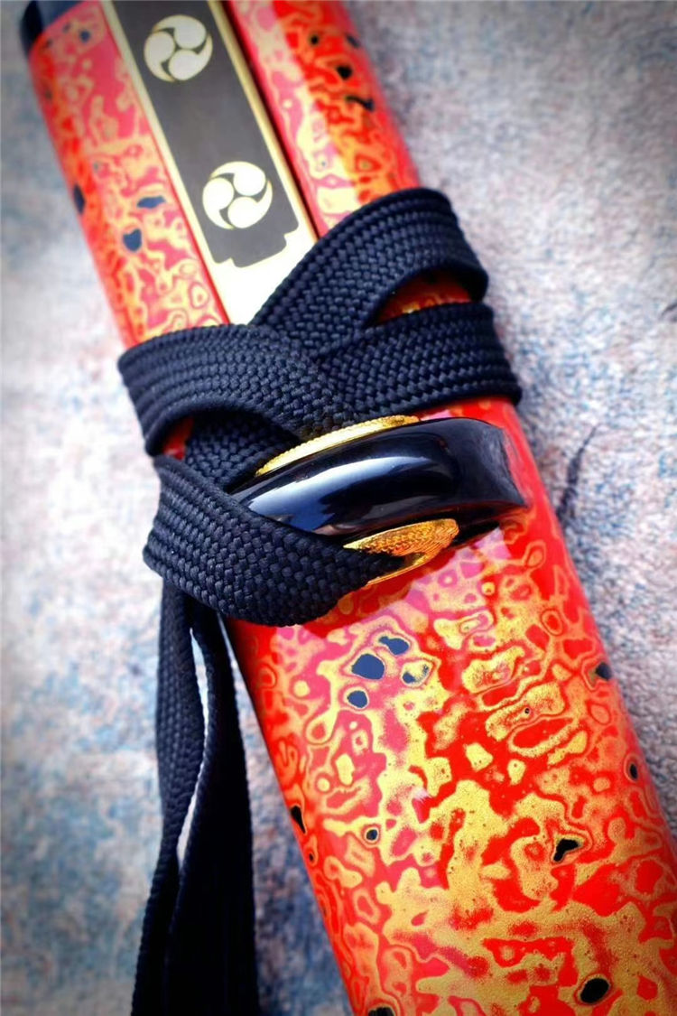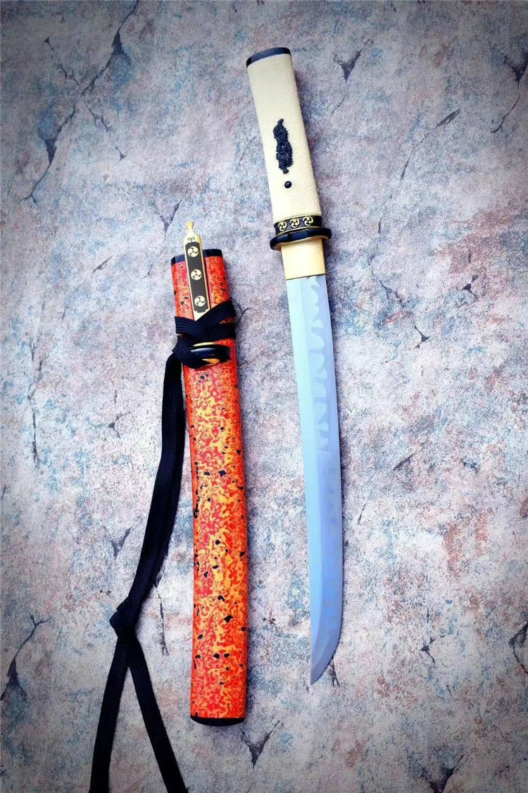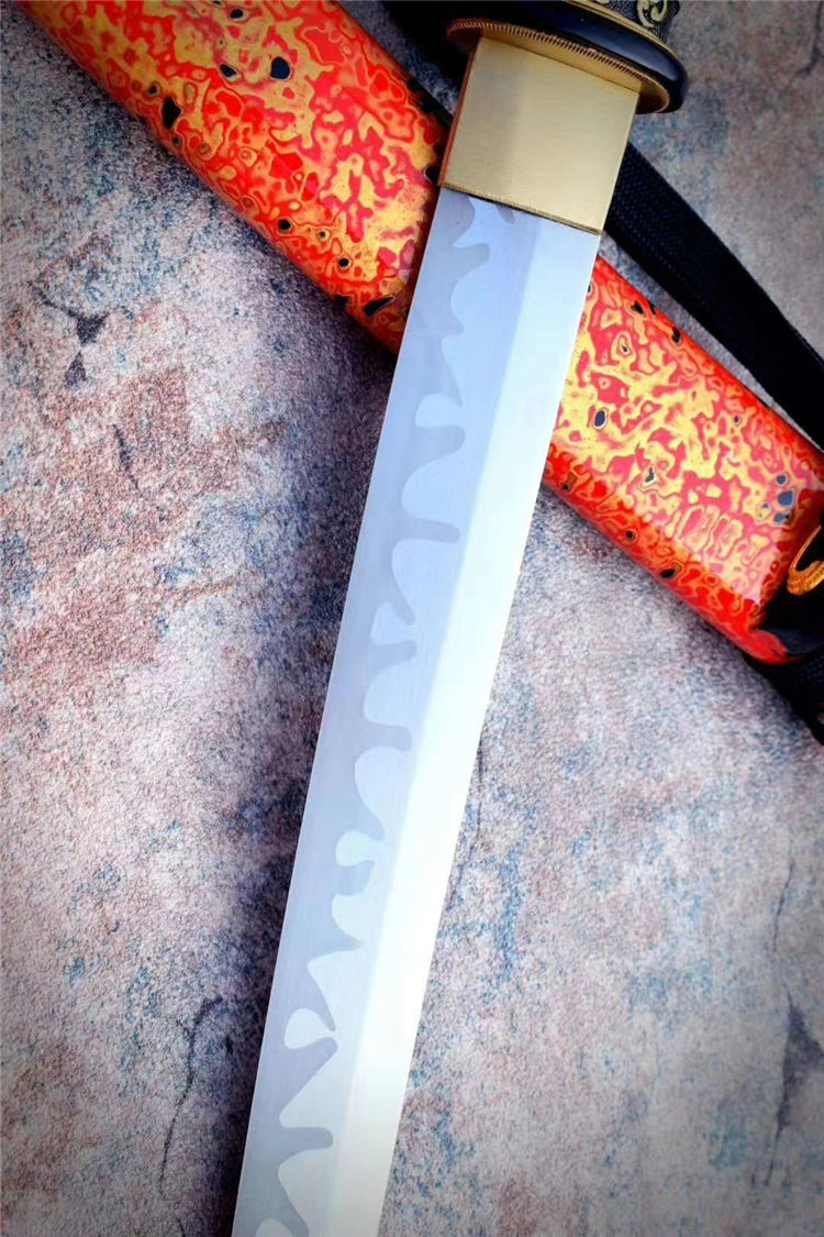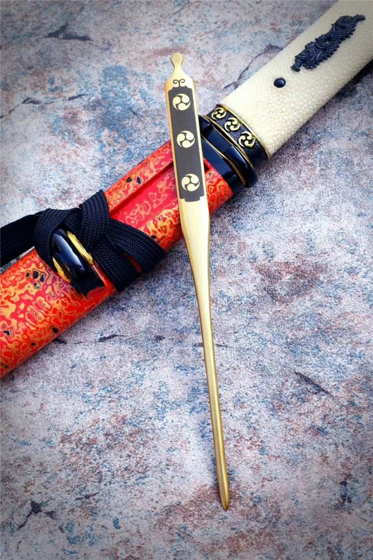 炎龙武士刀 全长:51.7cm 刃长:29.7cm 刃材:高碳钢锻造 手工化妆研磨,高性能,纯铜刀镞,纯铁镡,鎏金配饰,柄为实木包裹泰国进口一级珍珠鱼皮,镶嵌水牛角,手工制作水牛角铆钉固定刀身,鞘为实木手工打磨上大漆,配笄,制作工艺相当费时,是居家把玩收藏佳品