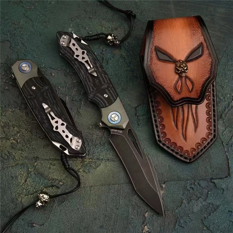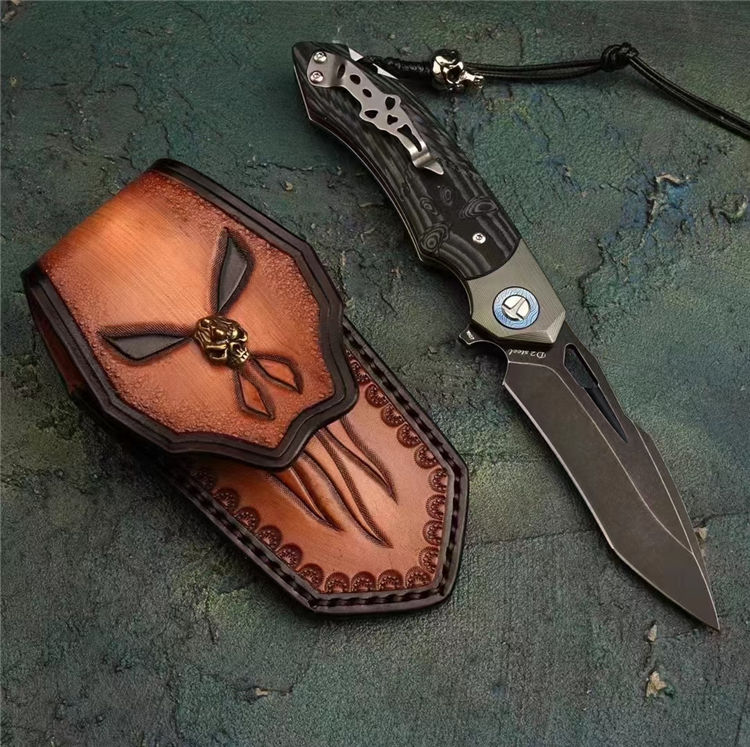D2骷髅之王石洗折刀 品牌:TURENZ徒人 名称:骷髅之王定制版 总长:21cm 刃长:9.8cm 刃宽:2.4cm 刃厚:3mm 柄材:钛大马垫圈+TC4钛合金复古工艺绿+双色G10手工雕刻 钢材:进口D2钢公司提供真材实料支持光谱认证 硬度:60-61HRC 热处理:专业真空深冷热处理刀刃 表面处理:石洗效果 净重:141G 夹子:成型合金钢裤袋夹 开刃方式:专业水冷多次工艺开刃 包装:复古手工包装盒子 配件:原厂配装饰绳子+骷髅吊坠