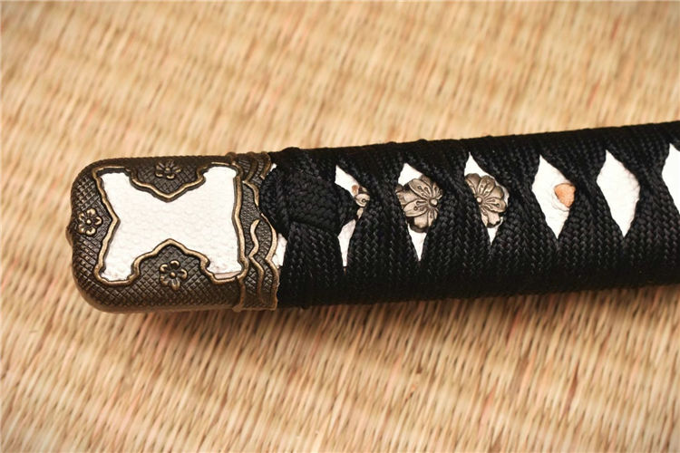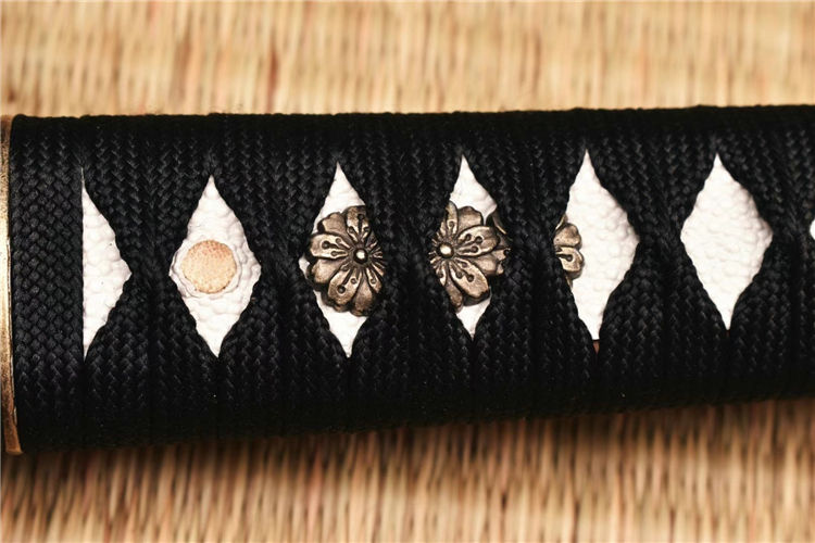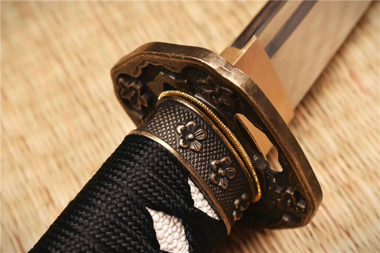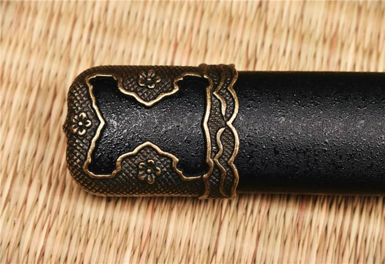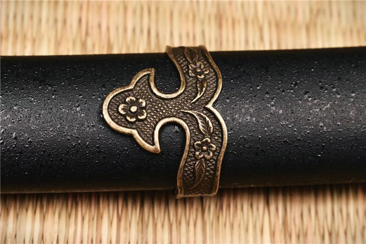 手工开槽研磨,装具为锌合金,鞘实木喷漆缠宽下绪,纯铜刀镞,刀柄实木缠绳