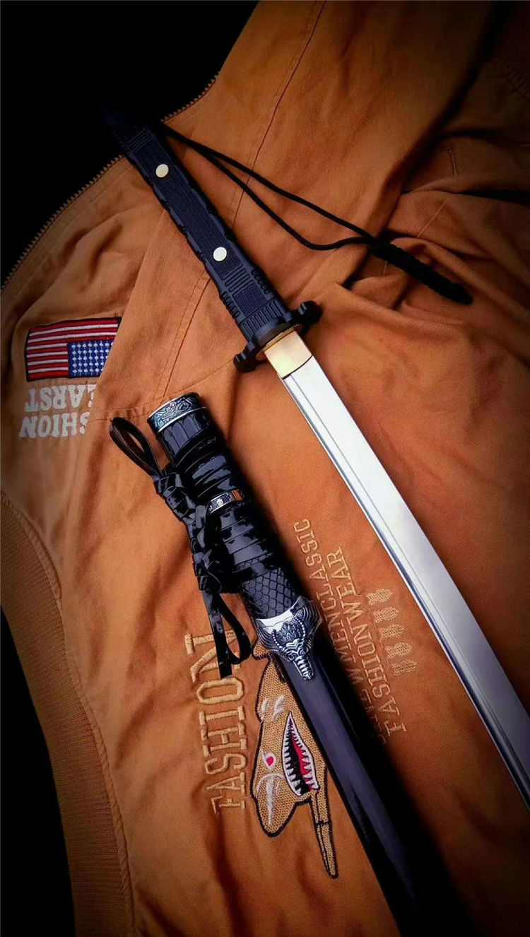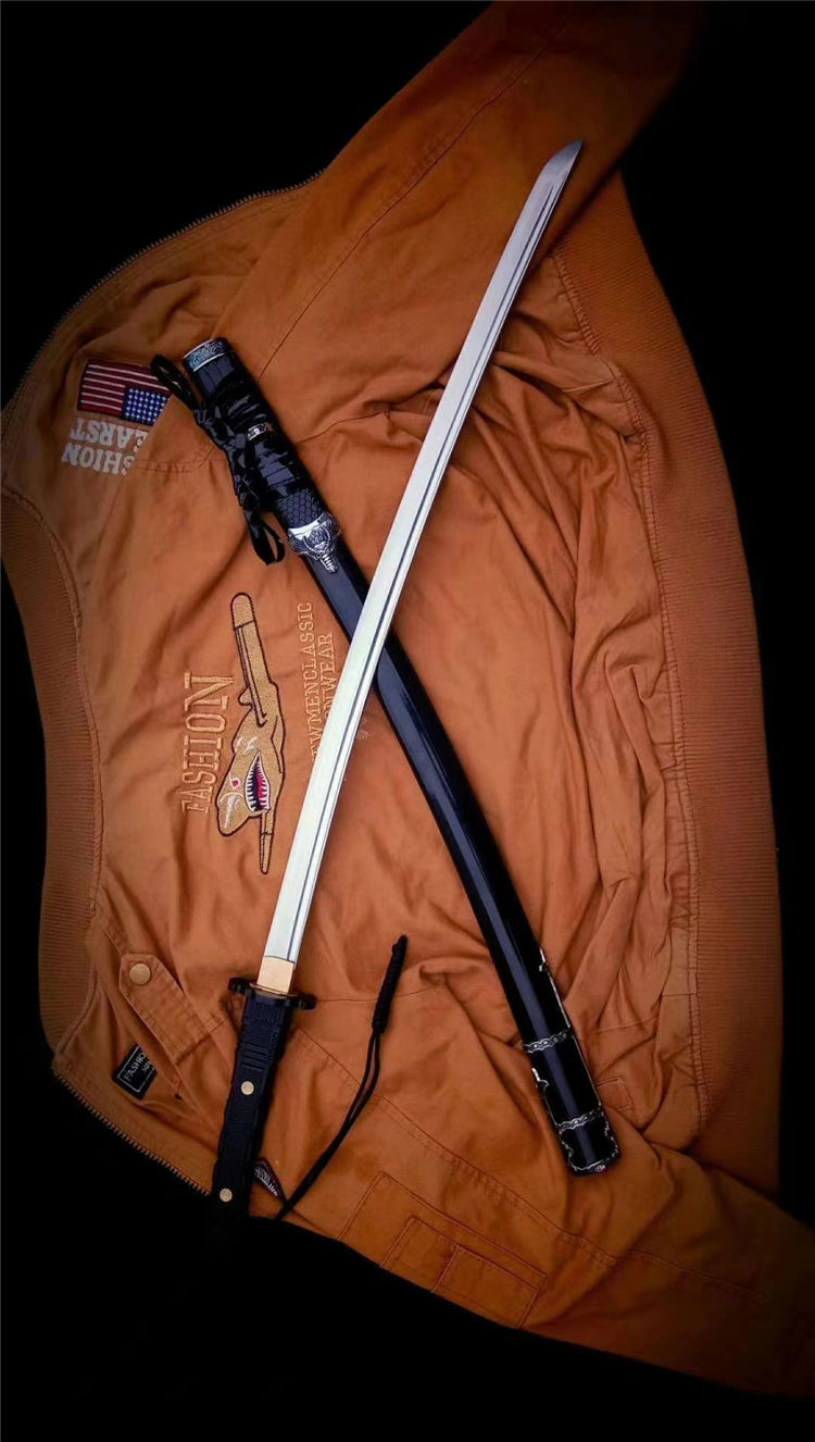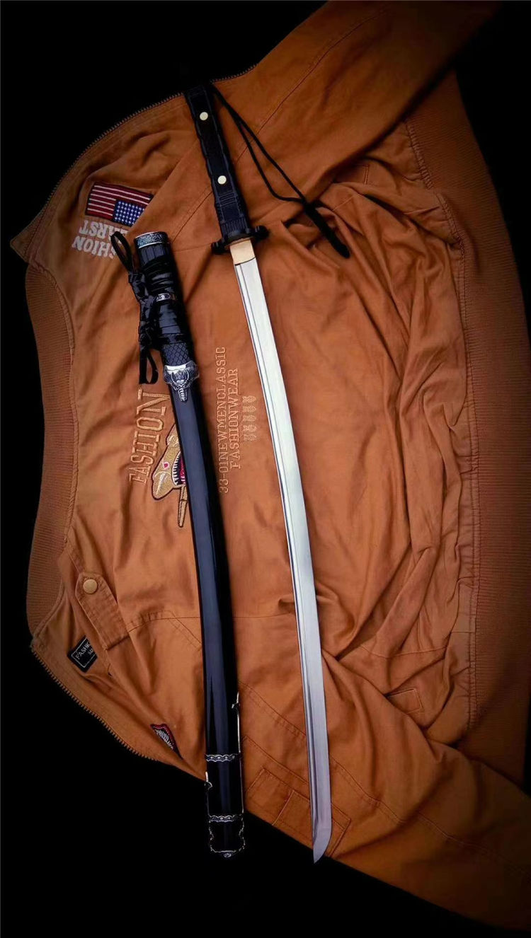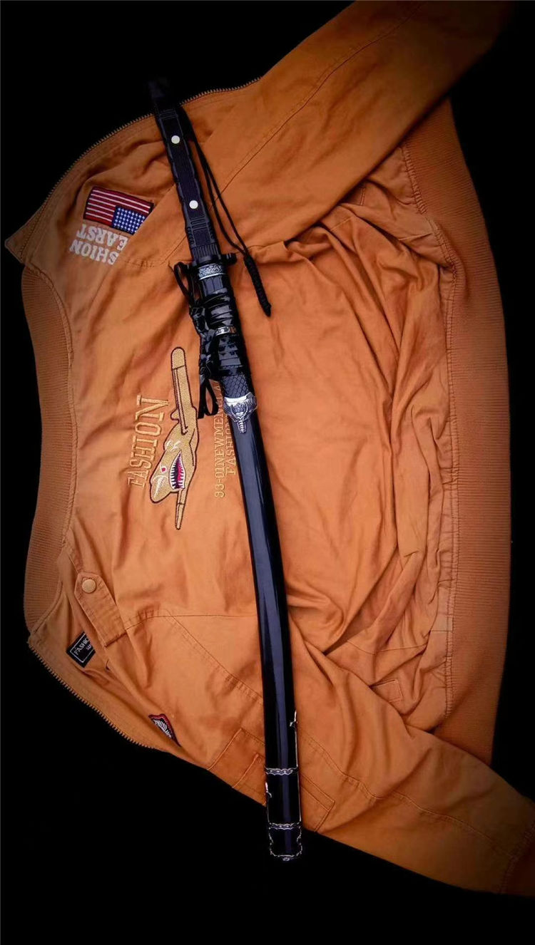 手工开槽,表面为镜面手工拉丝处理, 鞘为高强度聚合树脂,上漆,手工雕刻配饰,一款非常适合收藏把玩的武士刀