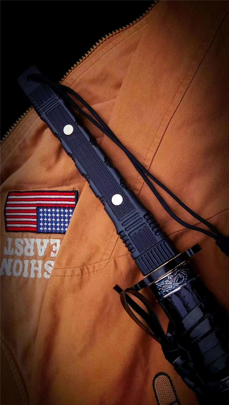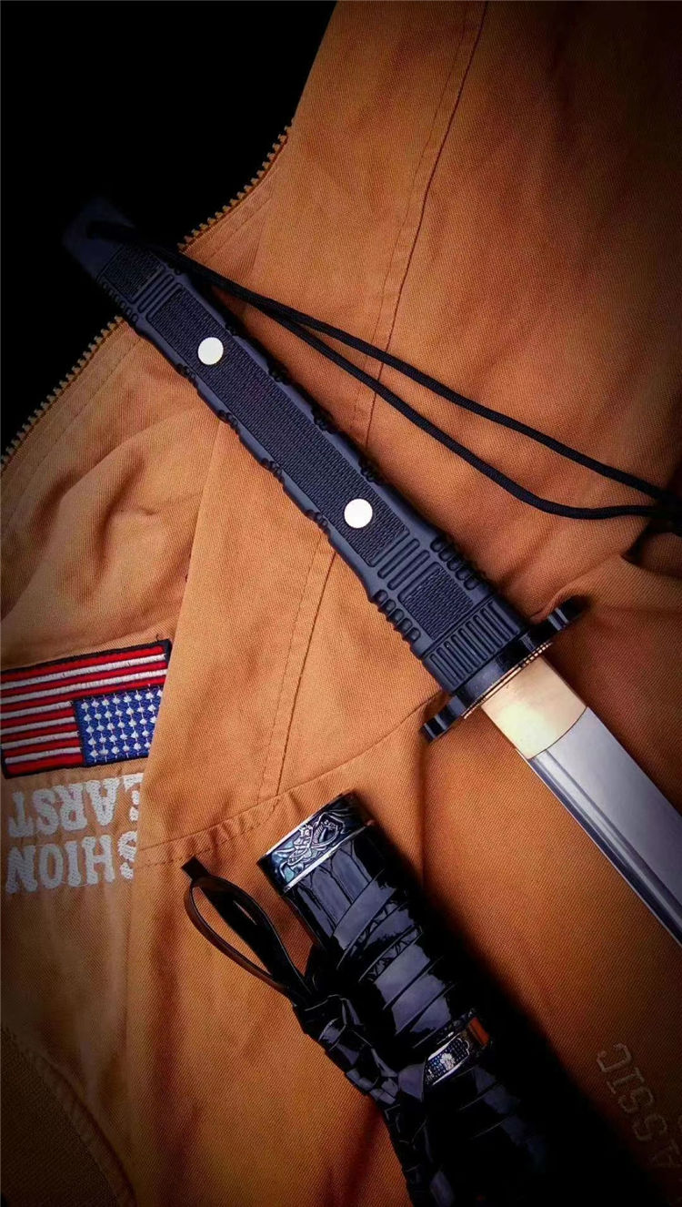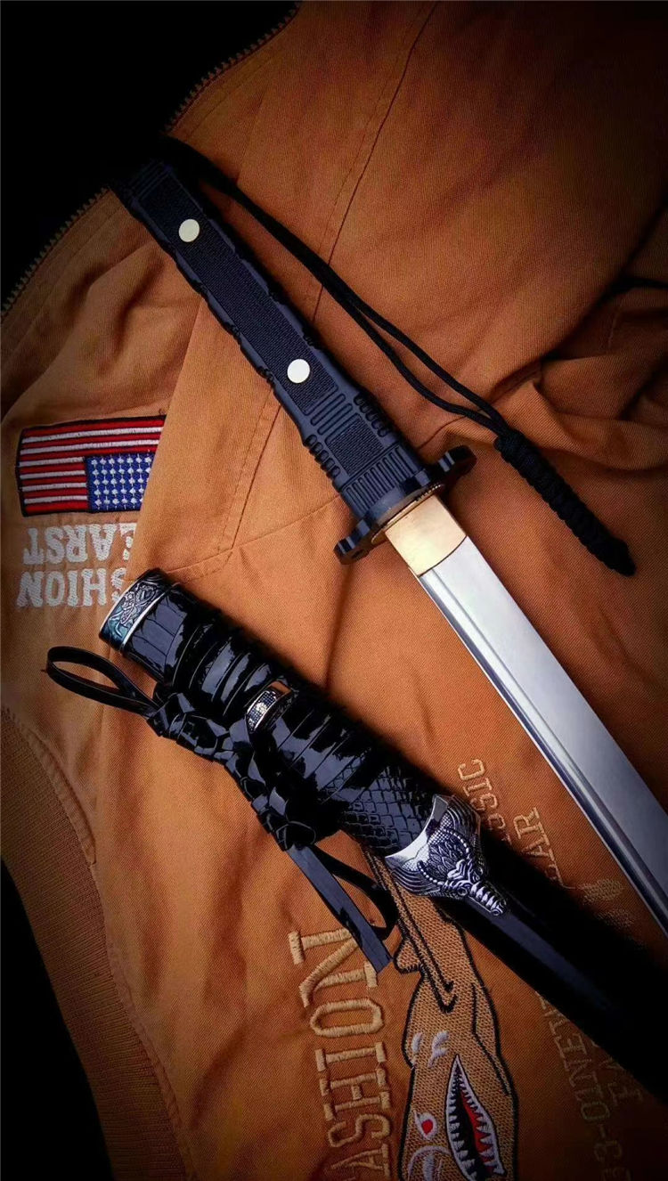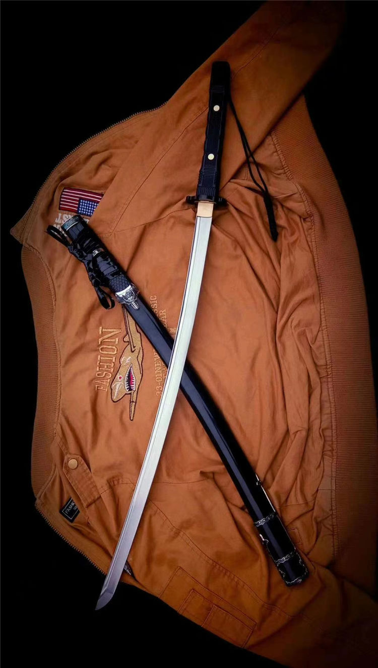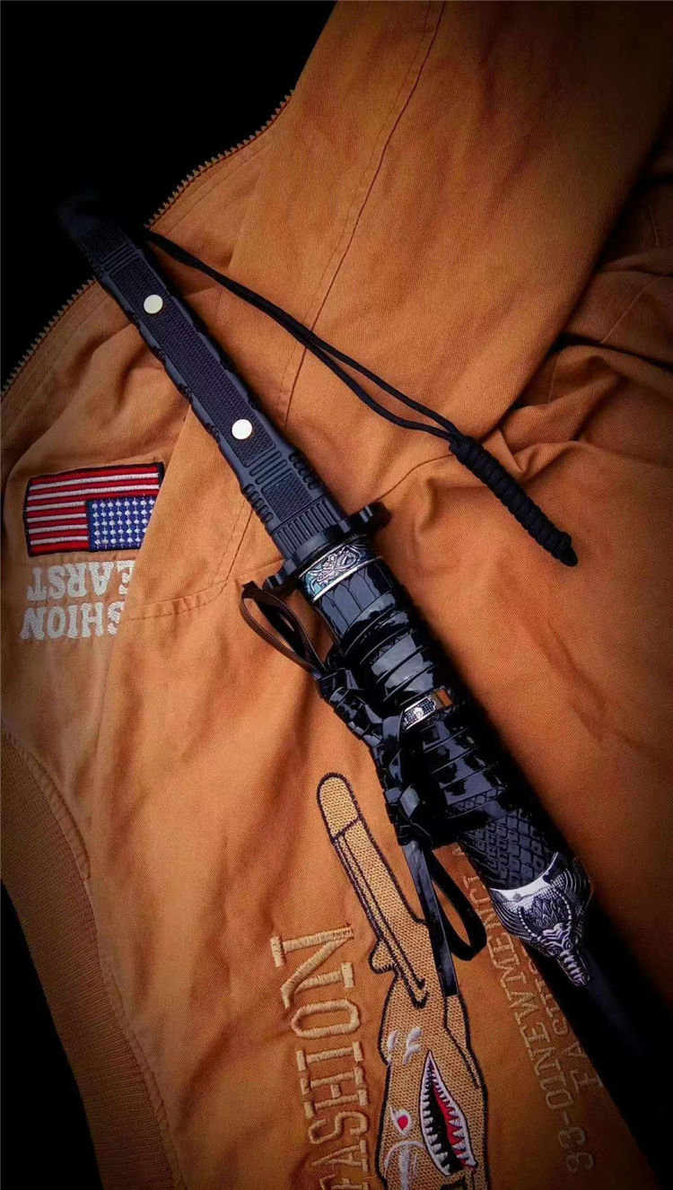 手工开槽,表面为镜面手工拉丝处理, 鞘为高强度聚合树脂,上漆,手工雕刻配饰,一款非常适合收藏把玩的武士刀