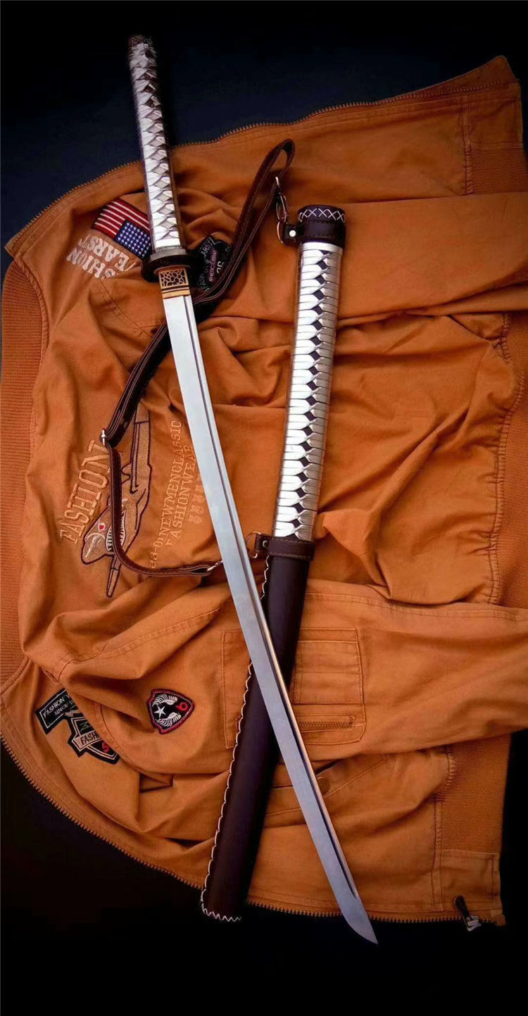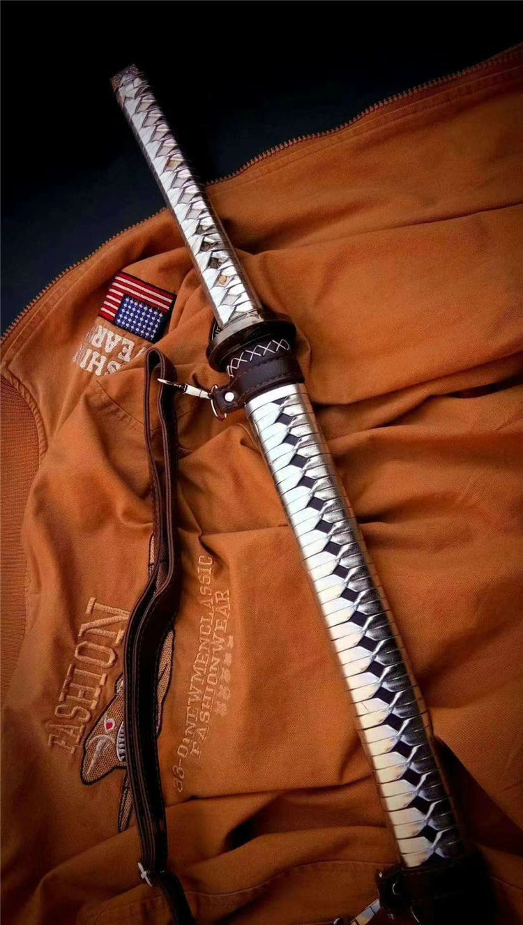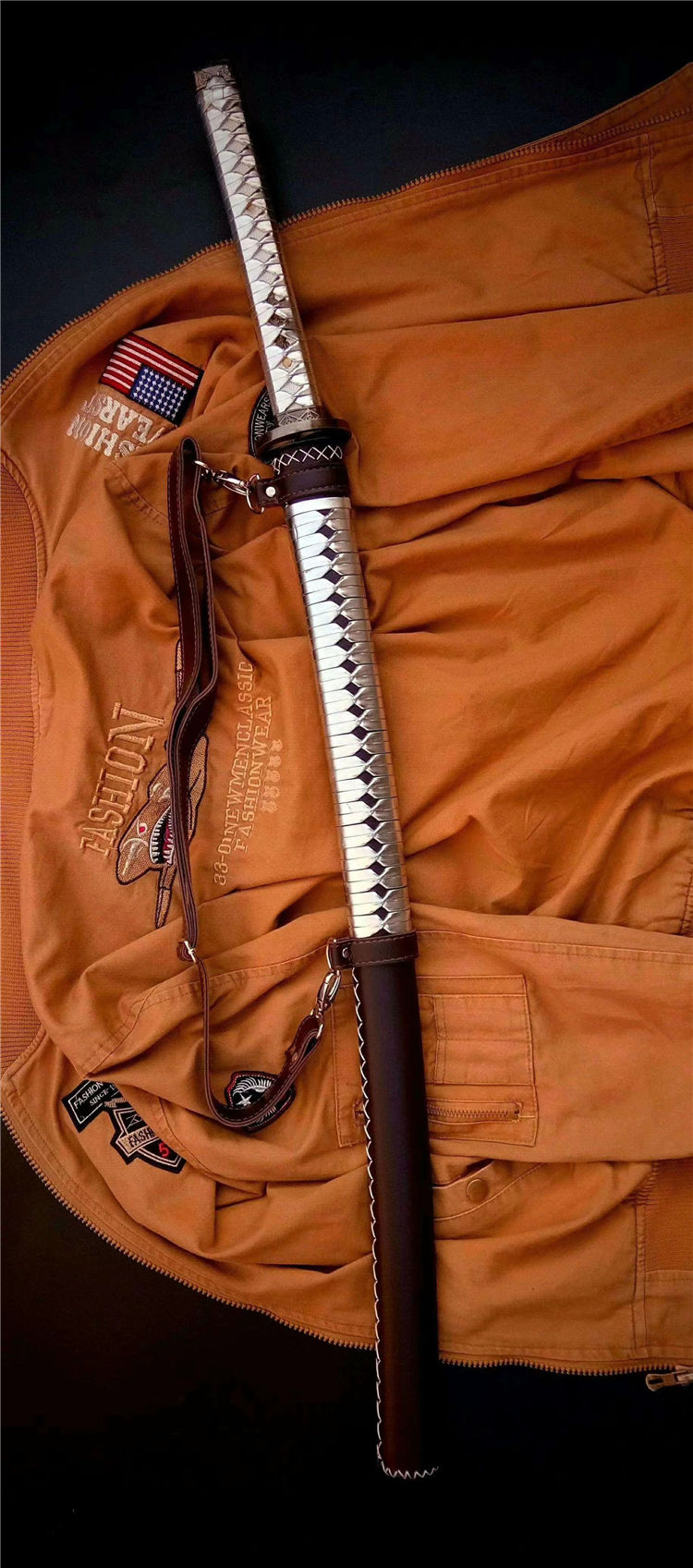 行尸走肉米琼恩武士刀 全长:104cm 刃长:72cm 材质:高锰钢锻造 手工开槽,研磨开刃,配石纹刀镞,刀鞘为实木裹皮,刀柄缠绳,合金配饰