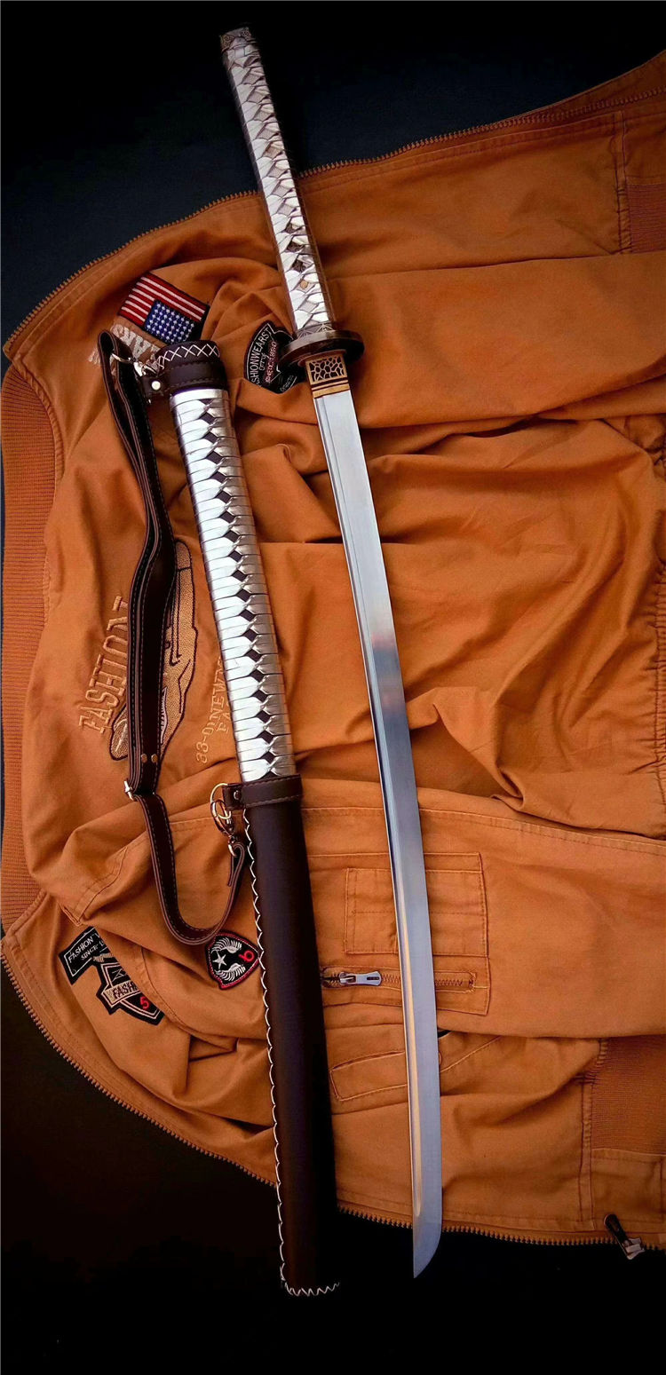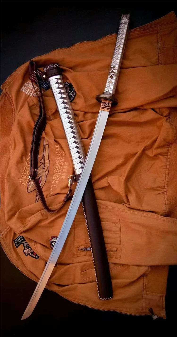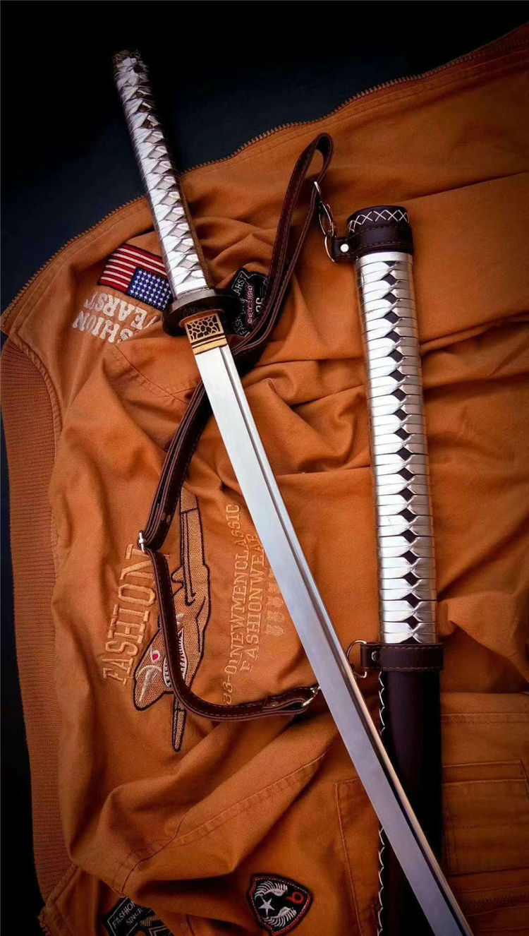 行尸走肉米琼恩武士刀 全长:104cm 刃长:72cm 材质:高锰钢锻造 手工开槽,研磨开刃,配石纹刀镞,刀鞘为实木裹皮,刀柄缠绳,合金配饰