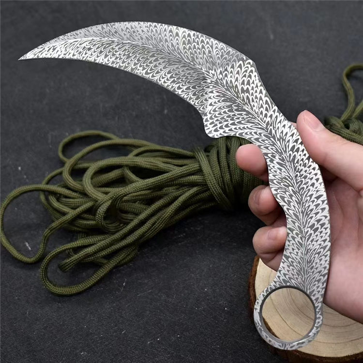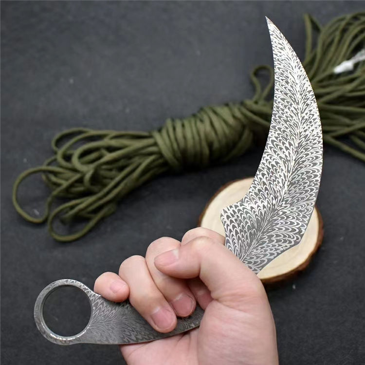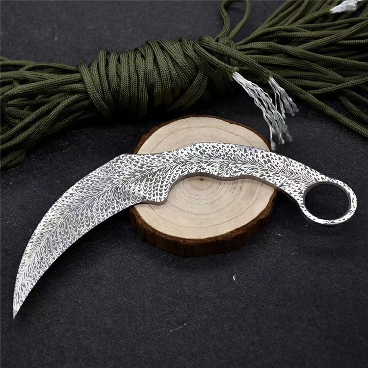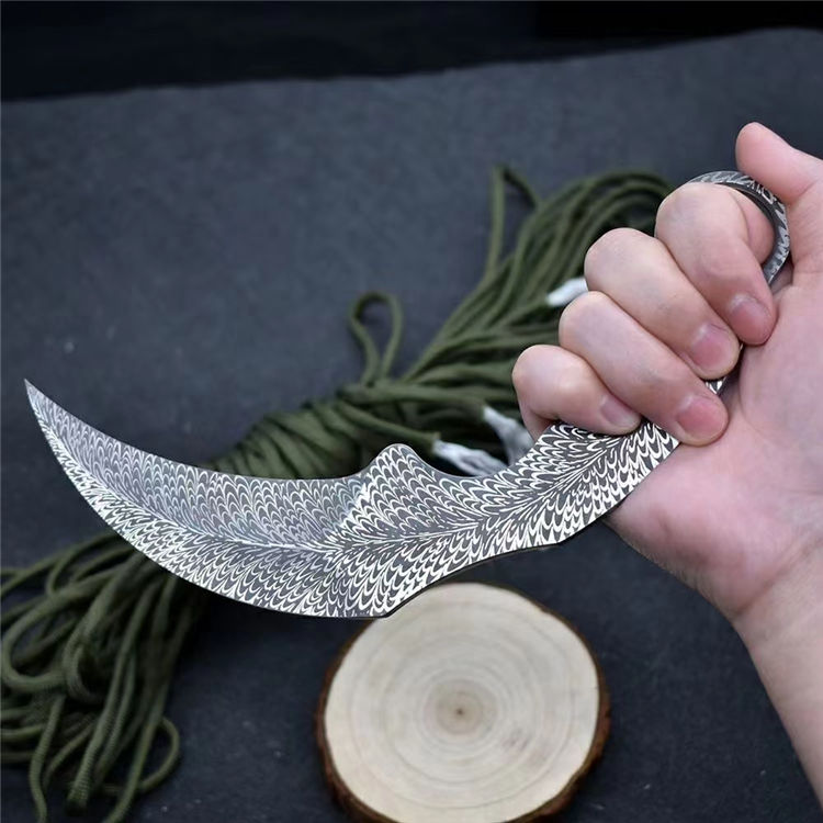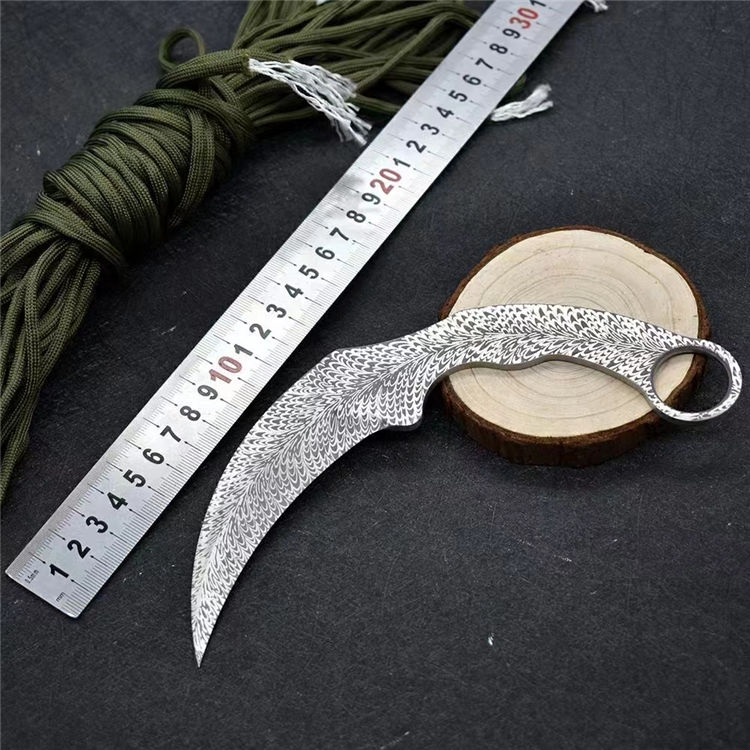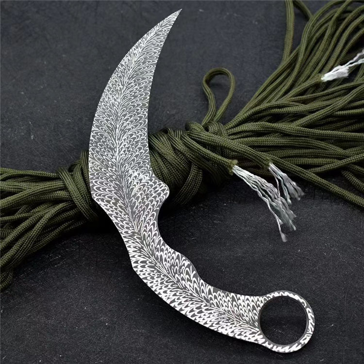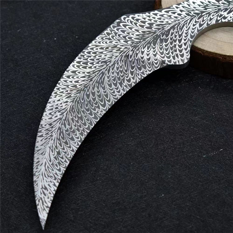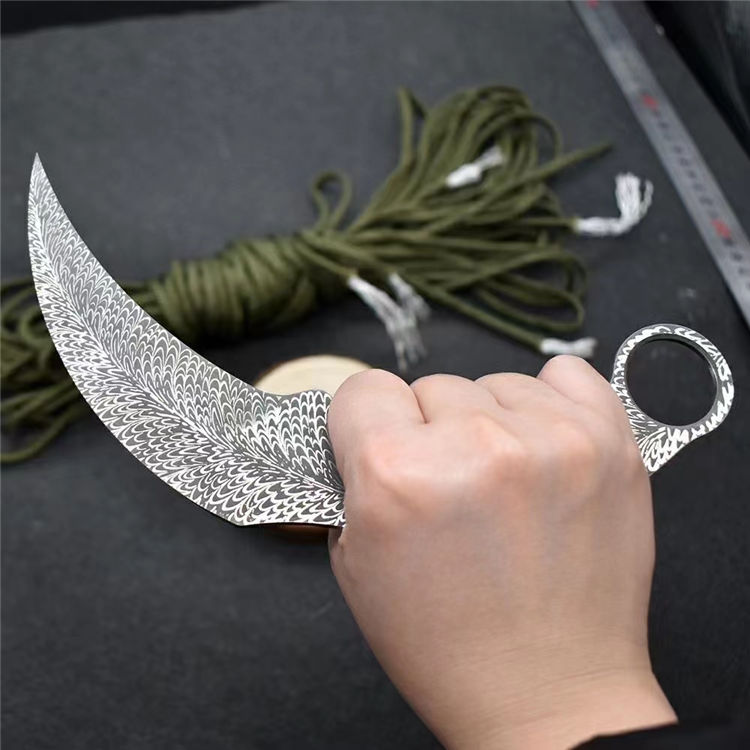 羽毛纹训练爪 全长:19.8cm 刃长:10.5cm 刃材:420不锈钢 柄长:9.3cm 硬度:58HRC 刃厚:3.8mm 重量:115g(单刀)
