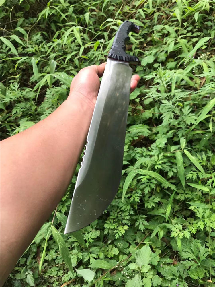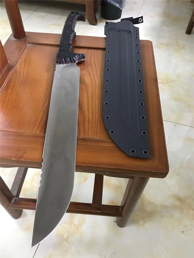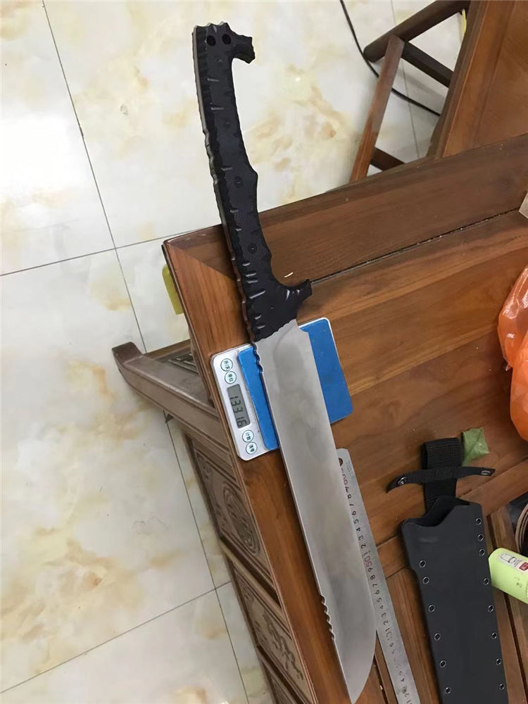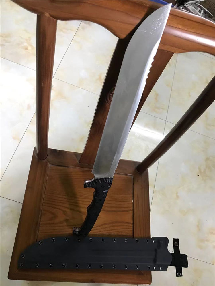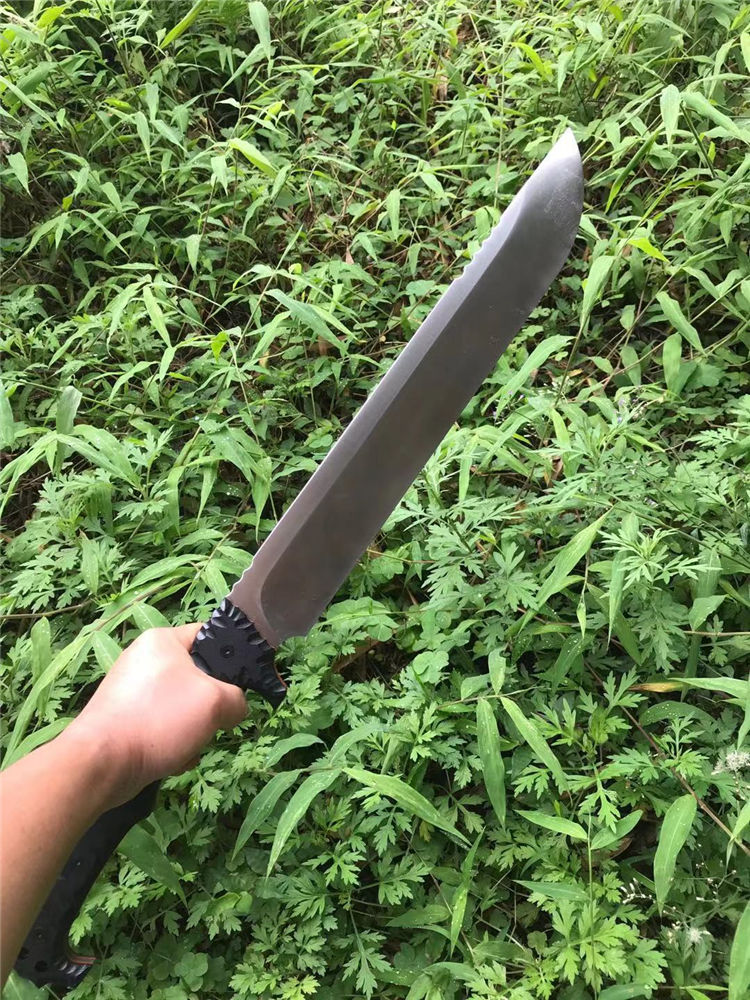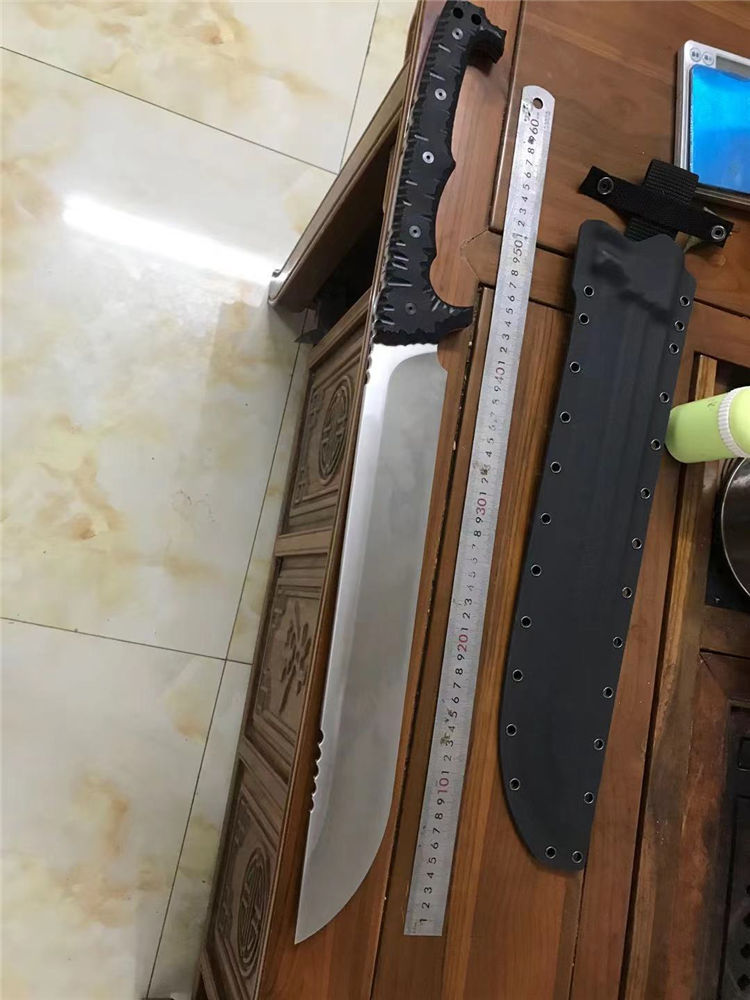 野牛双手屠龙开山刀 全长:670mm 刃长:400mm 刃宽:59mm 柄长:270mm 刃厚:6.0mm 材质:DC53(经过暴力测试。热处理性能成熟稳定) 硬度:59 表面处理:精磨钢本 手柄:龙骨黑色G10 刀身:CNC精工+数控V磨 刀鞘:美产进口2.0K鞘