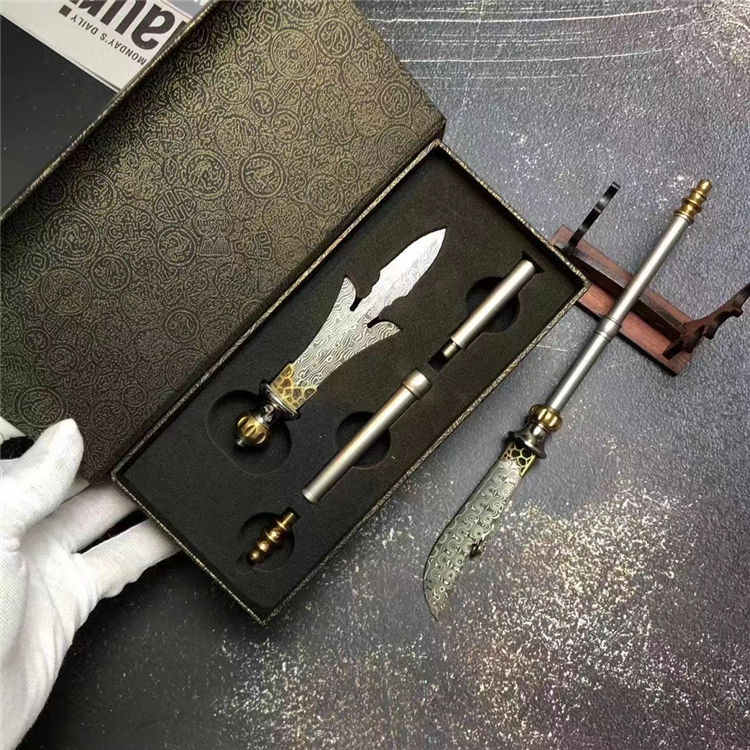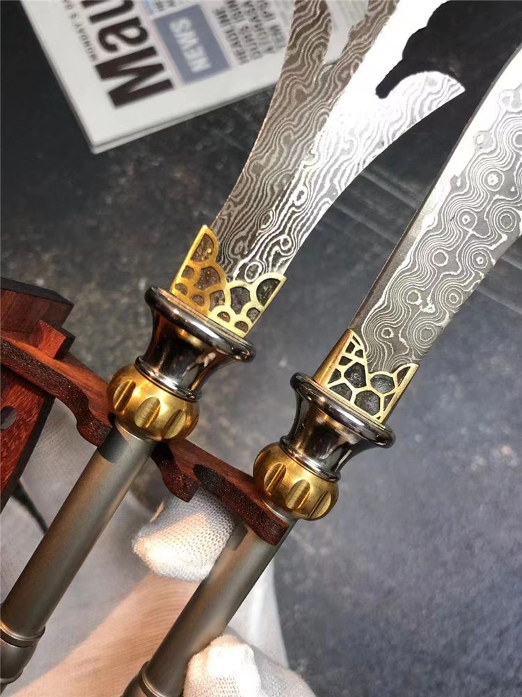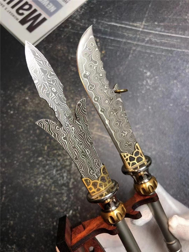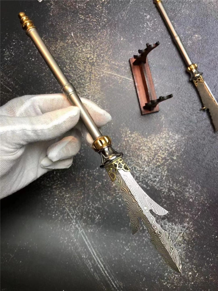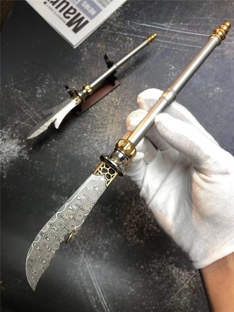 大马士革小关刀/三叉戟迷你版 总长:24cm 刃长:9cm 柄长:16cm 刃宽:2cm 厚度:2.5mm 钢材:进口锻造大马士革钢(68层)祥云纹理 表面:原大马士革花纹 硬度:60HRC 柄材:不锈钢档手+纯黄铜轴承结构+钛合金手柄 包装:高级手工木盒+手工小刀架 镇店镇宅小宝物,家居办公摆设,具有招财辟邪作用,勇猛威武谁敢当,斜影跨下云中月,青龙刀盖世无双,国内知名大师制作