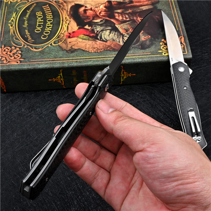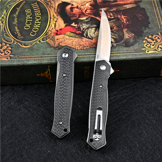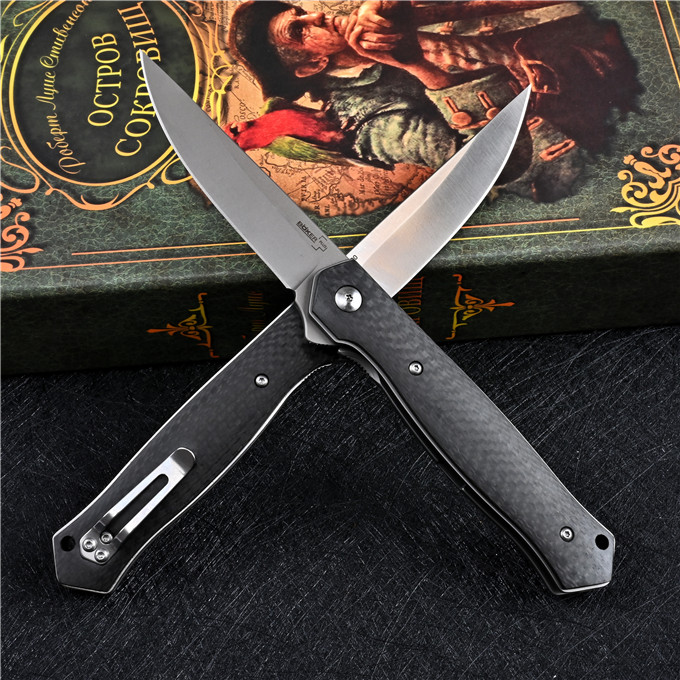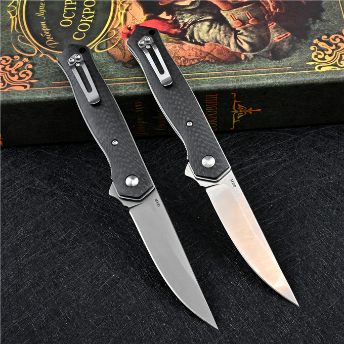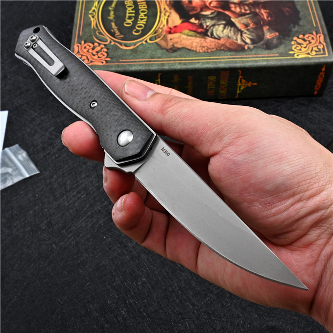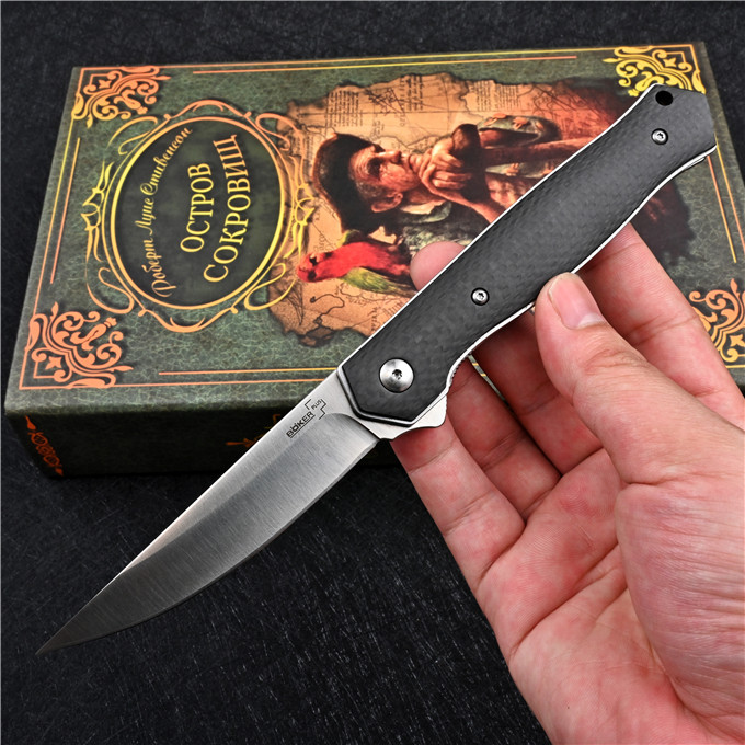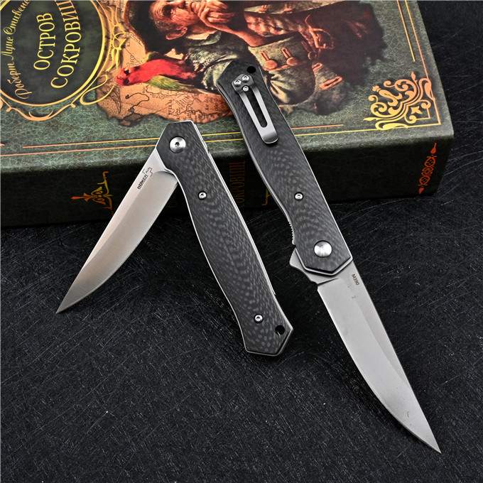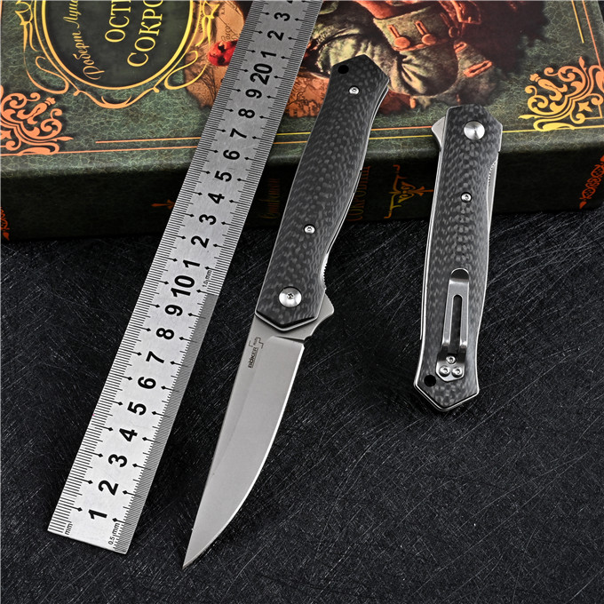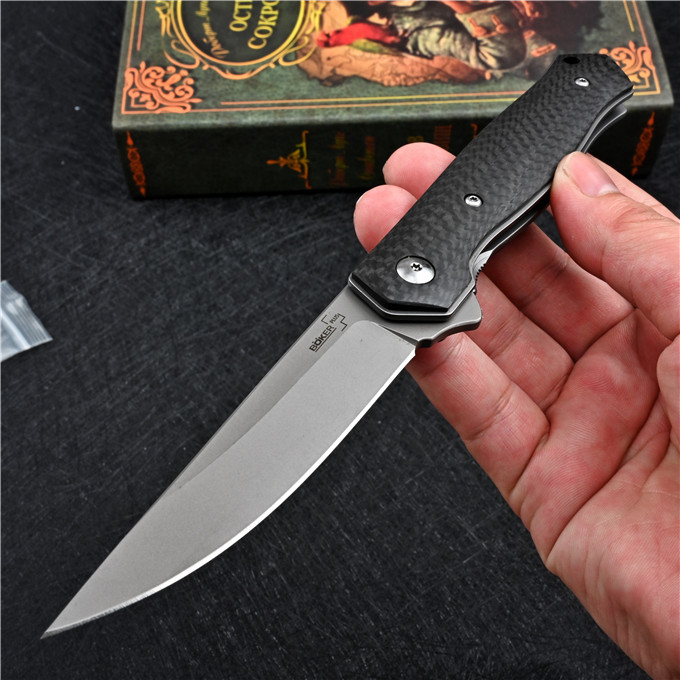 M390博克BOKER必杀折刀 全长:21.3cm 刃长:8.7cm 柄长:12.3cm 刃厚:0.3cm 刃宽:2.1cm 刃材:M390 柄材:碳纤维 硬度:60-61HRC 表面处理:砂光或镀钛 净重:110g