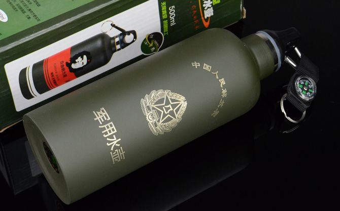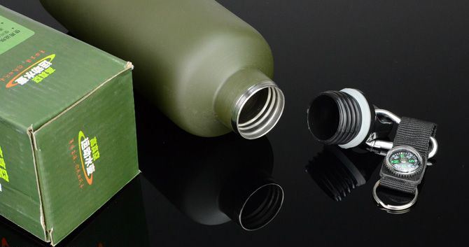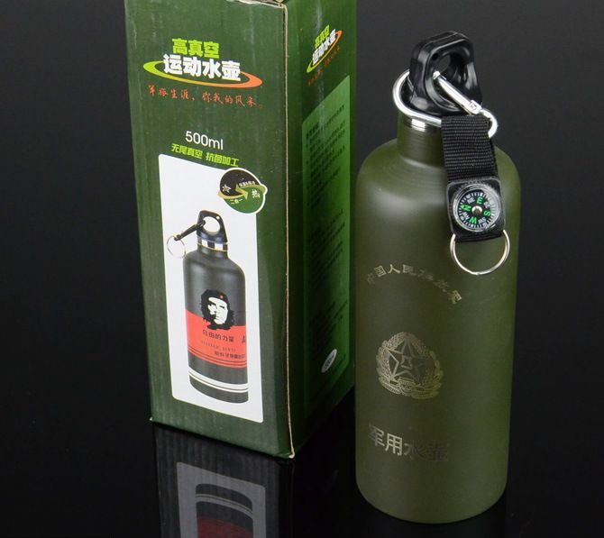 军用水壶(真空保温) 名称:真空保温运动水壶 材质:永不生锈的食品级优质不锈钢双层真空内胆,食品级塑料配件,采用耐高温、无毒、抗菌、耐冲击等新型材料技术,时刻呵护您的健康。 表面:采用进口烤漆工艺,明快的色彩搭配,带给你对美好军绿生活的无限遐想。 特点:独特的可挂式设计,携带方便实用。 保温时间;10个小时左右 使用说明:详见外包装 注意事项:详见外包装 尺寸: 高:22.5cm 直径:7.1cm 容量:500毫升 净重:290克 毛重:339克 包装:彩盒 备注:带有登山扣、钥匙圈、指南针。