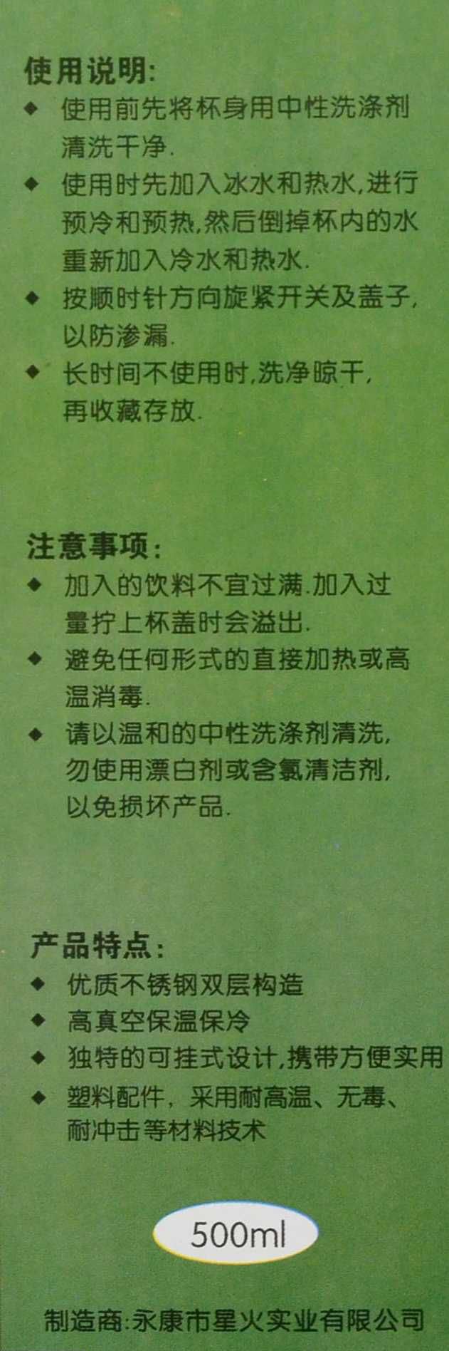 名称:真空保温运动水壶 材质:永不生锈的食品级优质不锈钢双层真空内胆,食品级塑料配件,采用耐高温、无毒、抗菌、耐冲击等新型材料技术,时刻呵护您的健康。 表面:采用进口烤漆工艺,明快的色彩搭配,带给你对美好军绿生活的无限遐想。 特点:独特的可挂式设计,携带方便实用。 保温时间;10个小时左右 使用说明:详见外包装 注意事项:详见外包装