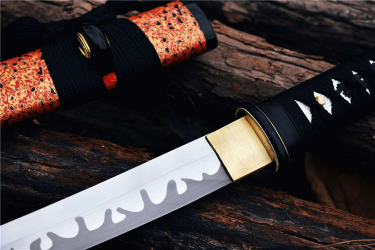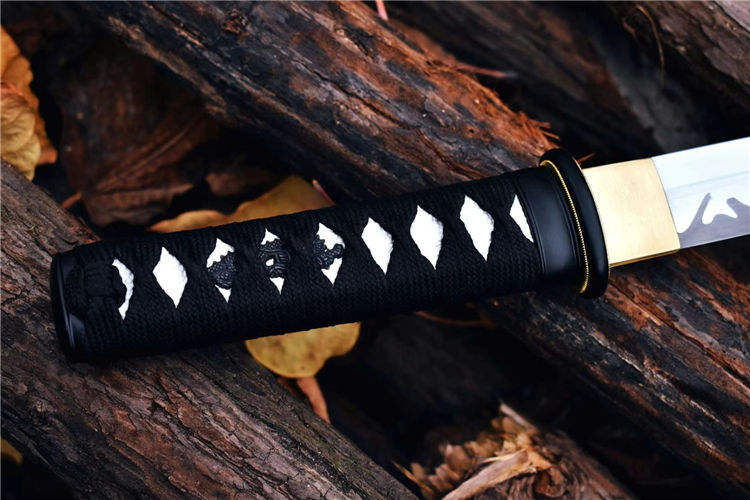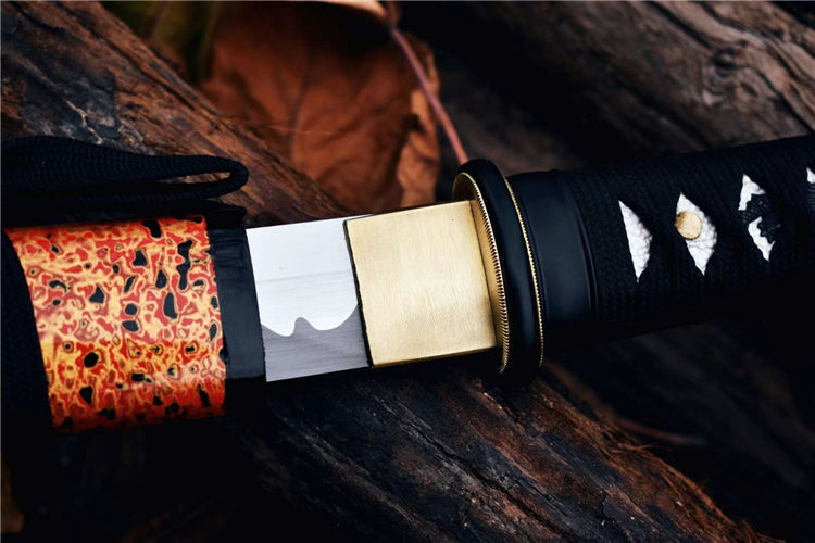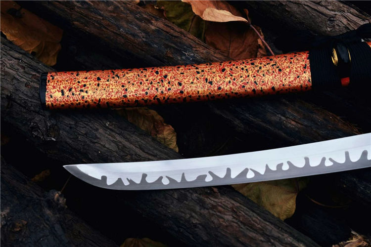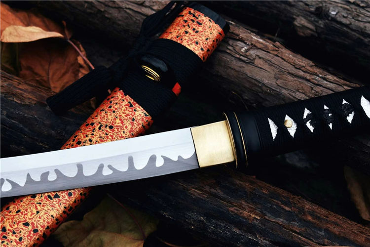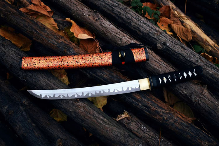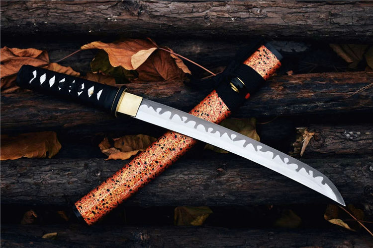 樱花肋差武士刀 全长:52.5cm 刃长:29.7cm 刀身:材料1055锻造 手工研磨,高性能,配纯铜刀镞,全铁装具,手工大漆鞘,柄缠绳,居家把玩收藏