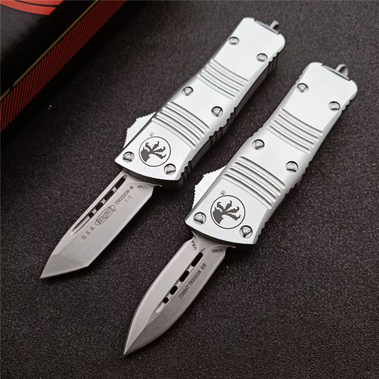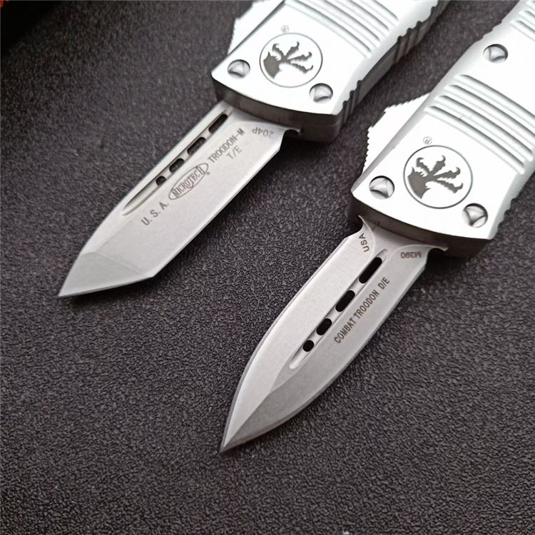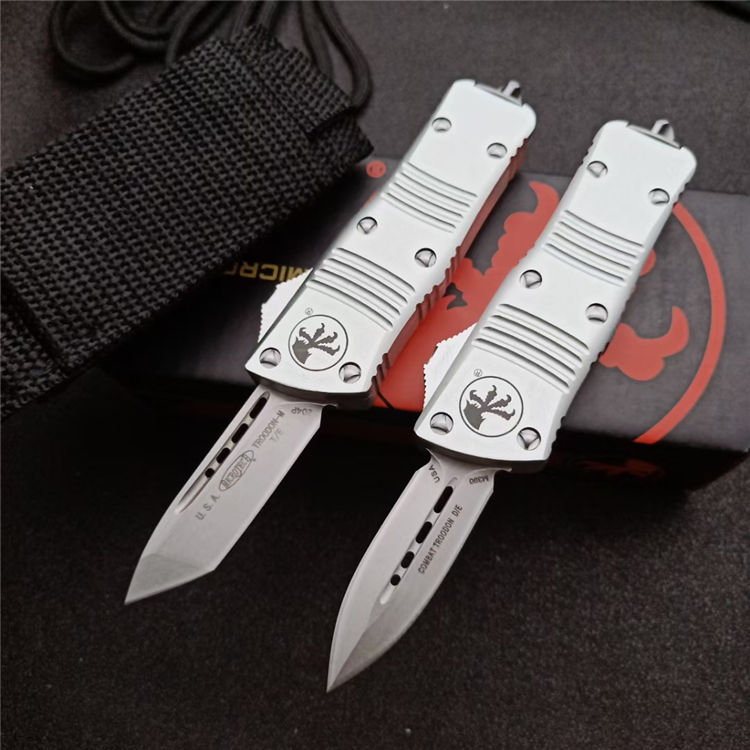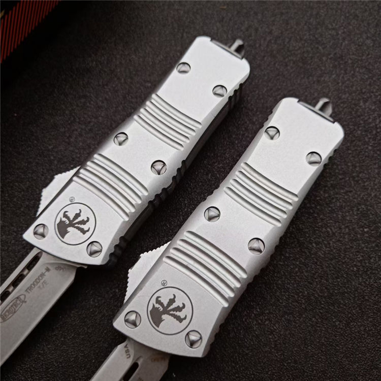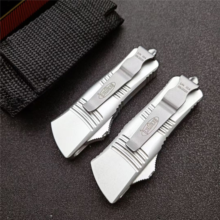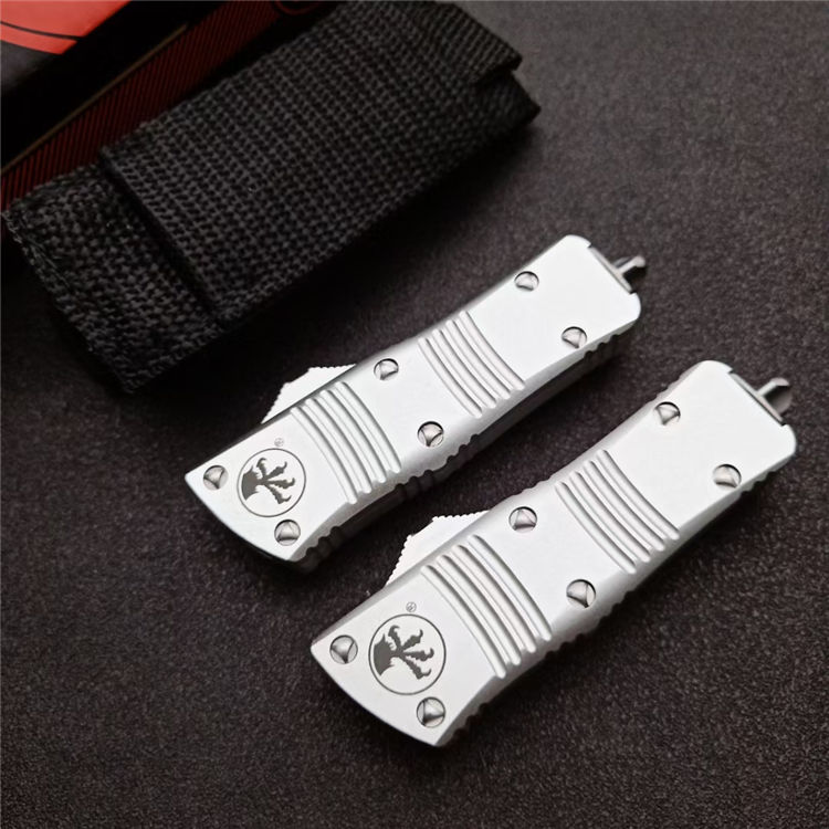 微技术迷你伤齿龙直出跳刀 全长:13.8cm 刃长:5cm 柄长:8cm 刃宽:15.5mm 刃厚:3.1mm 刃材:D2 柄材:铝合金 净重:69克