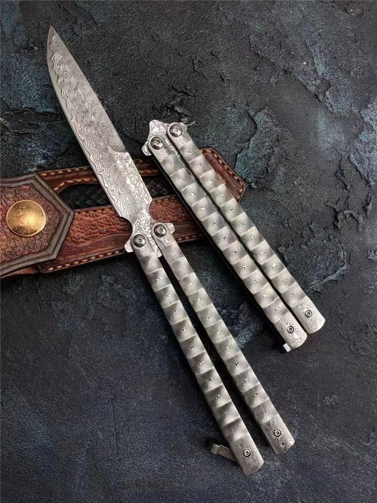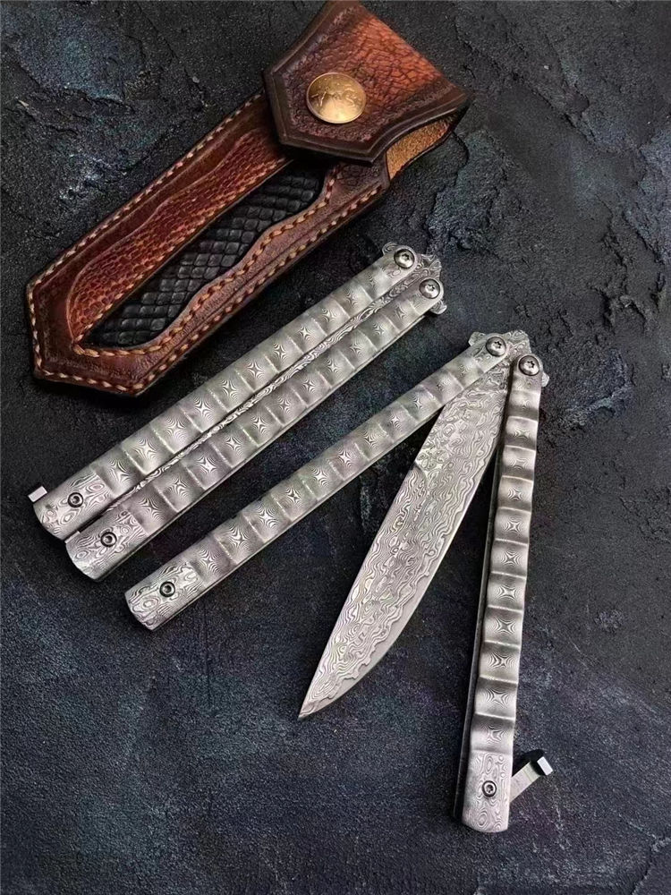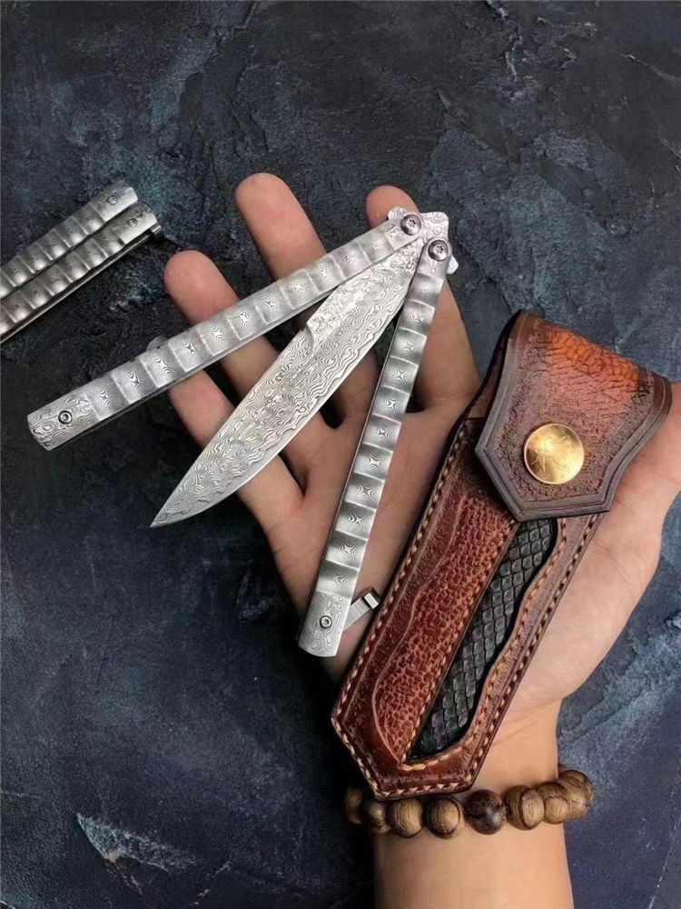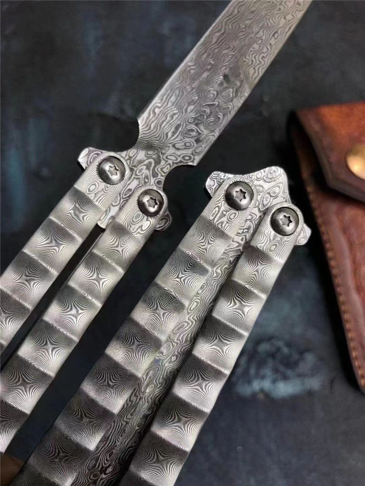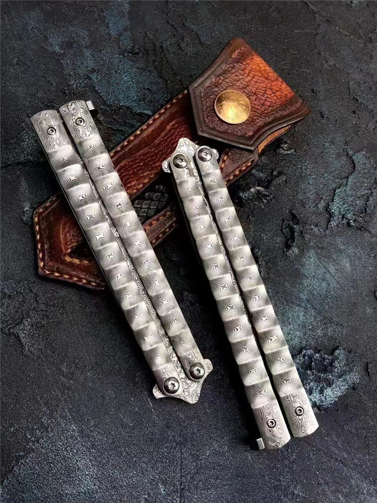 大马士革钢侠二代蝴蝶甩刀 总长:23.6cm 刃长:10cm 折合:13.6cm 刃厚:3.5mm 刃宽:1.9cm 钢材:进口手工锻造大马士革钢VG10钢,耐绣性好,花纹清晰 硬度:60HRC 热处理:真空深冷热处理,回火处理,保持韧性 研磨方式:数控单面磨CNC 开刃方式:手工水冷多次开刃 皮套:意大利进口手工制作雕花缝线真皮套 包装:手工盒子简包